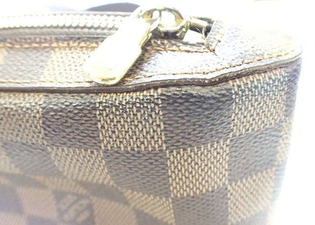 One Louis Vuitton Damier Ebene Canvas Geronimos Waist Bag. Item is sold AS-IS. All available information is listed in the description and shown in the photo. Brown Damier Ebene coated canvas Louis Vuitton Geronimos waist bag with brass hardware, single adjustable waist strap with buckle closure, single pocket at exterior with snap closure, brown canvas lining and zip around closure..