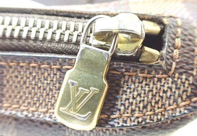 One Louis Vuitton Damier Ebene Canvas Geronimos Waist Bag. Item is sold AS-IS. All available information is listed in the description and shown in the photo. Brown Damier Ebene coated canvas Louis Vuitton Geronimos waist bag with brass hardware, single adjustable waist strap with buckle closure, single pocket at exterior with snap closure, brown canvas lining and zip around closure..