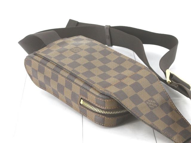 One Louis Vuitton Damier Ebene Canvas Geronimos Waist Bag. Item is sold AS-IS. All available information is listed in the description and shown in the photo. Brown Damier Ebene coated canvas Louis Vuitton Geronimos waist bag with brass hardware, single adjustable waist strap with buckle closure, single pocket at exterior with snap closure, brown canvas lining and zip around closure..