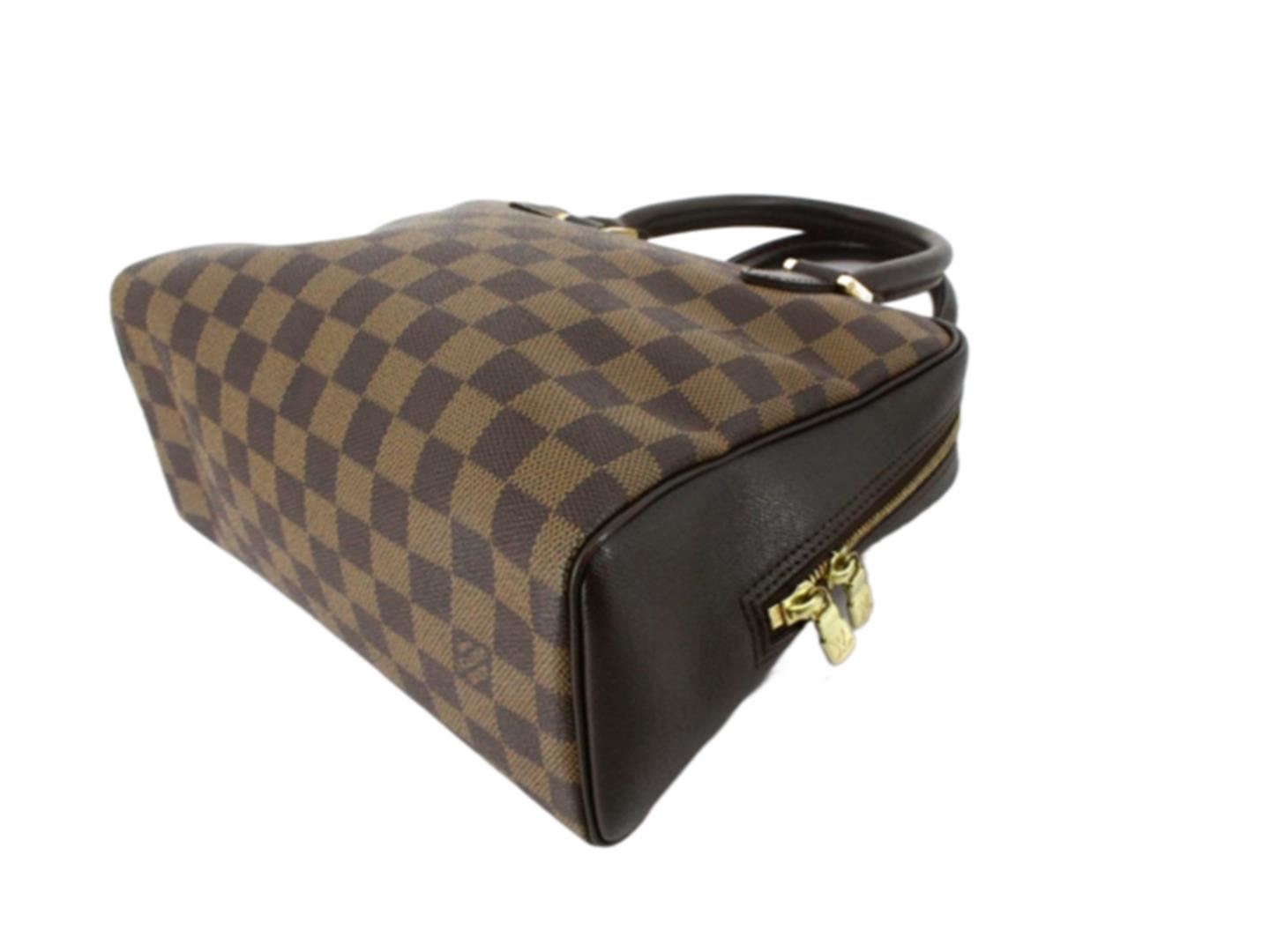 Louis Vuitton Damier Ebene Canvas Leather Brera Handbag. All available information is listed in the description and shown in the photos. Brown Damier Ebene coated canvas Louis Vuitton Brera handbag with gold-tone hardware, dark brown Taiga leather trim, dual rolled top handles, red Alcantara lining, single pocket with zip closure at interior wall and zip closure at top. . 9.5"x4"x8"xBag Drop:4.25"/24.1cmx10.1cmx20.3cmxBag Drop:10.8cm