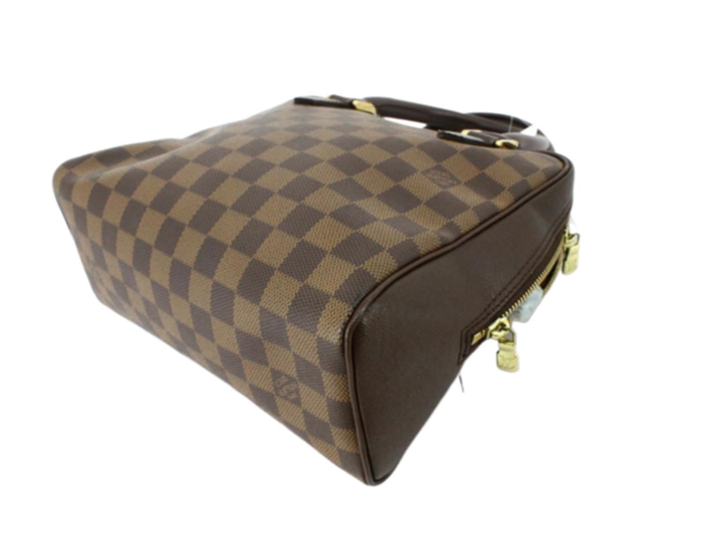 Louis Vuitton Damier Ebene Canvas Leather Brera Handbag. All available information is listed in the description and shown in the photos. Brown Damier Ebene coated canvas Louis Vuitton Brera handbag with gold-tone hardware, dark brown Taiga leather trim, dual rolled top handles, red Alcantara lining, single pocket with zip closure at interior wall and zip closure at top. . 9.5"x4"x8"xBag Drop:4.25"/24.1cmx10.1cmx20.3cmxBag Drop:10.8cm