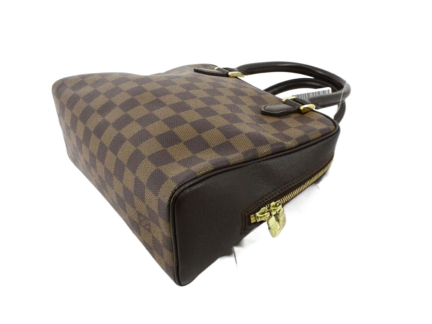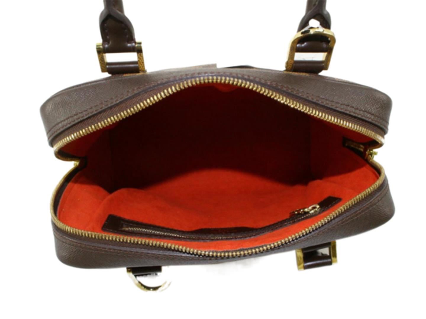 One Louis Vuitton Damier Ebene Canvas Leather Brera Handbag. Item is sold AS-IS. All available information is listed in the description and shown in the photo. Brown Damier Ebene coated canvas Louis Vuitton Brera handbag with gold-tone hardware, dark brown Taiga leather trim, dual rolled top handles, red Alcantara lining, single pocket with zip closure at interior wall and zip closure at top. . 9.5"x4"x8"xBag Drop:4.25"/24.1cmx10.1cmx20.3cmxBag Drop:10.8cm