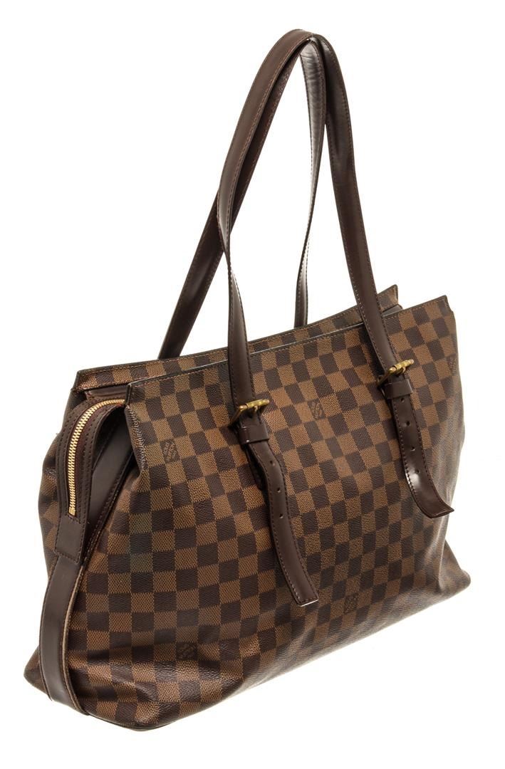 Louis Vuitton Damier Ebene Canvas Leather Chelsea Tote Bag. All available information is listed in the description and shown in the photos. Brown and tobacco Damier Ebene coated canvas Louis Vuitton Chelsea tote bag with gold-tone hardware, brown leather accents, dual flat shoulder straps, red canvas interior, single zip pocket at interior wall and zip closure at top. 16.5"x5.5"x10.5"xBag Drop:12.25"/41.9cmx13.9cmx26.6cmxBag Drop:31.1cm