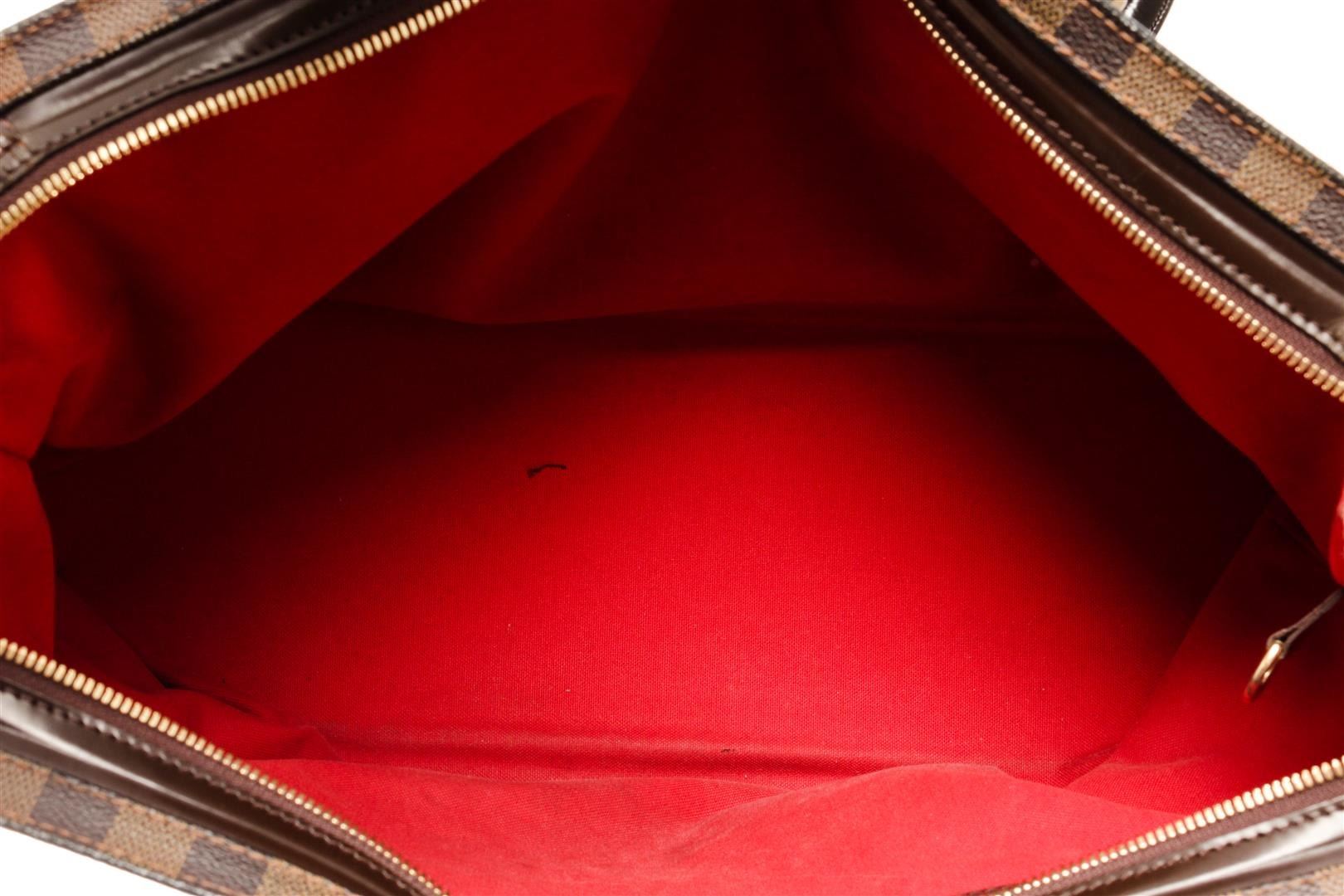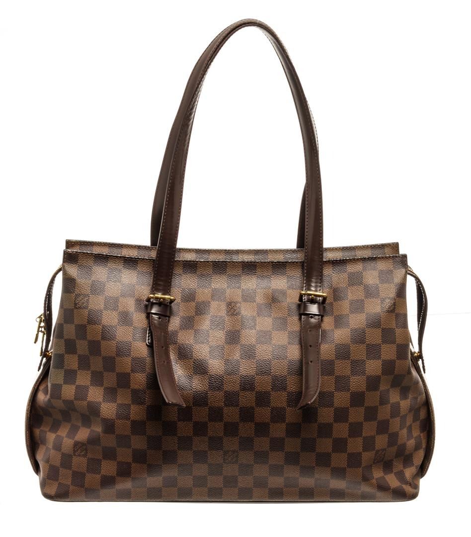 Louis Vuitton Damier Ebene Canvas Leather Chelsea Tote Bag. All available information is listed in the description and shown in the photos. Brown and tobacco Damier Ebene coated canvas Louis Vuitton Chelsea tote bag with gold-tone hardware, brown leather accents, dual flat shoulder straps, red canvas interior, single zip pocket at interior wall and zip closure at top. 16.5"x5.5"x10.5"xBag Drop:12.25"/41.9cmx13.9cmx26.6cmxBag Drop:31.1cm