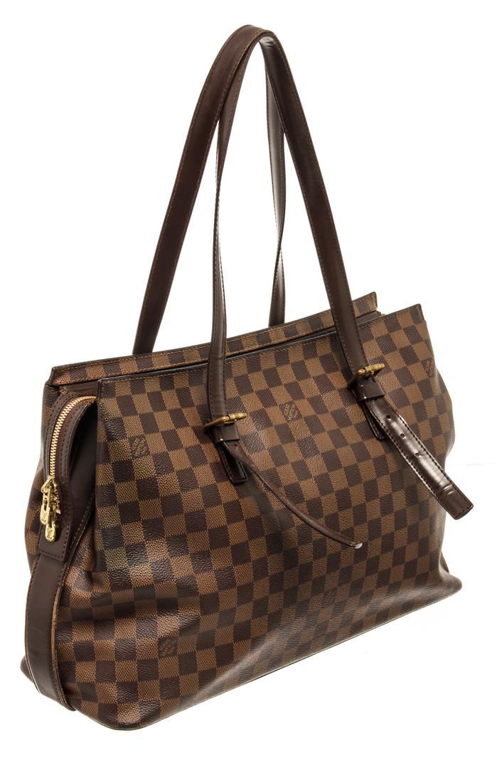 Louis Vuitton Damier Ebene Canvas Leather Chelsea Tote Bag. All available information is listed in the description and shown in the photos. Brown and tobacco Damier Ebene coated canvas Louis Vuitton Chelsea tote bag with gold-tone hardware, brown leather accents, dual flat shoulder straps, red canvas interior, single zip pocket at interior wall and zip closure at top. 16.5"x5.5"x10.5"xBag Drop:12.25"/41.9cmx13.9cmx26.6cmxBag Drop:31.1cm