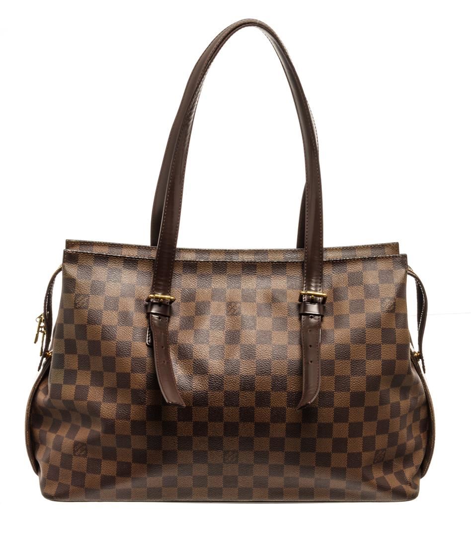 Louis Vuitton Damier Ebene Canvas Leather Chelsea Tote Bag. All available information is listed in the description and shown in the photos. Brown and tobacco Damier Ebene coated canvas Louis Vuitton Chelsea tote bag with gold-tone hardware, brown leather accents, dual flat shoulder straps, red canvas interior, single zip pocket at interior wall and zip closure at top.          16.5"x5.5"x10.5"xBag Drop:12.25"/41.9cmx13.9cmx26.6cmxBag Drop:31.1cm