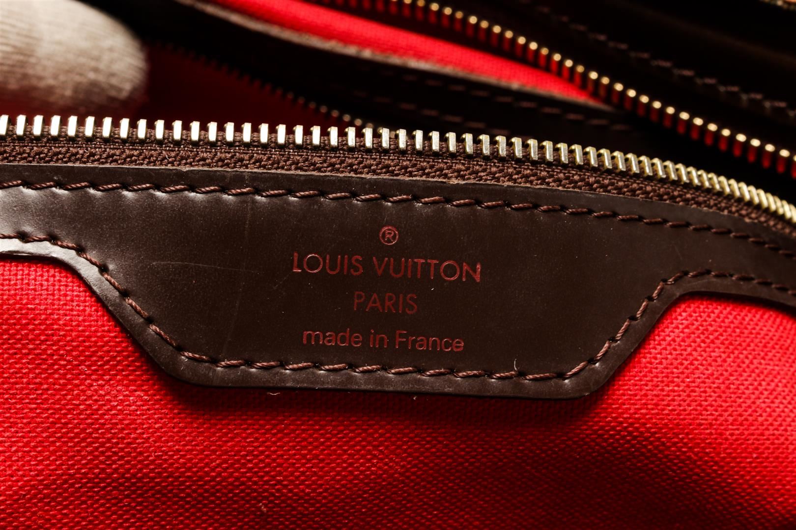 Louis Vuitton Damier Ebene Canvas Leather Chelsea Tote Bag. All available information is listed in the description and shown in the photos. Brown and tobacco Damier Ebene coated canvas Louis Vuitton Chelsea tote bag with gold-tone hardware, brown leather accents, dual flat shoulder straps, red canvas interior, single zip pocket at interior wall and zip closure at top. 16.5"x5.5"x10.5"xBag Drop:12.25"/41.9cmx13.9cmx26.6cmxBag Drop:31.1cm