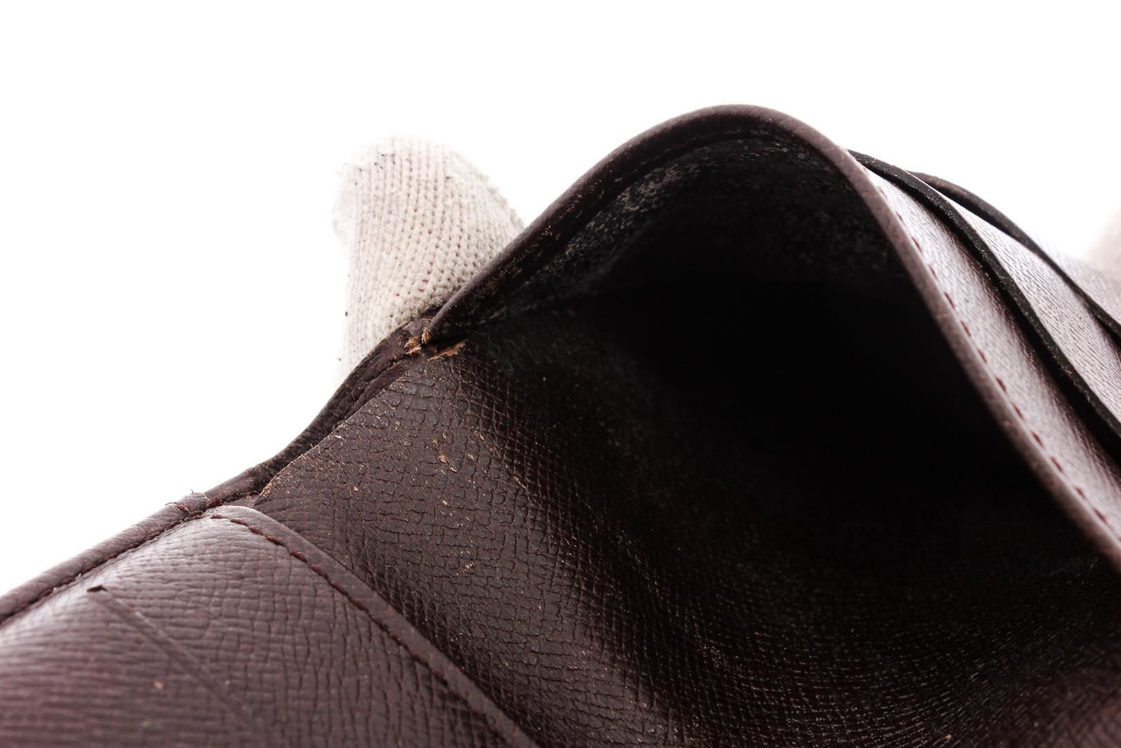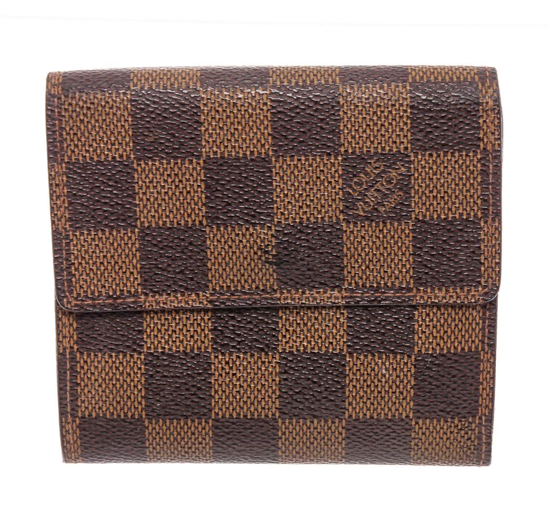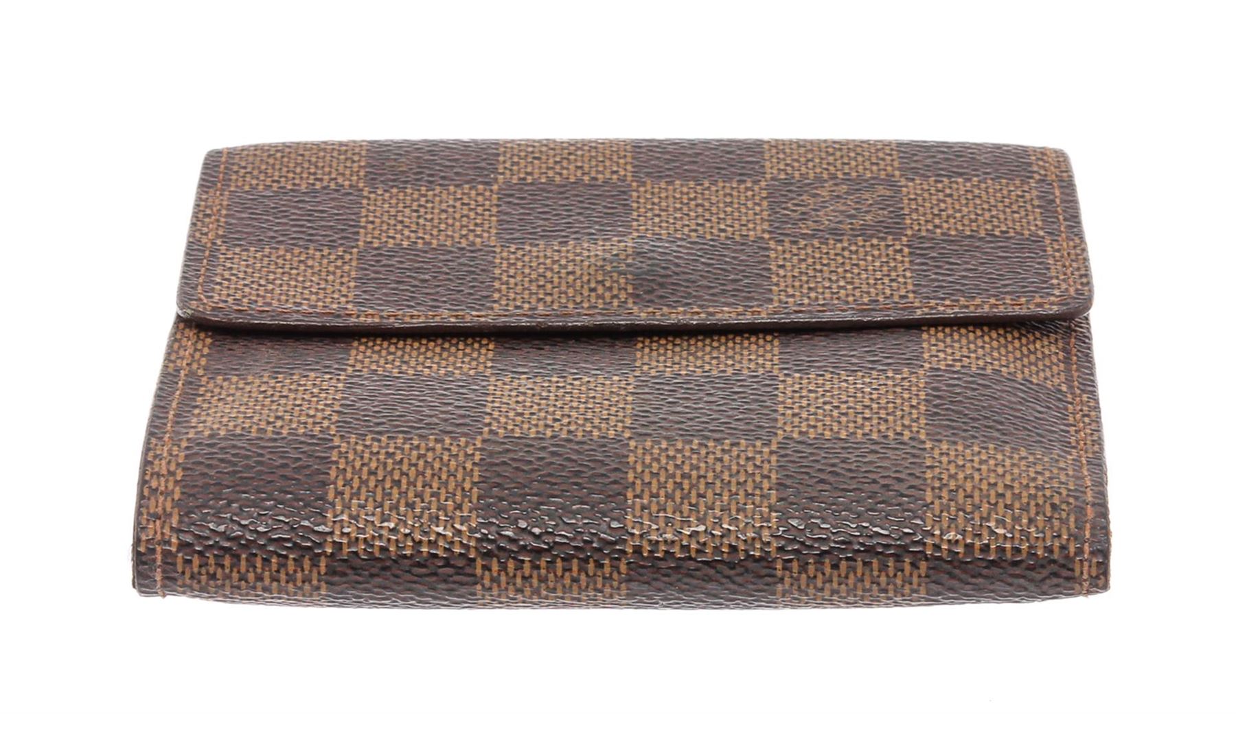 Brown and tan Damier Ebene coated canvas Louis Vuitton Elise wallet with brass hardware, dual exterior compartments, brown coated canvas lining, single bill compartment, dual slit pockets, four card slots and snap closure at front.