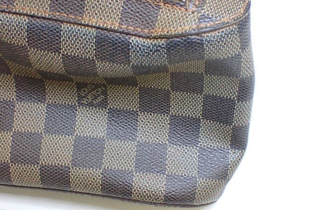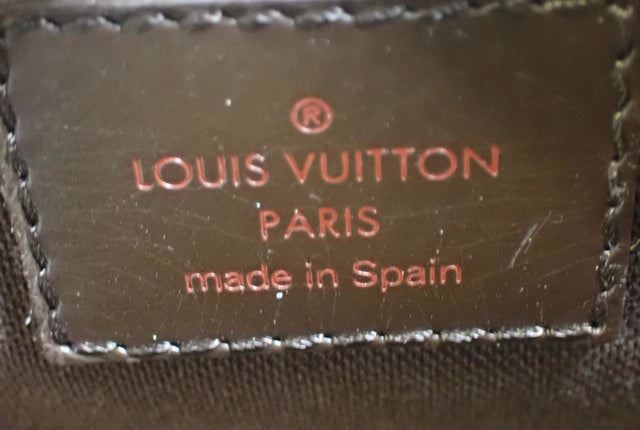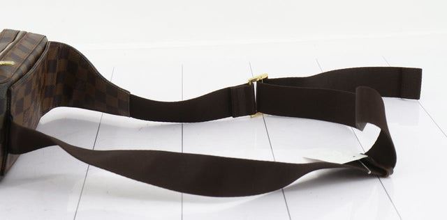 One Louis Vuitton Damier Ebene Canvas Leather Geronimos Waist Bag. Item is sold AS-IS. All available information is listed in the description and shown in the photo. Brown and tobacco Damier Ebene coated canvas Louis Vuitton Geronimos waist bag with gold-tone hardware, single adjustable waist strap with buckle closure, single pocket at exterior with snap closure, dark brown canvas lining and zip around closure. 7.5"x1.75"x5.75"xBag Drop:44"/19cmx4.4cmx14.6cmx111.7cm