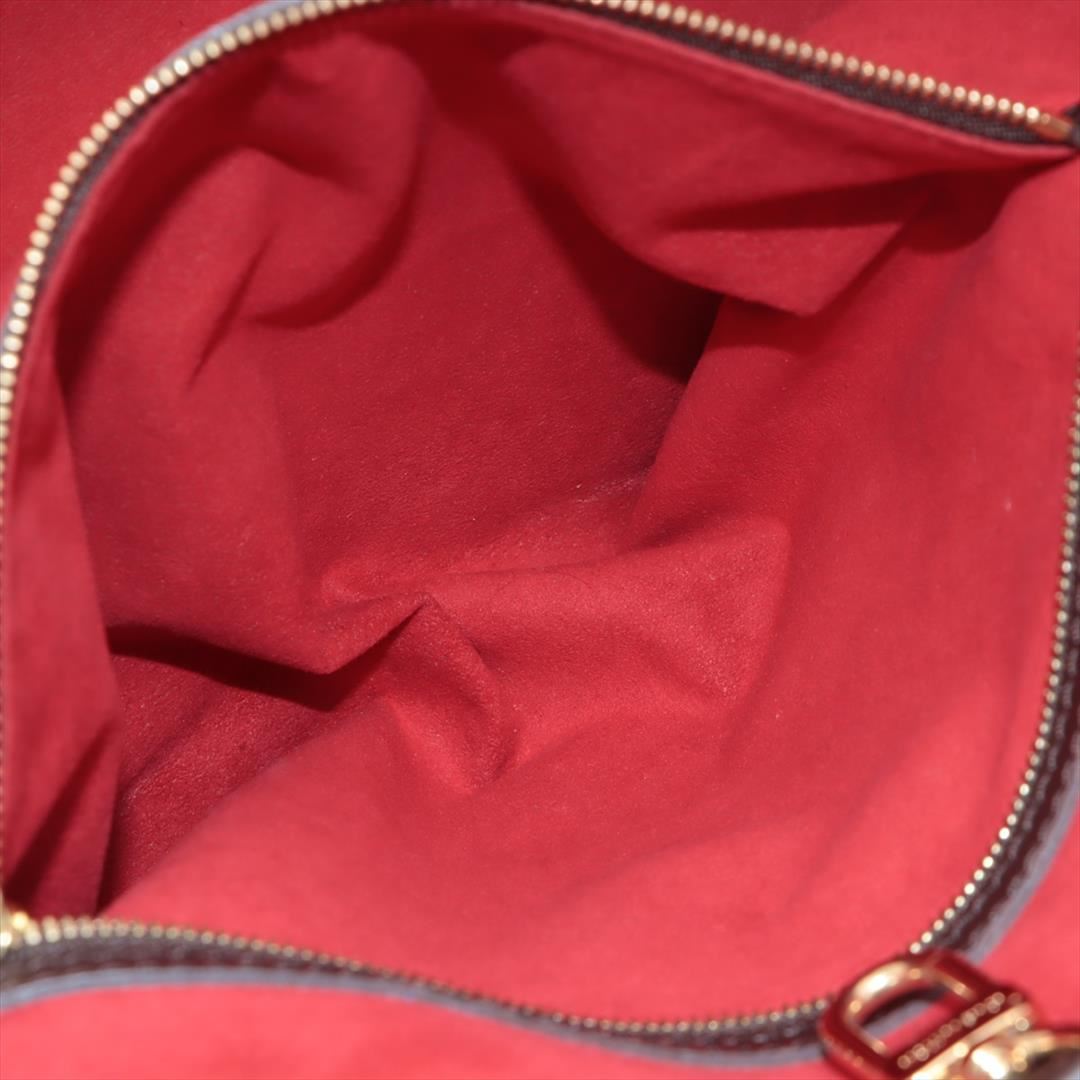 Brown Damier Ebene coated canvas Louis Vuitton Hampstead PM with gold-tone hardware, dark brown leather trim, dual flat shoulder straps, logo placard at front face, red Alcantara lining, three pockets at interior walls; one with zip closure and clasp clos
