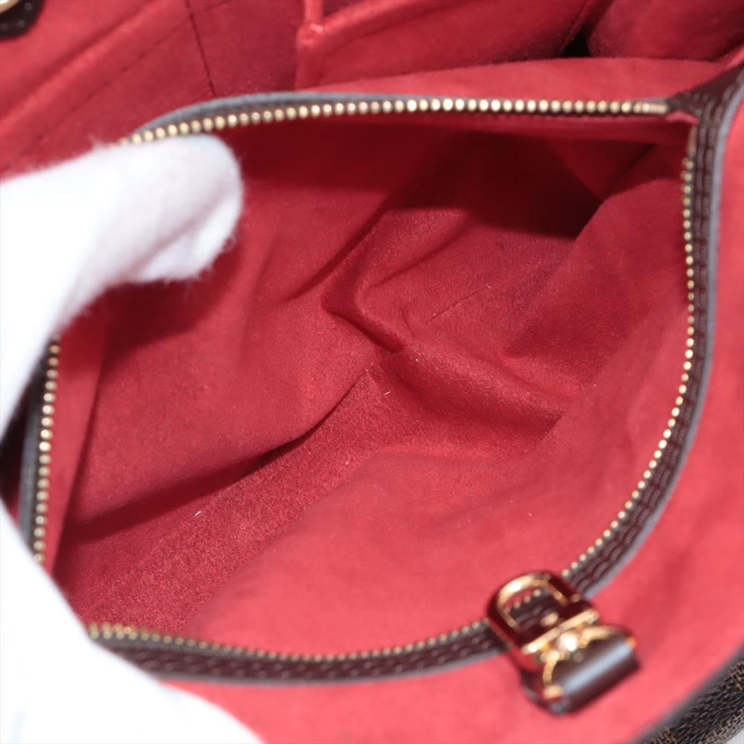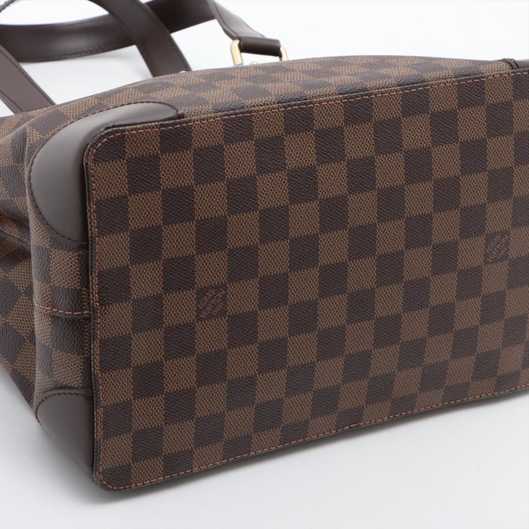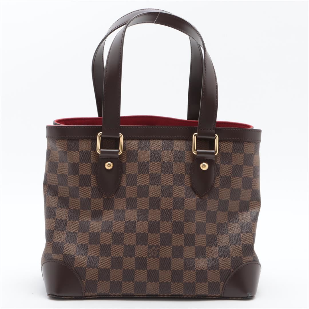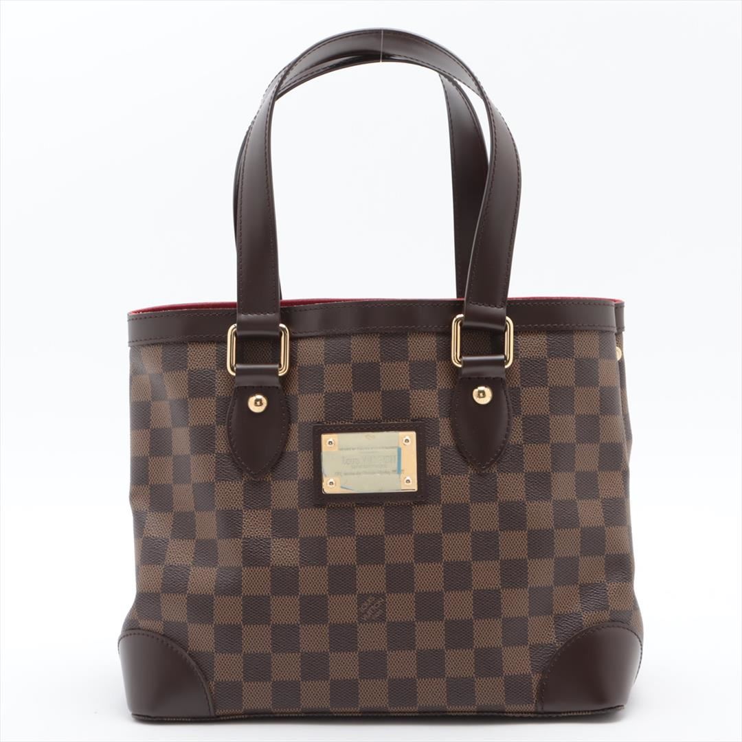 Brown Damier Ebene coated canvas Louis Vuitton Hampstead PM with gold-tone hardware, dark brown leather trim, dual flat shoulder straps, logo placard at front face, red Alcantara lining, three pockets at interior walls; one with zip closure and clasp clos