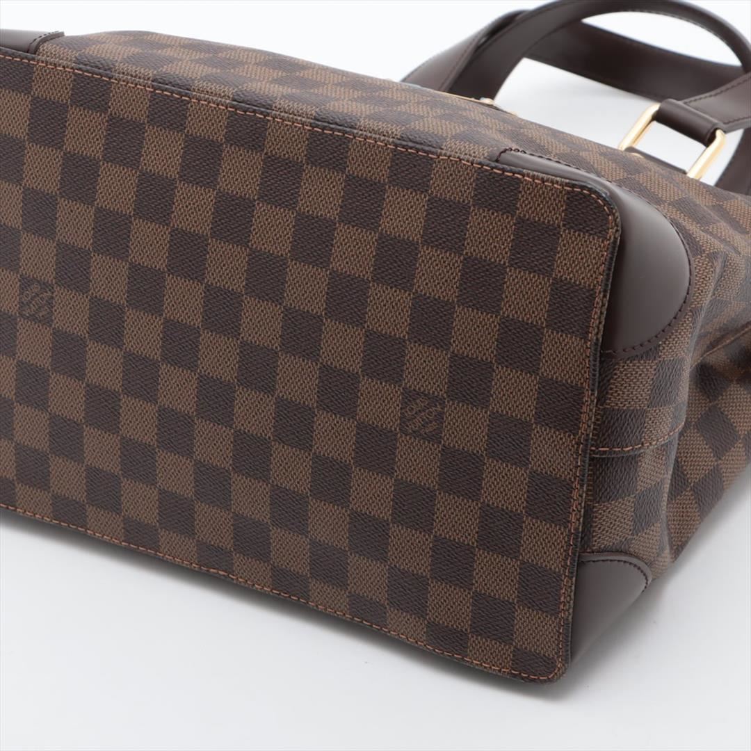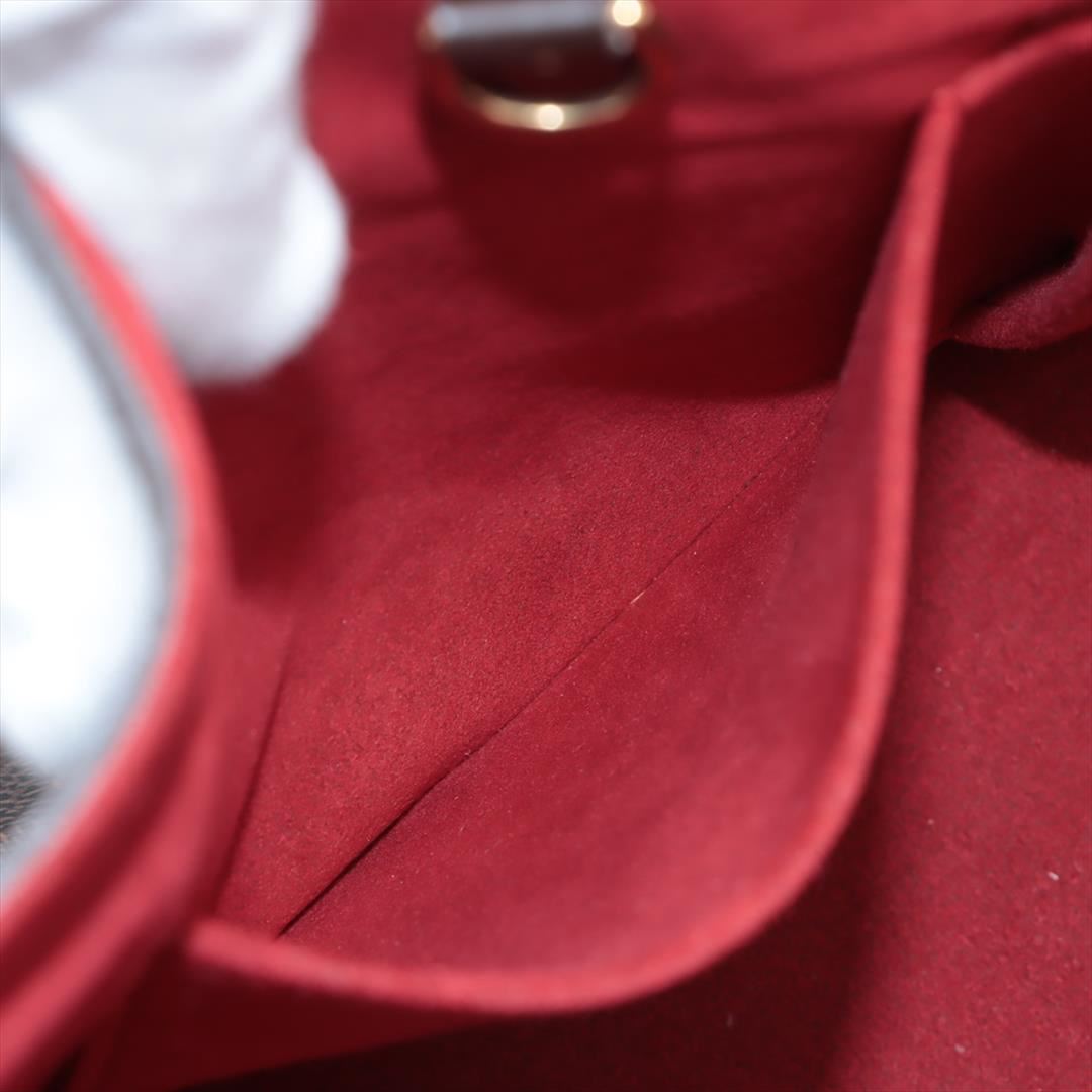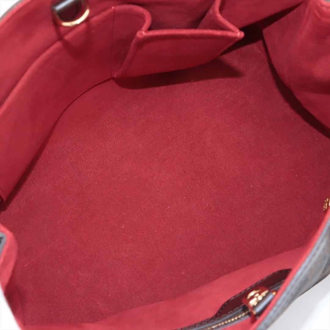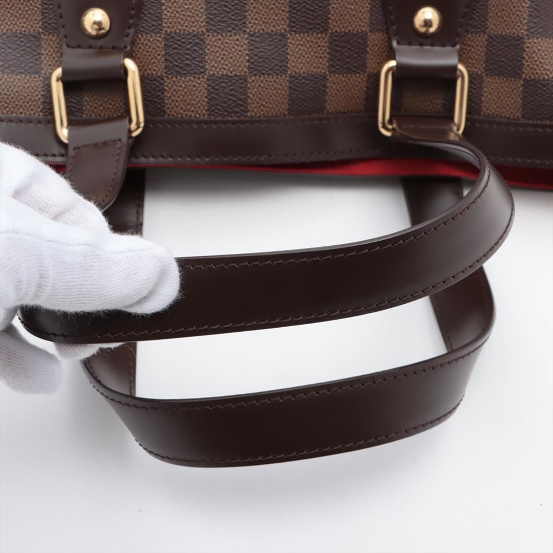 Brown Damier Ebene coated canvas Louis Vuitton Hampstead PM with gold-tone hardware, dark brown leather trim, dual flat shoulder straps, logo placard at front face, red Alcantara lining, three pockets at interior walls; one with zip closure and clasp clos