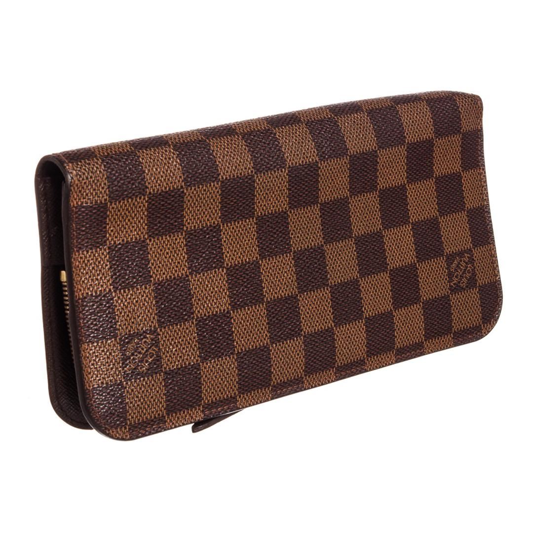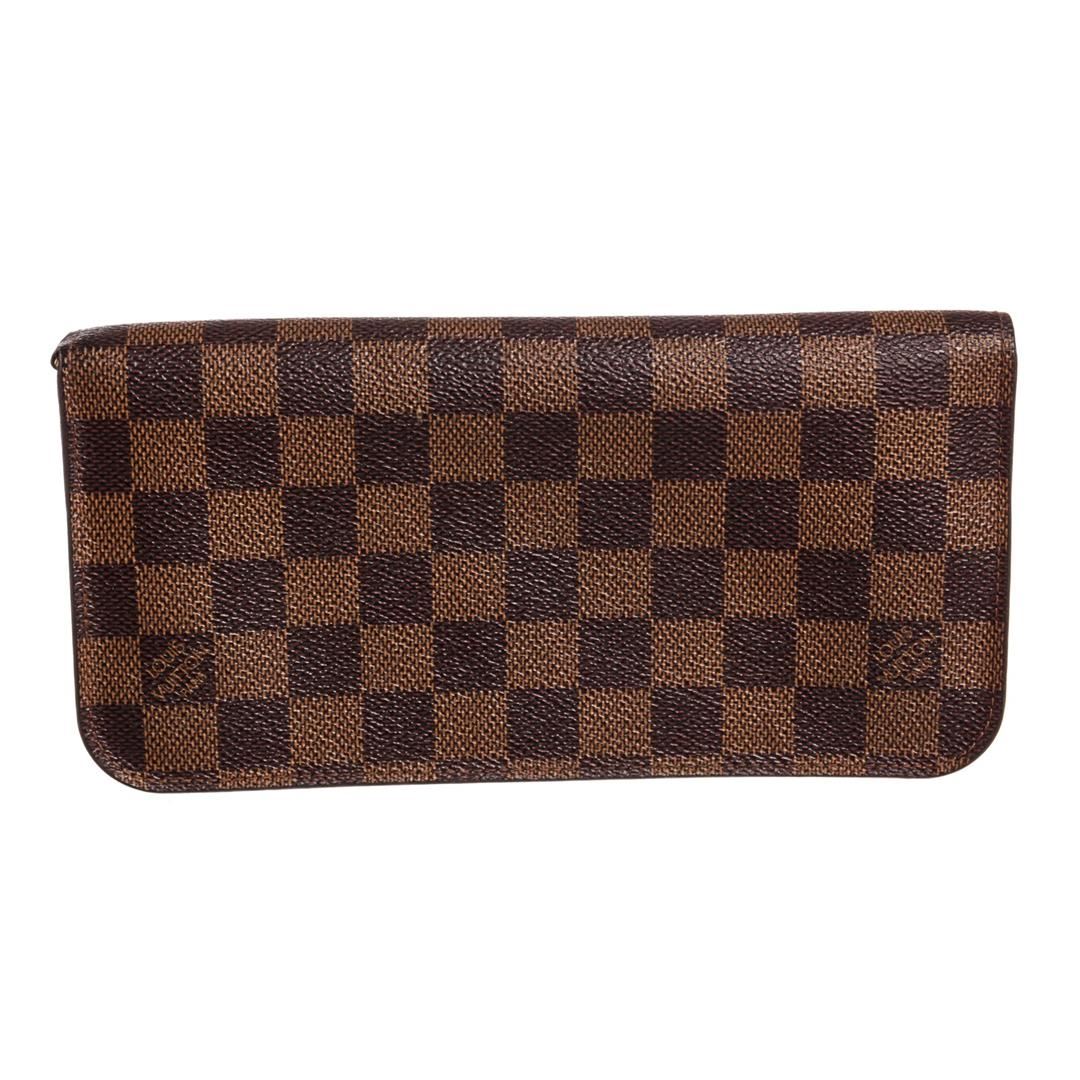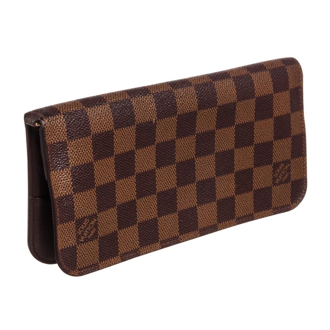 Brown and tan Damier Ebene coated canvas Louis Vuitton Insolite wallet with brass hardware, walnut leather lining, dual interior zip compartments, three bill compartments, 12 card slots and dual snap closures at front. Dimensions = 8.5"x.75"x4.5"/21.59cmx1.90cmx11.43cm. Item is pre-owned.