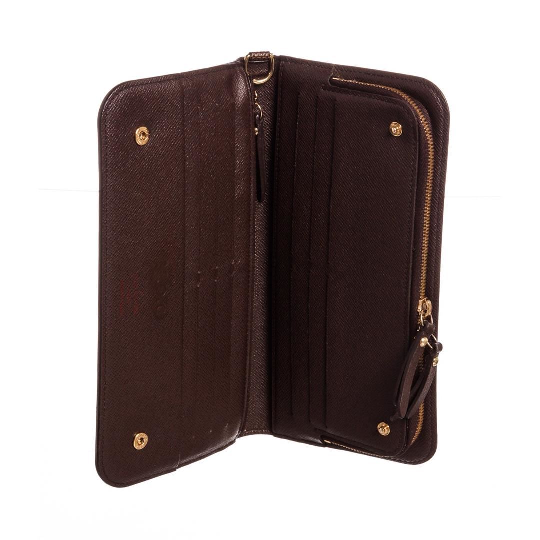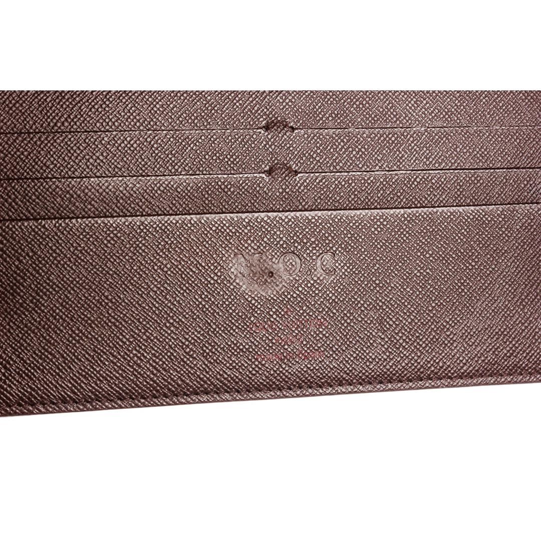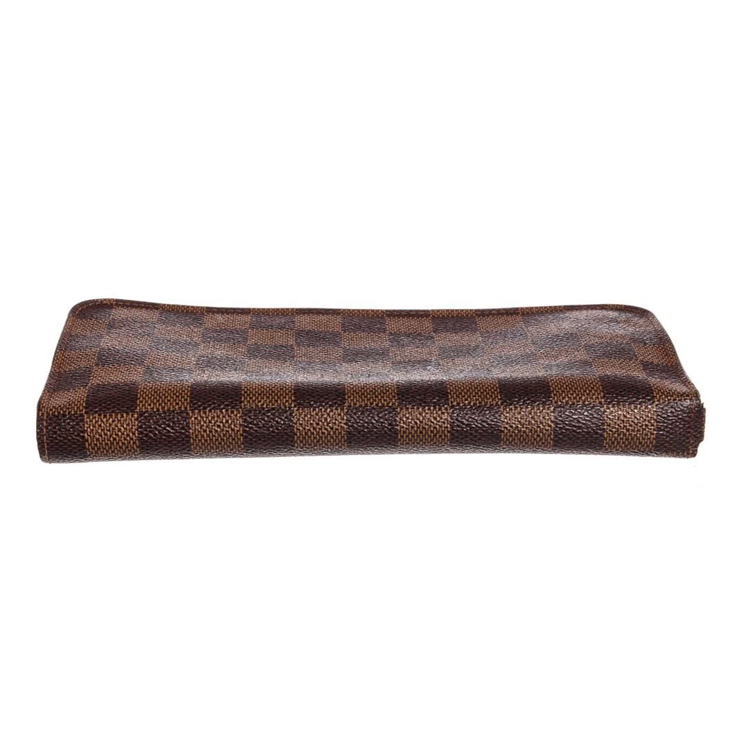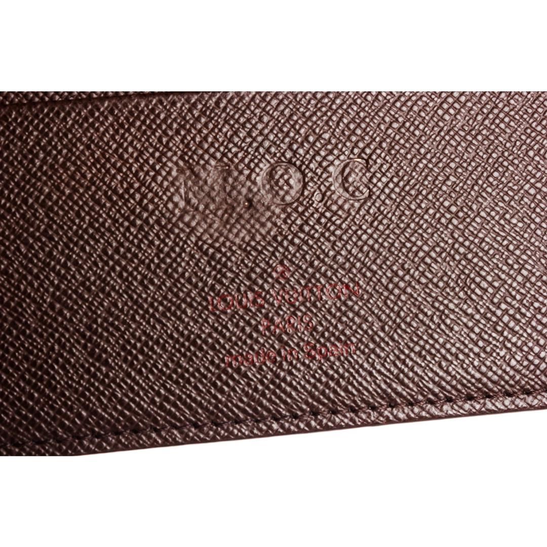 Brown and tan Damier Ebene coated canvas Louis Vuitton Insolite wallet with brass hardware, walnut leather lining, dual interior zip compartments, three bill compartments, 12 card slots and dual snap closures at front. Dimensions = 8.5"x.75"x4.5"/21.59cmx1.90cmx11.43cm. Item is pre-owned.
