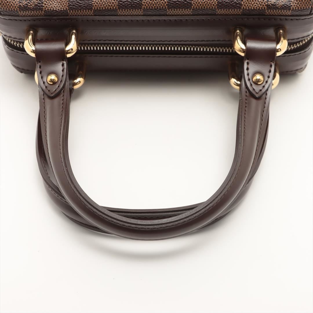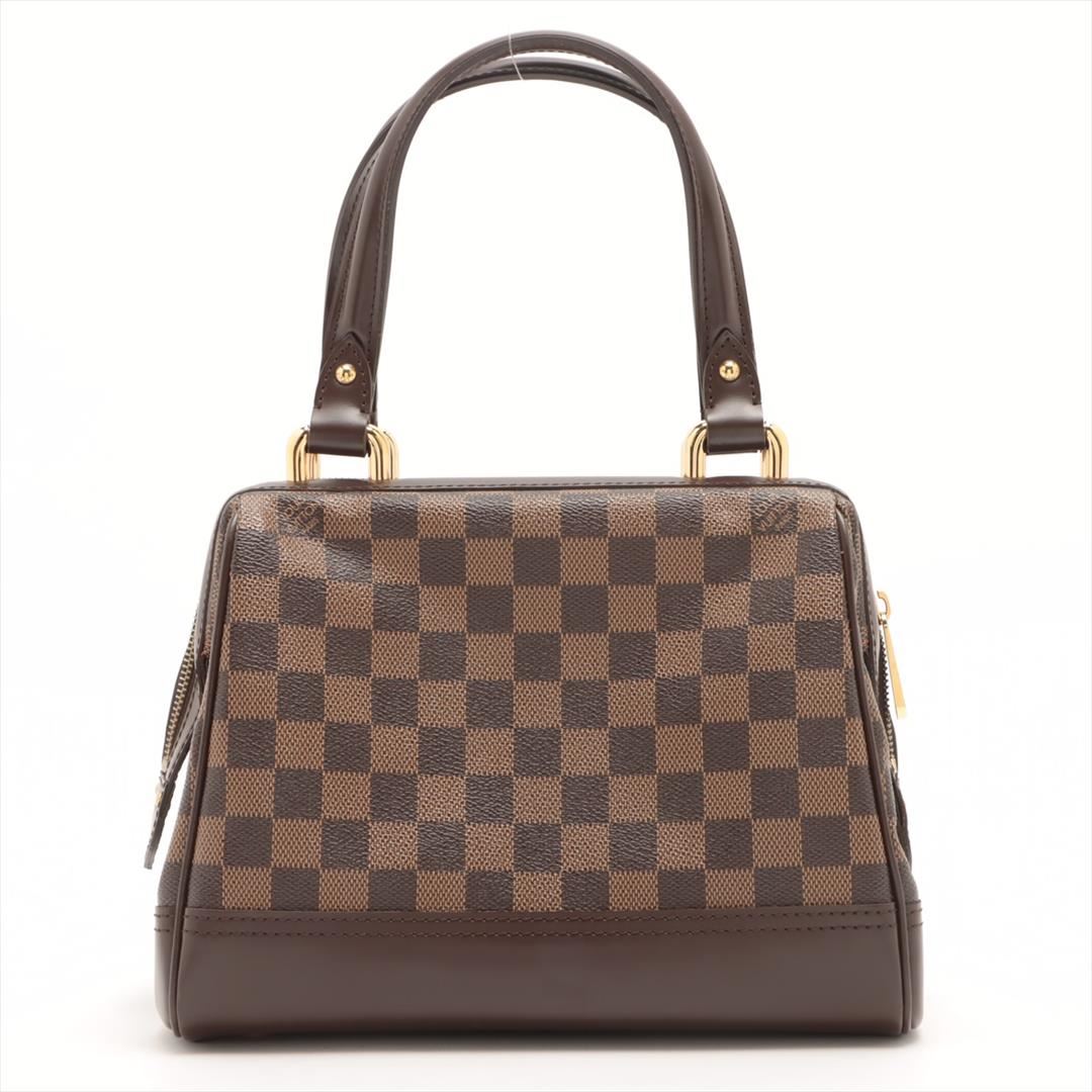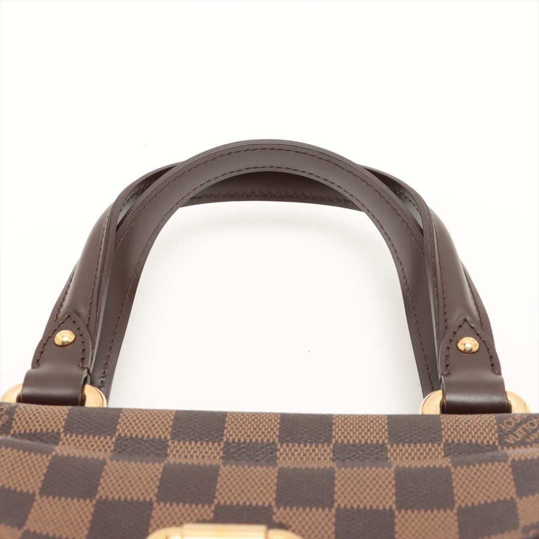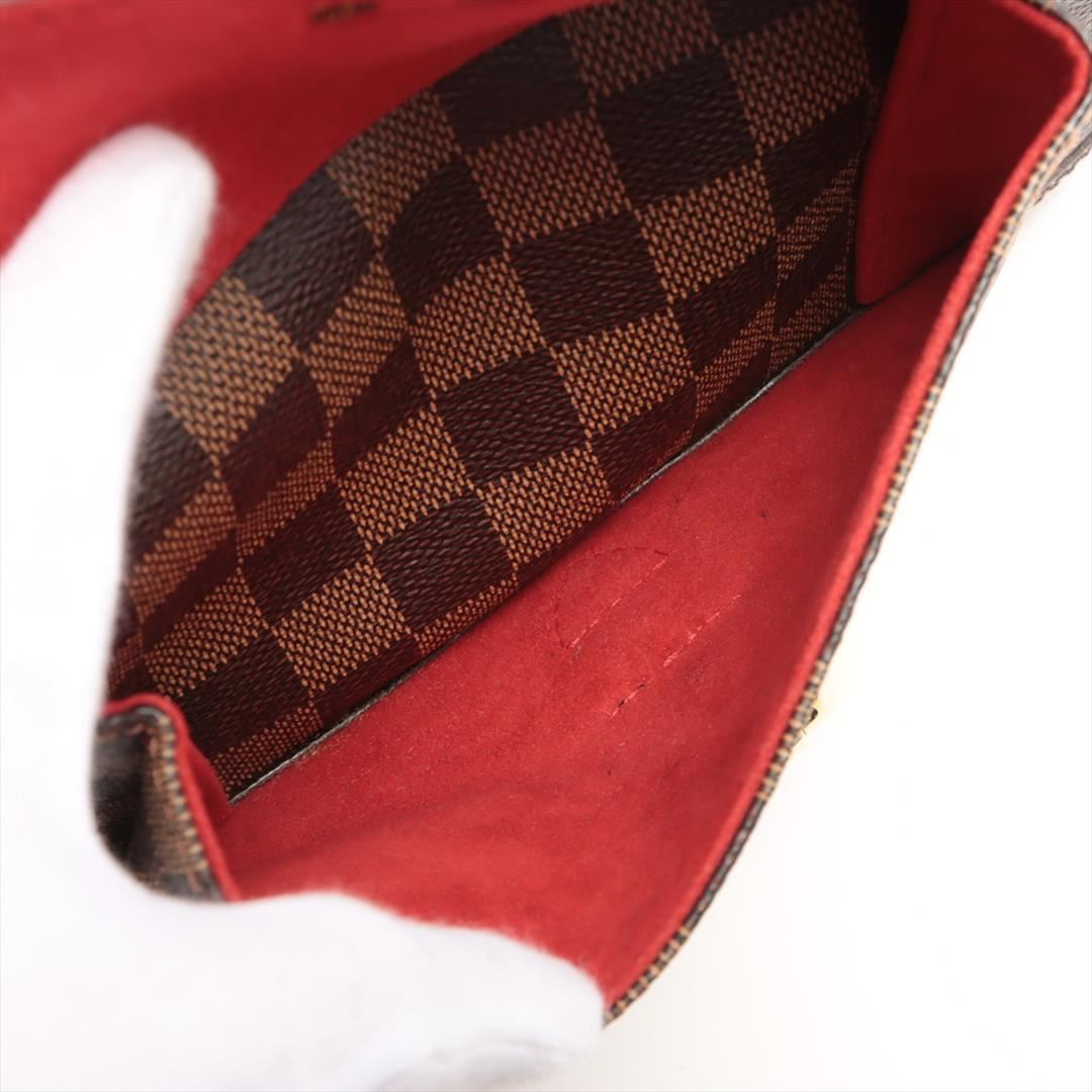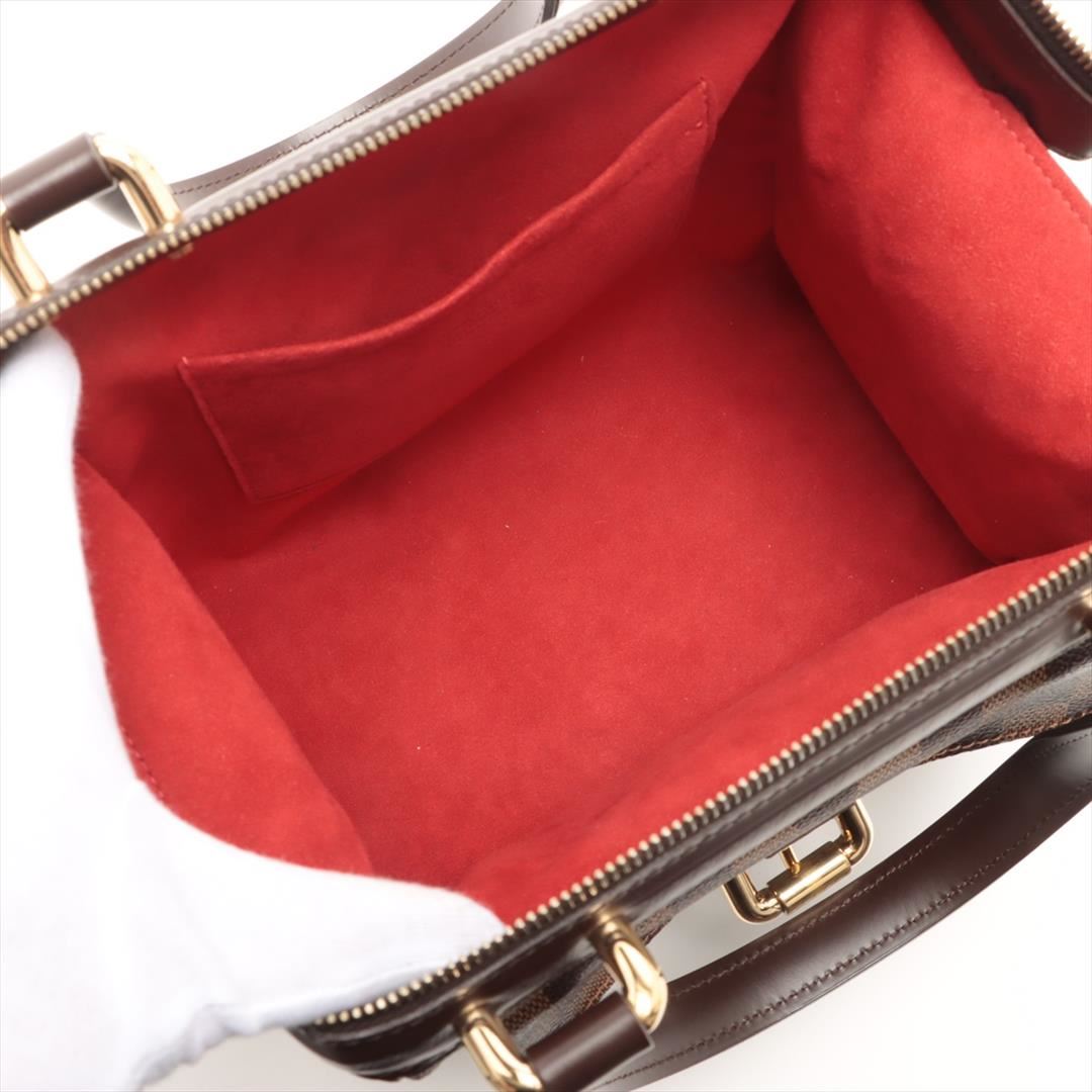 Brown Damier Ebene coated canvas Louis Vuitton Knightsbridge bag with gold-tone hardware, dark brown leather trim, dual flat top handles, single exterior pocket with flap and buckle closure, red Alcantara lining, single slit pocket at interior wall and zi