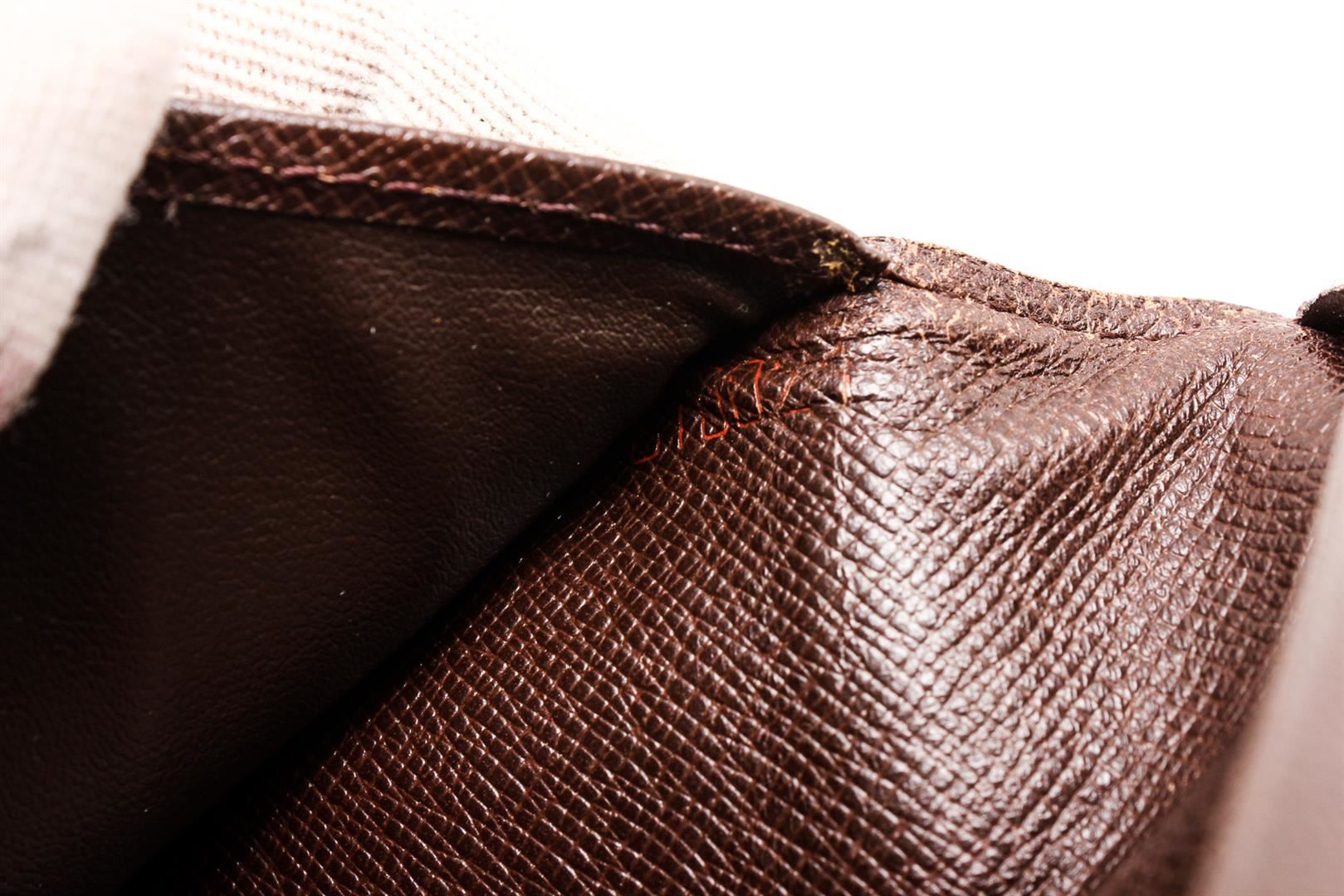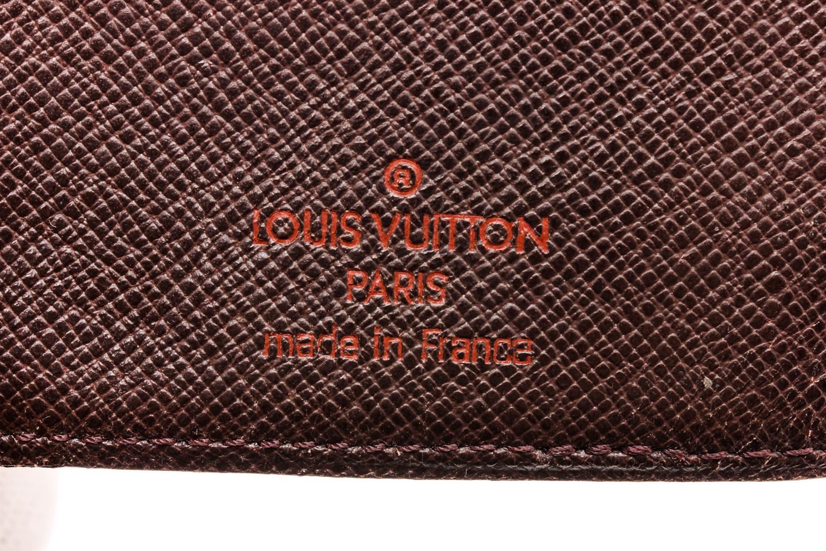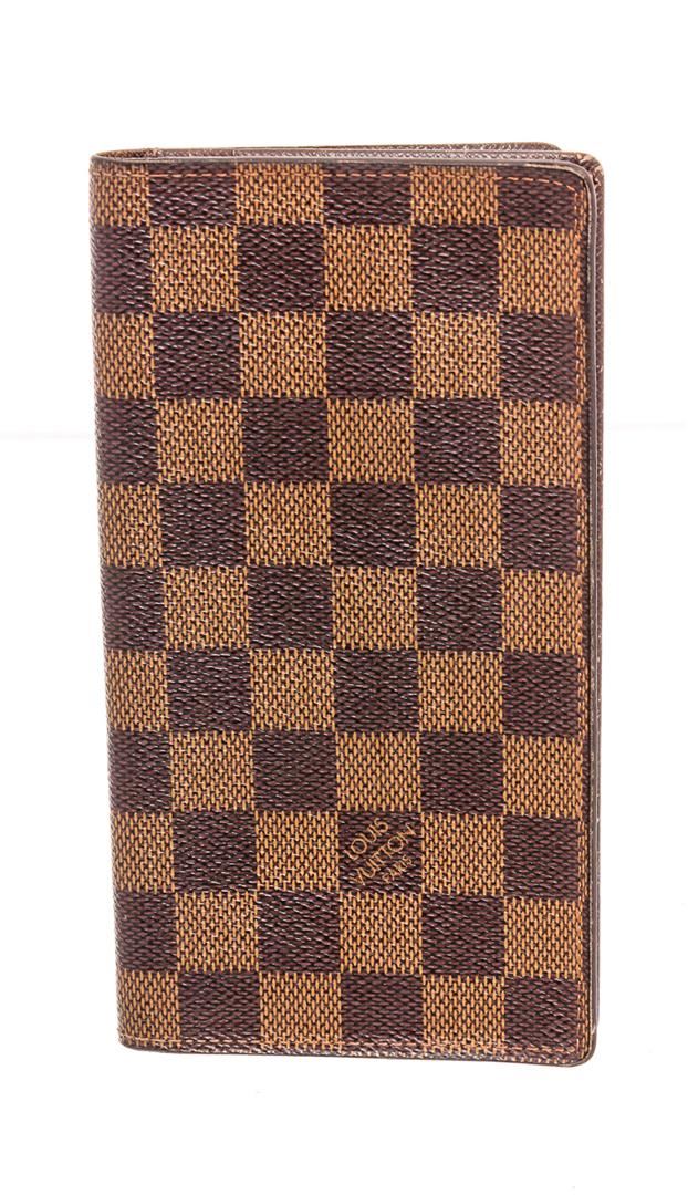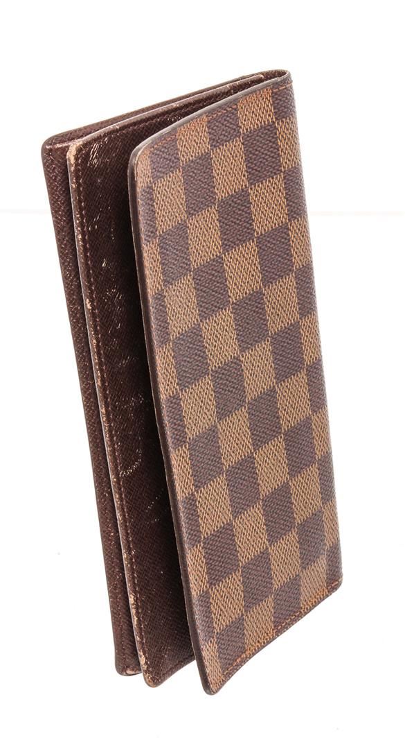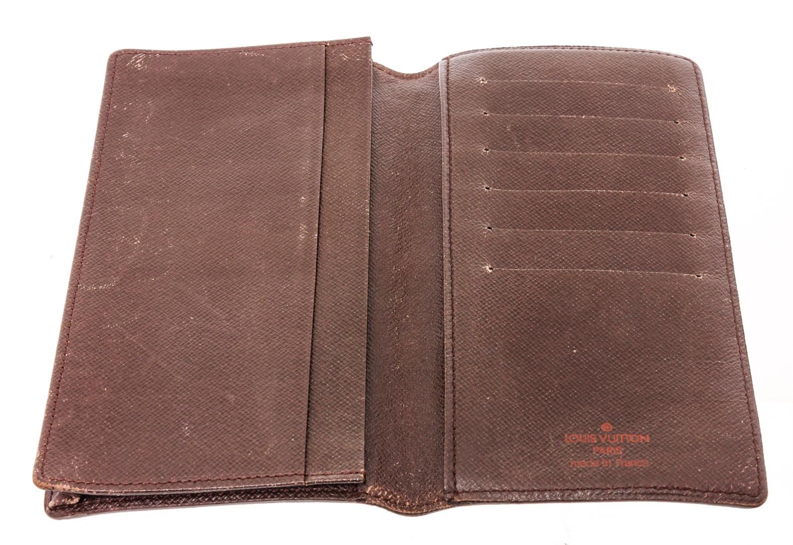 Louis Vuitton Damier Ebene canvas & leather long bifold wallet, brown Taiga leather interior lining, six cardholder slots, three slip pockets and overall bifold closure.