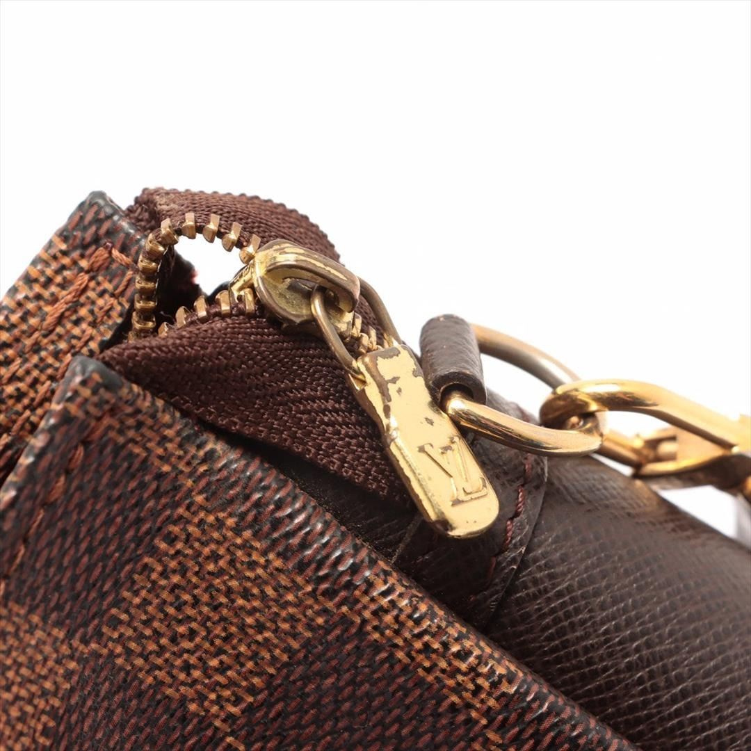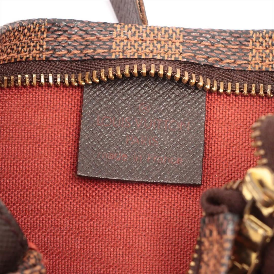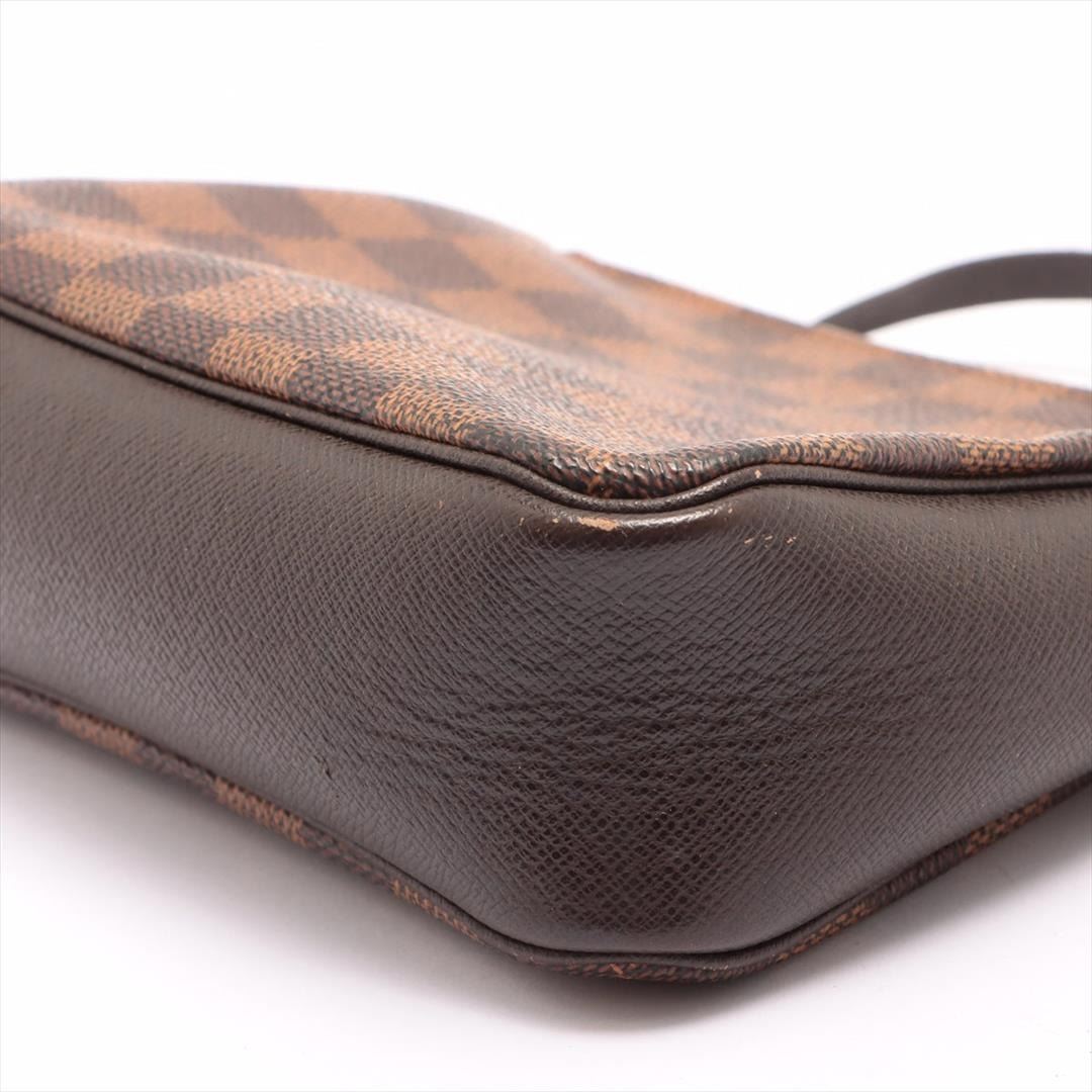 One Louis Vuitton Damier Ebene Canvas Leather Make Up Toiletry Pouch. Item is sold AS-IS. Please check photos and descriptions for all available details. Brown and tobacco Damier Ebene Louis Vuitton Makeup Toiletry pouch with gold-tone hardware, walnut brown Taiga leather trim, convertible flat handle, rust canvas lining and zip closure at top. Height: 5" Width: 6.5" Depth: 2.25" Handle Drop: 4"