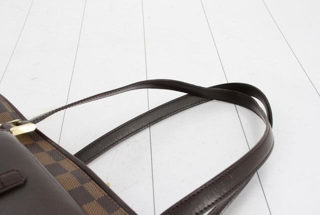 Brown and tobacco Damier Ebene coated canvas Louis Vuitton Manosque PM with gold-tone hardware, brown leather accents, dual flat shoulder straps, single exterior pocket with buckle closure, terracotta Alcantara lining, dual zip pockets at interior walls a