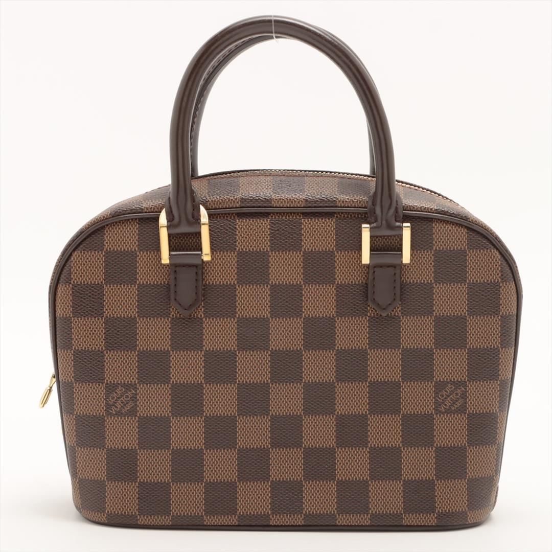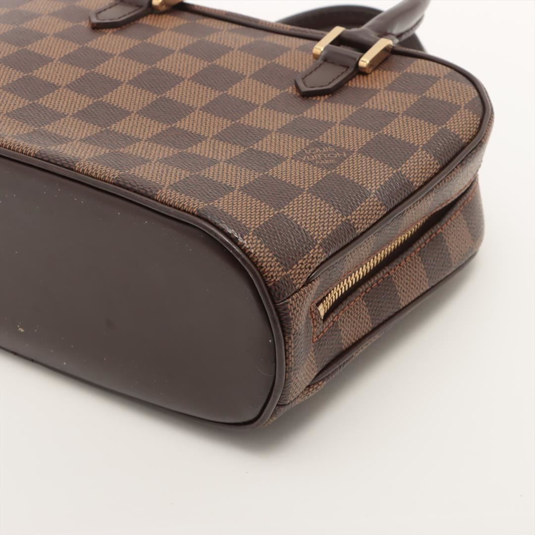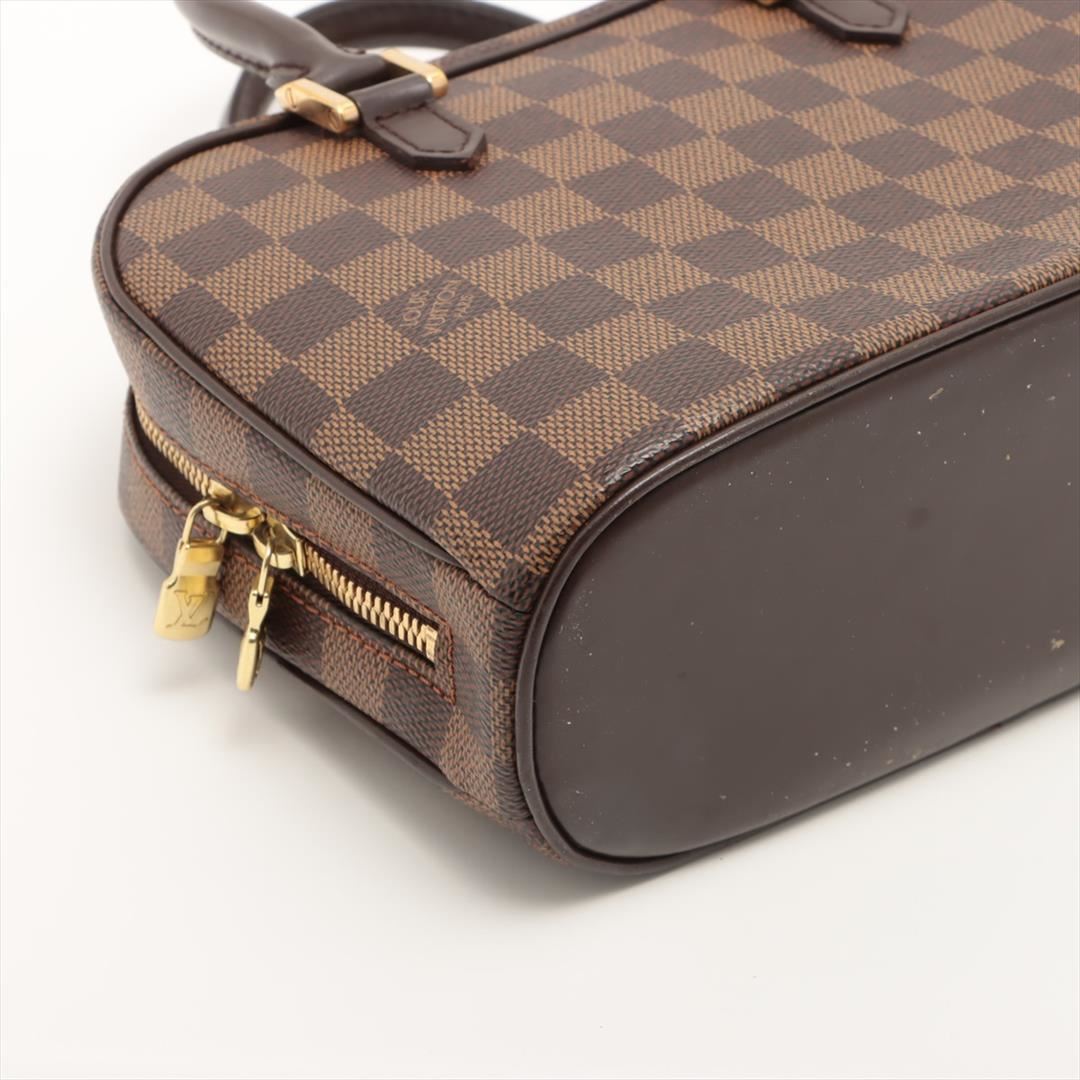 Brown Damier Ebene coated canvas Louis Vuitton Mini Sarria handbag with gold-tone hardware, dual rolled handles, orange suede lining, interior wall slip pocket and two-way top zip closure. 6.5"x8.5"x3.5"xBag Drop:3.25"/16.5cmx21.5cmx8.8cmxBag Drop:8.2c