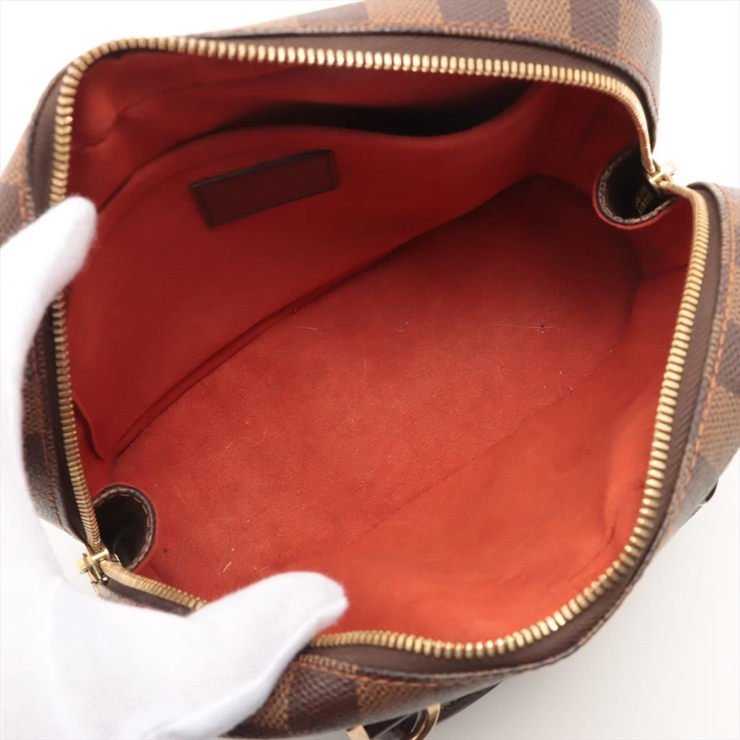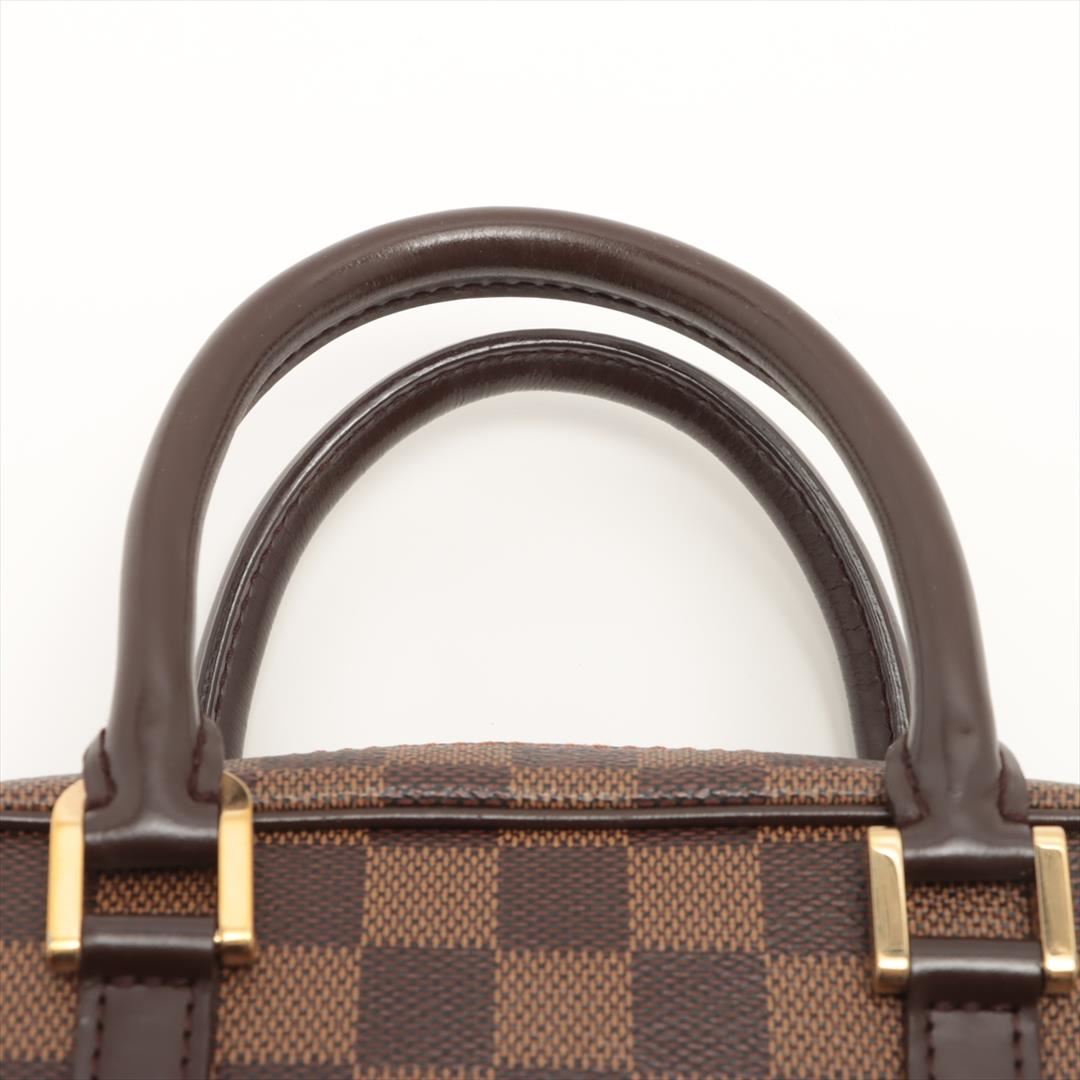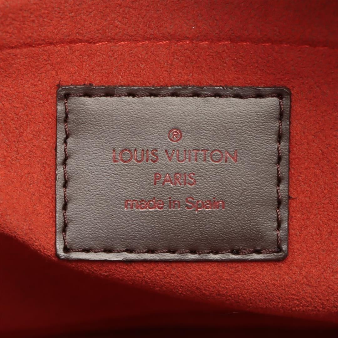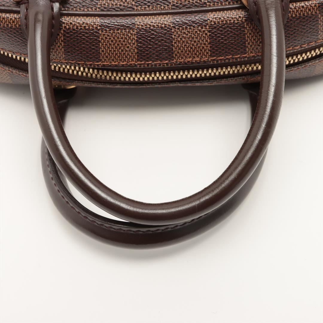 Brown Damier Ebene coated canvas Louis Vuitton Mini Sarria handbag with gold-tone hardware, dual rolled handles, orange suede lining, interior wall slip pocket and two-way top zip closure. 6.5"x8.5"x3.5"xBag Drop:3.25"/16.5cmx21.5cmx8.8cmxBag Drop:8.2c