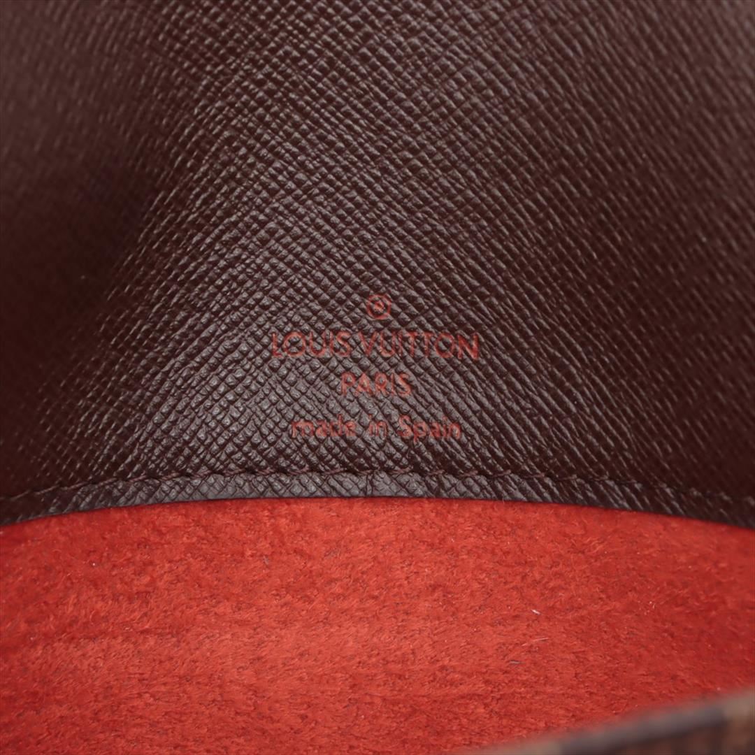 Brown Damier Ebene coated canvas Louis Vuitton Musette Tango bag with gold-tone hardware, dark brown leather trim, single short flat shoulder strap, red Alcantara lining, single pocket at interior wall and magnetic snap closure at front flap. Height: 8