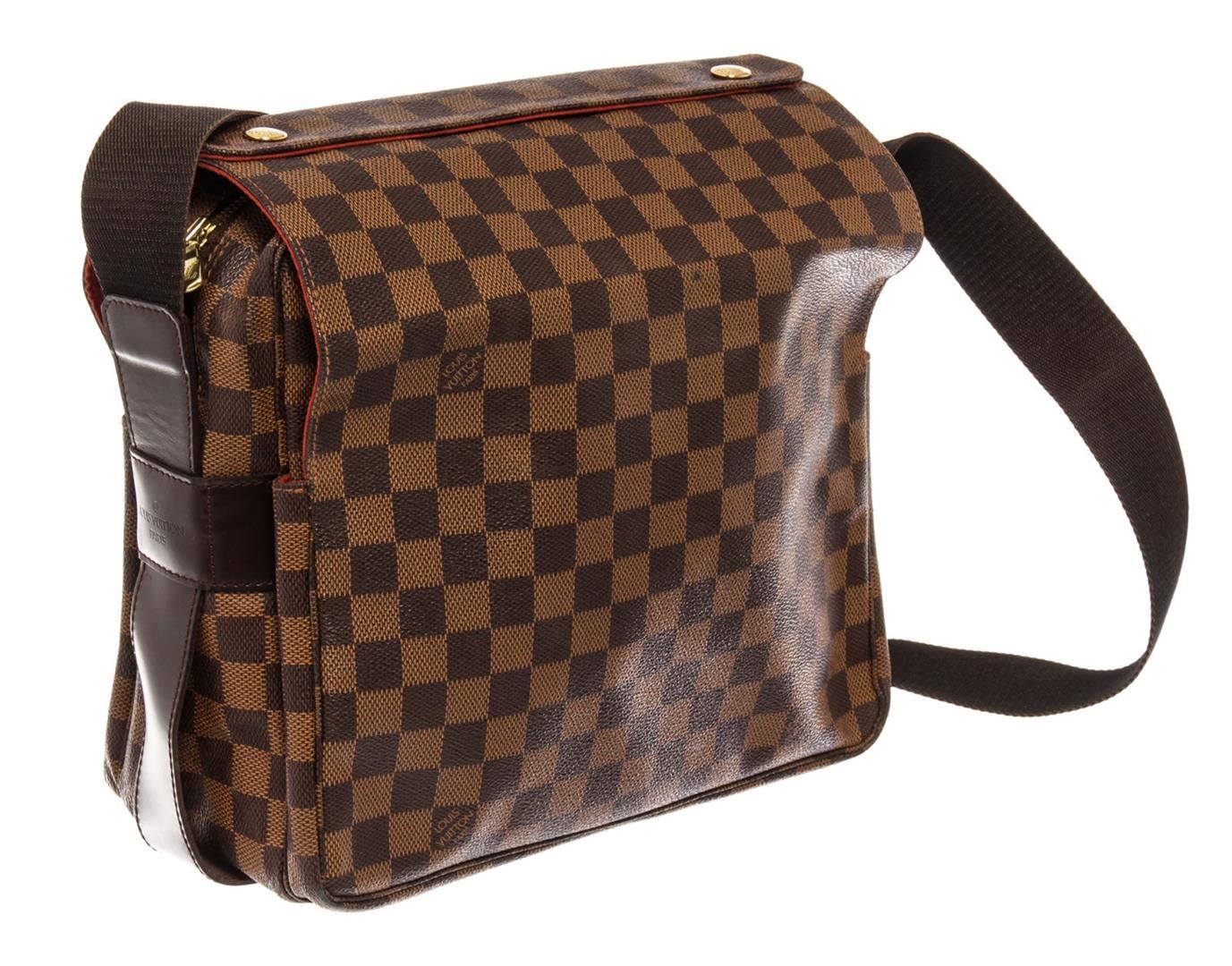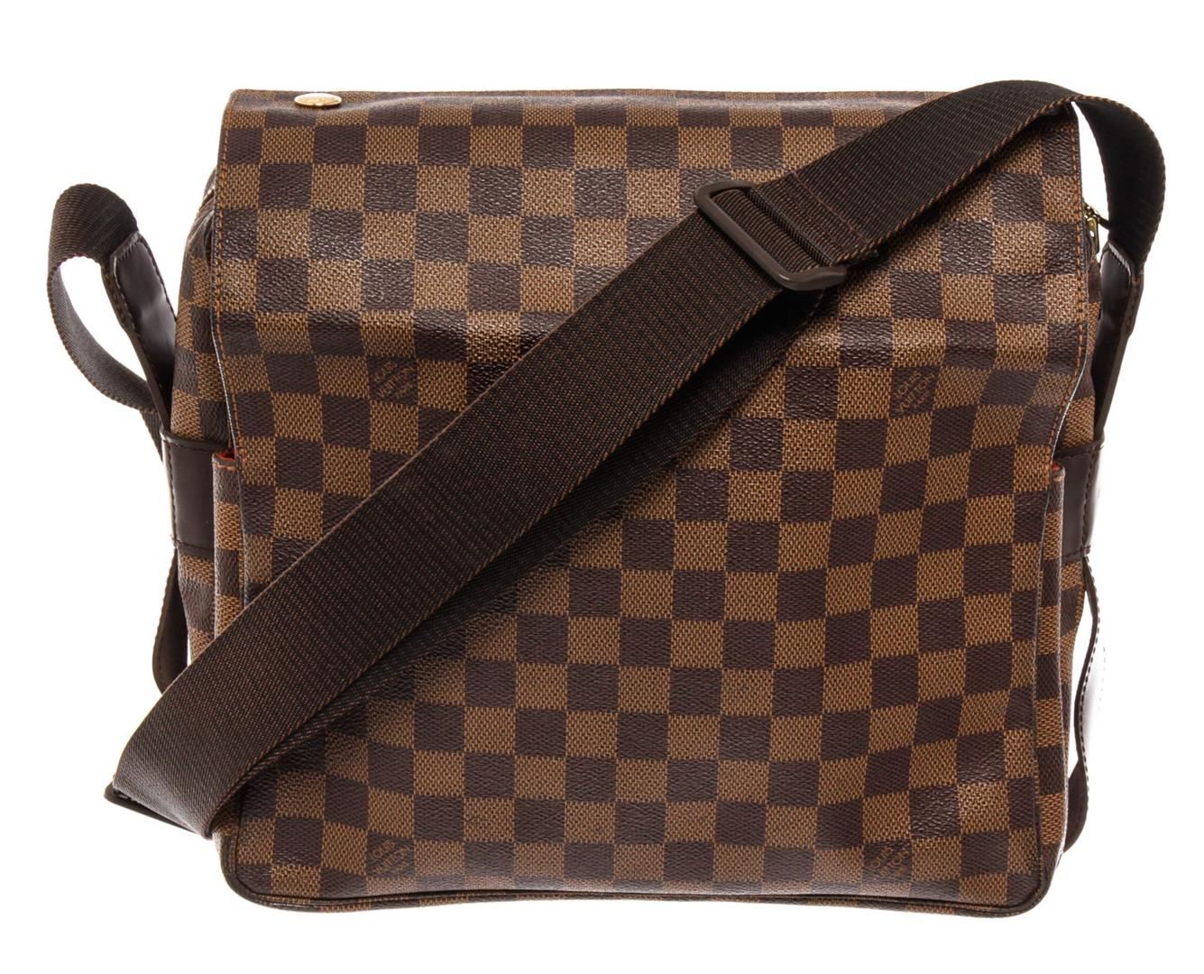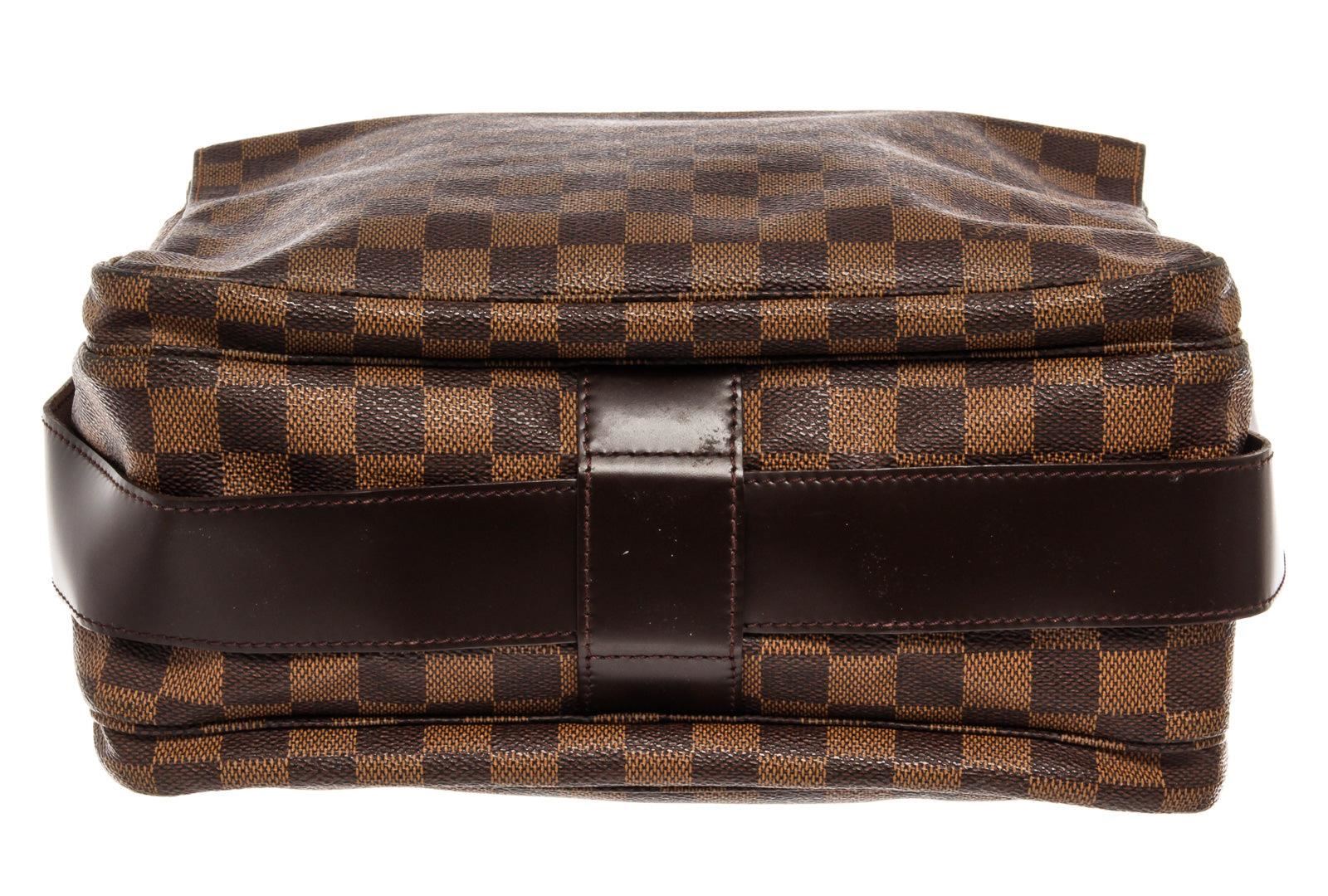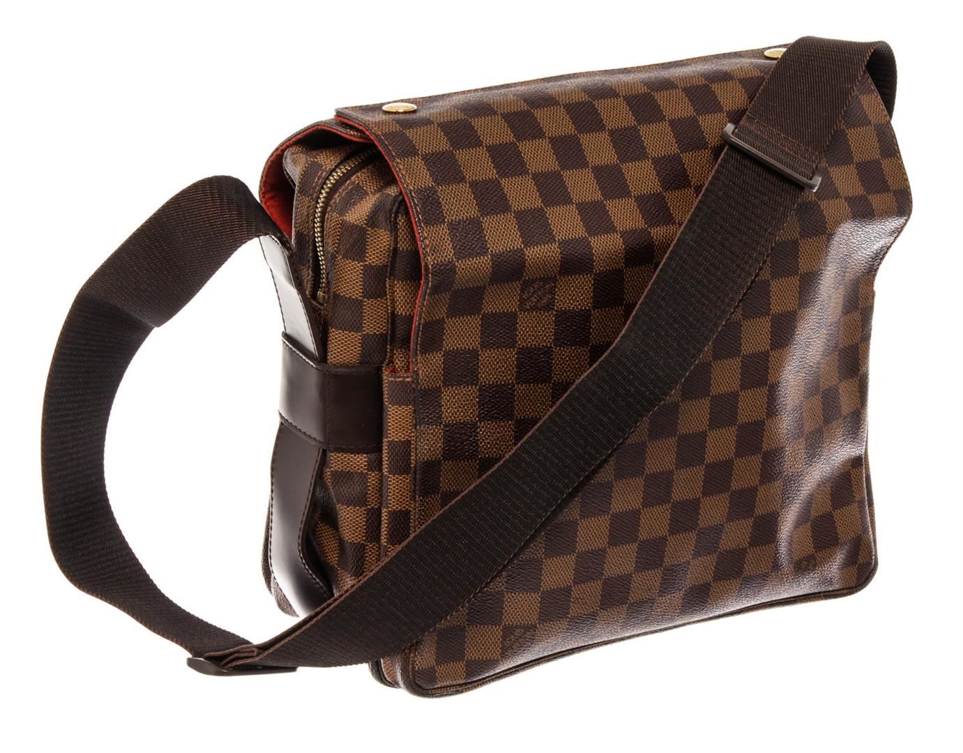 Brown and tobacco Damier Ebene coated canvas Louis Vuitton Naviglio messenger bag with gold-tone hardware, walnut leather trim, single adjustable flat shoulder strap, three interior compartments; one with zip closure, Terracotta woven lining, single slip
