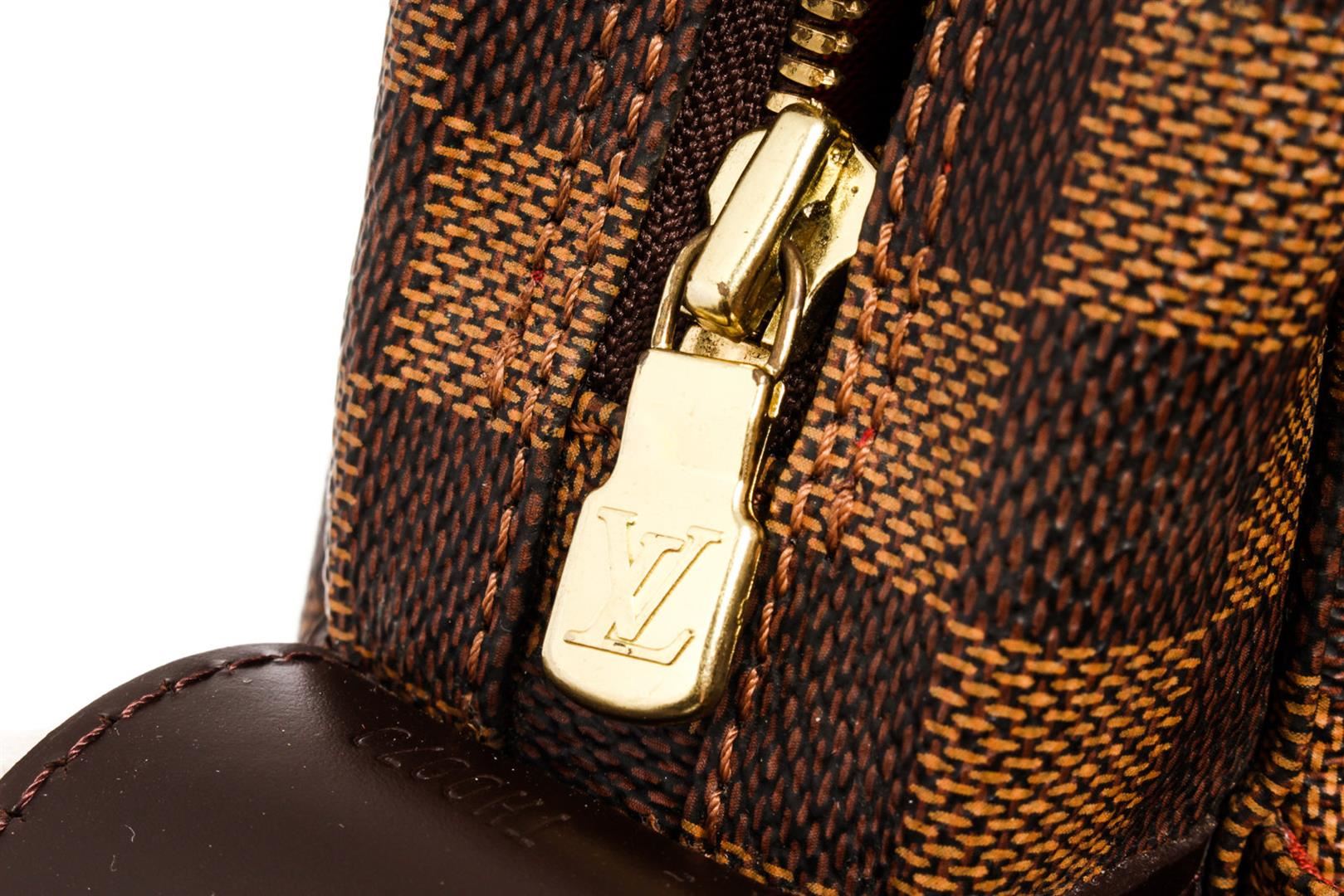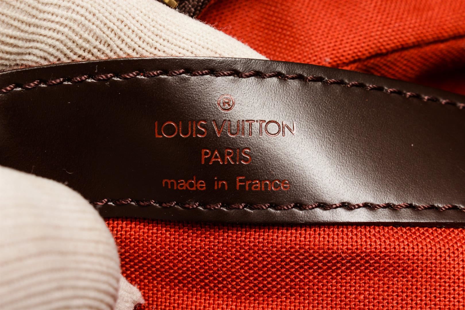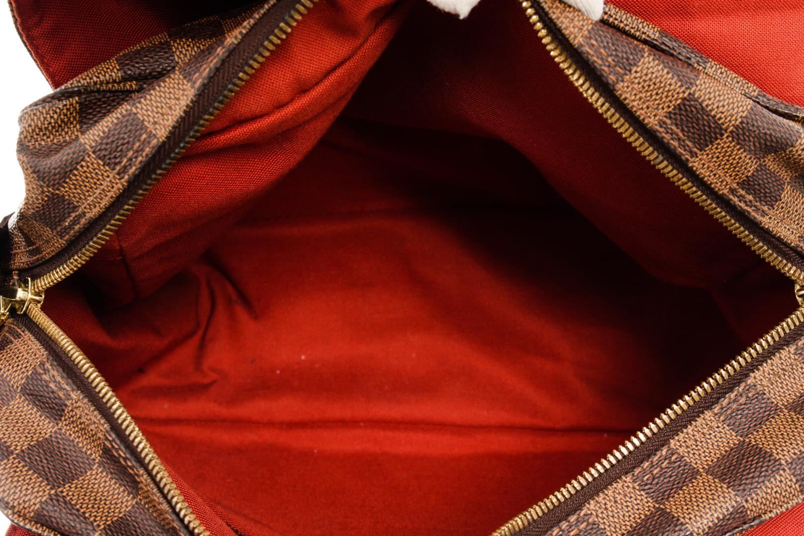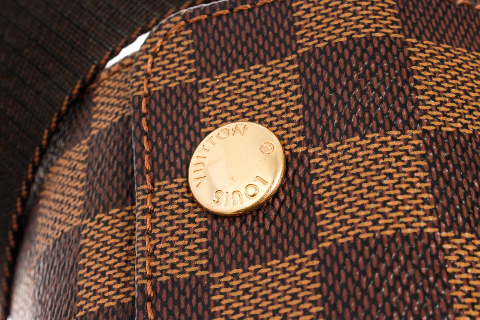 Brown and tobacco Damier Ebene coated canvas Louis Vuitton Naviglio messenger bag with gold-tone hardware, walnut leather trim, single adjustable flat shoulder strap, three interior compartments; one with zip closure, Terracotta woven lining, single slip