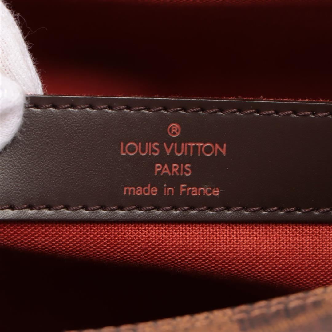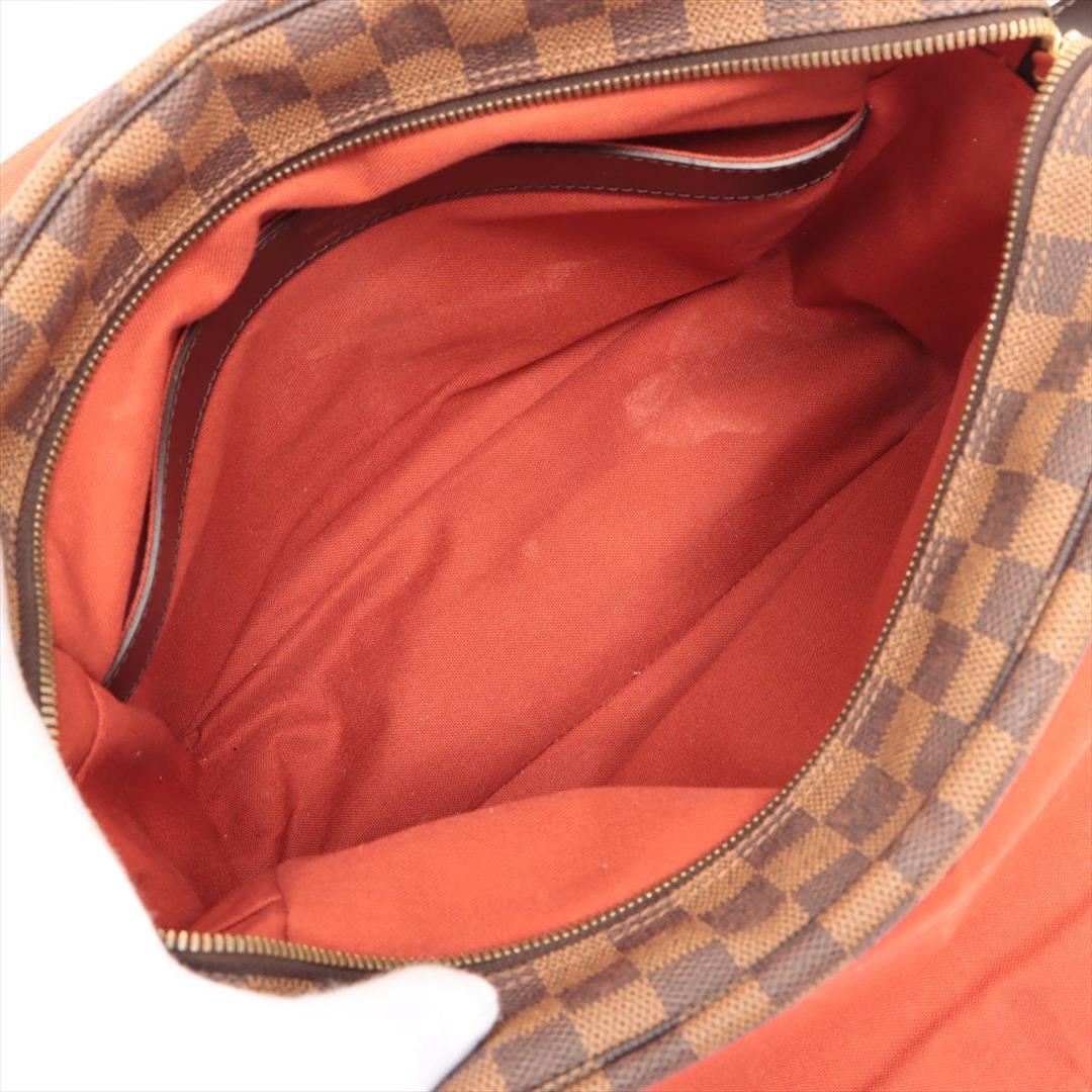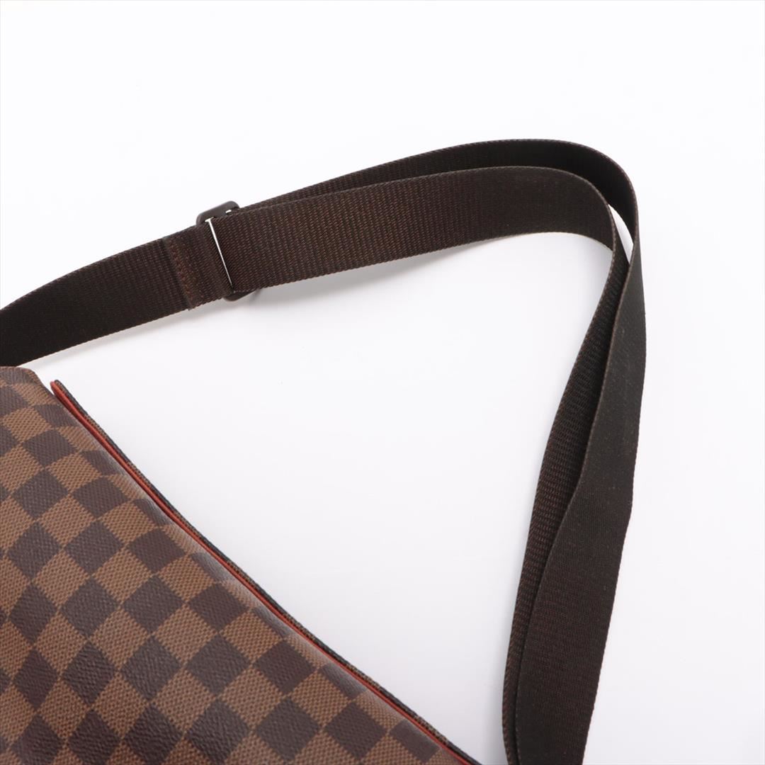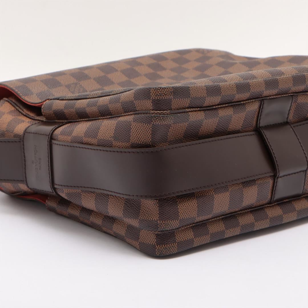 Brown Damier Ebene coated canvas Louis Vuitton Naviglio messenger bag with gold-tone hardware, walnut leather trim, single adjustable flat shoulder strap, three interior compartments; one with zip closure, terracotta woven lining, single slip pocket at interior wall and dual snap closures at top. 13"x3"x11"xBag Drop:21"/33cmx7.6cmx27.9cmxBag Drop:53.3cm