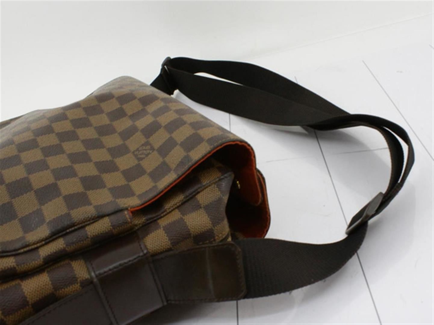 Brown Damier Ebene coated canvas Louis Vuitton Naviglio messenger bag with gold-tone hardware, dark brown leather trim, single adjustable flat shoulder strap, three interior compartments; one with zip closure, red woven lining, single slip pocket at inter
