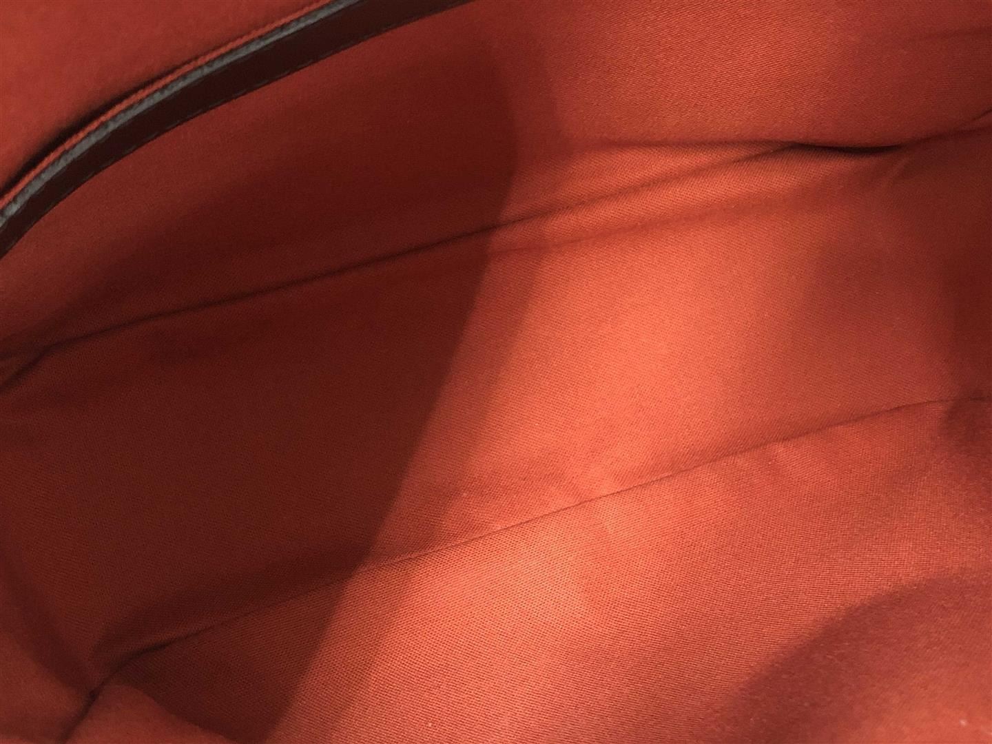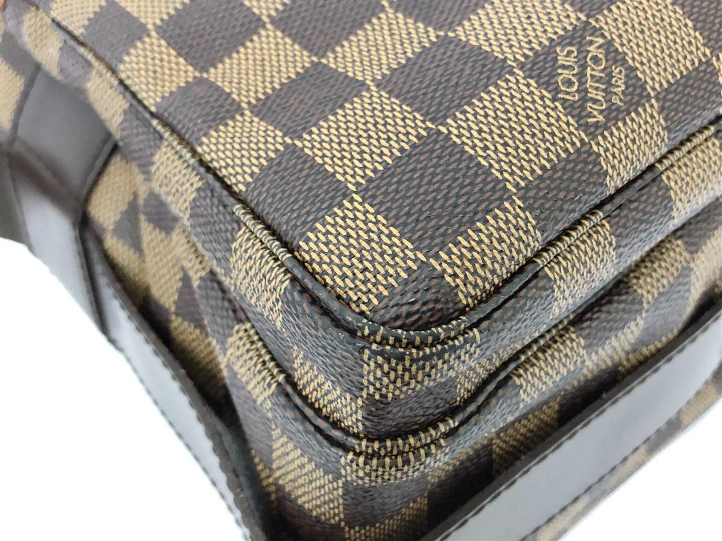 Brown Damier Ebene coated canvas Louis Vuitton Naviglio messenger bag with gold-tone hardware, dark brown leather trim, single adjustable flat shoulder strap, three interior compartments; one with zip closure, red woven lining, single slip pocket at inter
