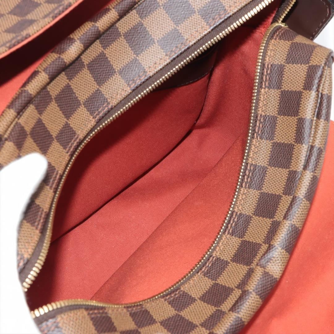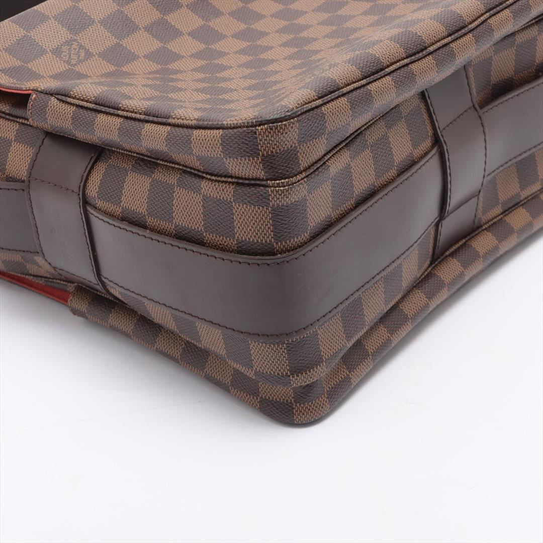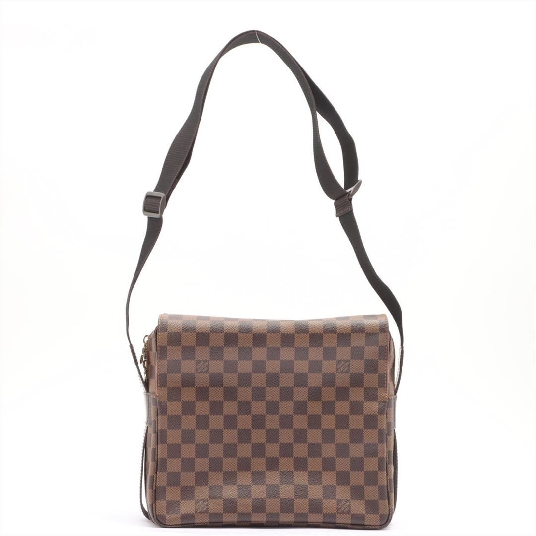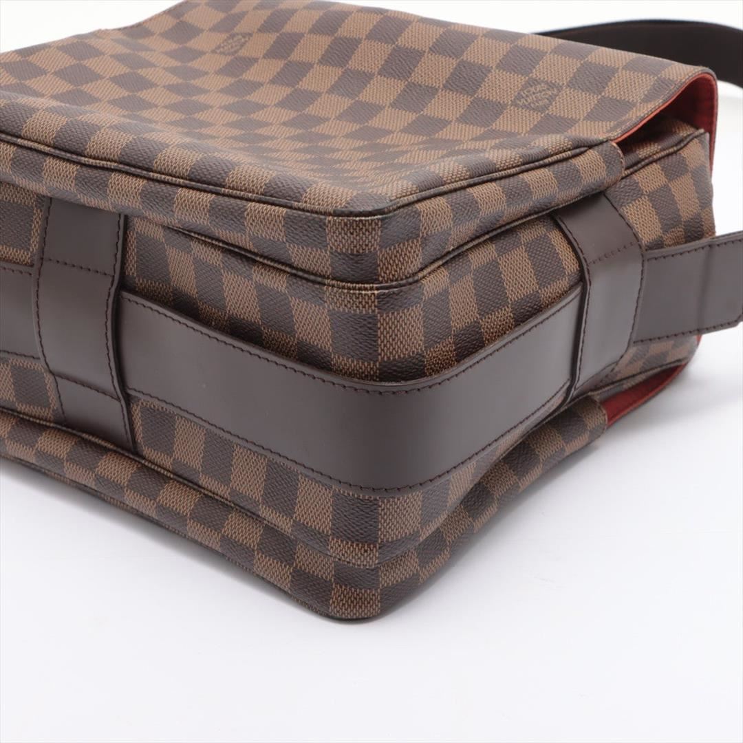 Brown Damier Ebene coated canvas Louis Vuitton Naviglio messenger bag with gold-tone hardware, walnut leather trim, single adjustable flat shoulder strap, three interior compartments; one with zip closure, terracotta woven lining, single slip pocket at in