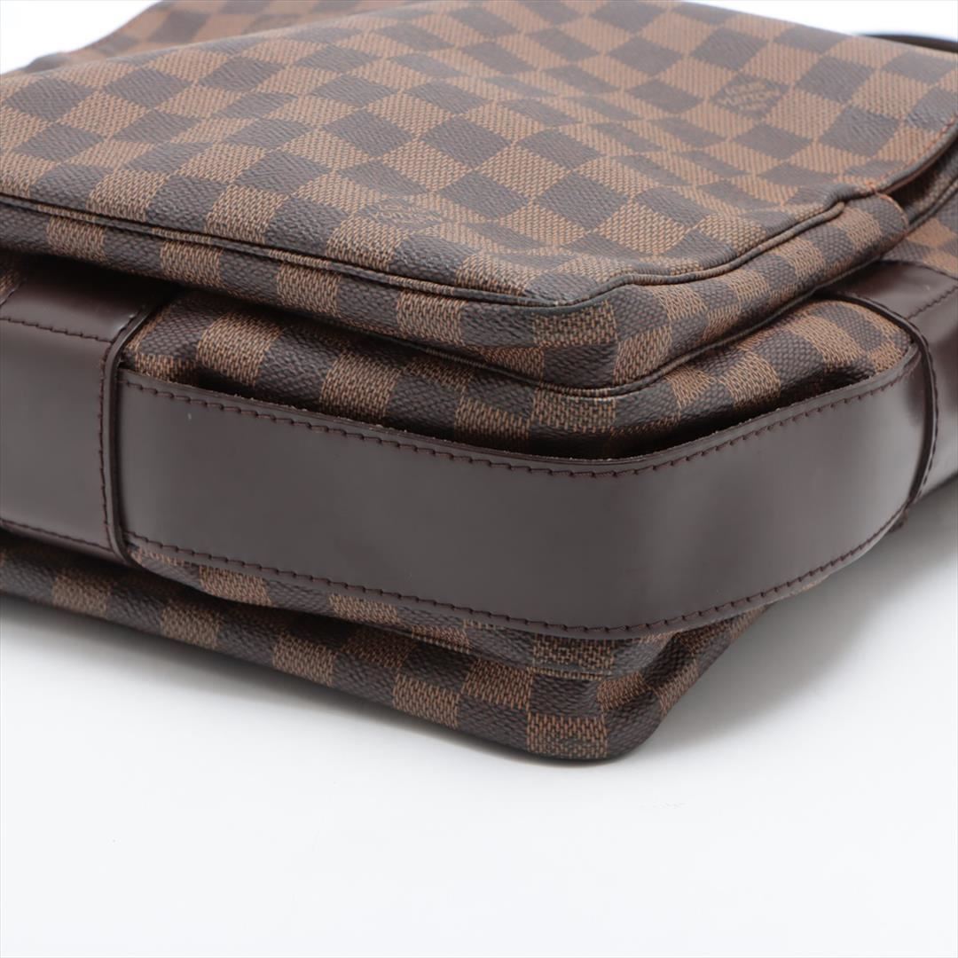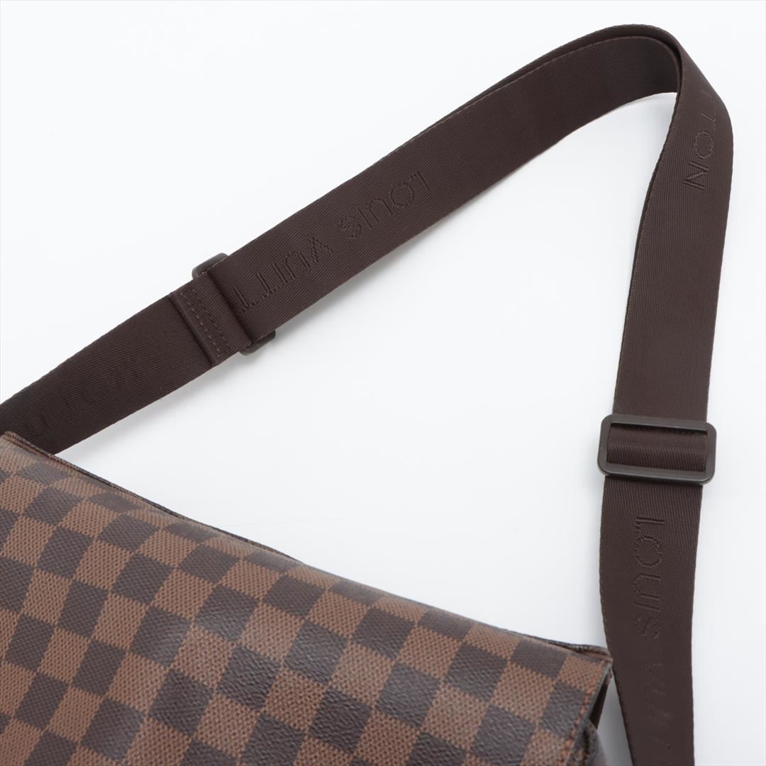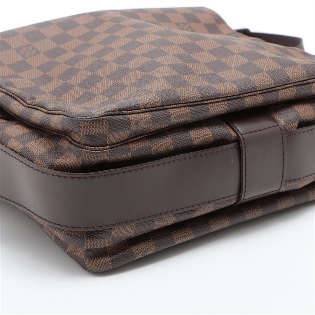 Brown Damier Ebene coated canvas Louis Vuitton Naviglio messenger bag with gold-tone hardware, dark brown leather trim, single adjustable flat shoulder strap, three interior compartments; one with zip closure, brown woven canvas lining, single slip pocket