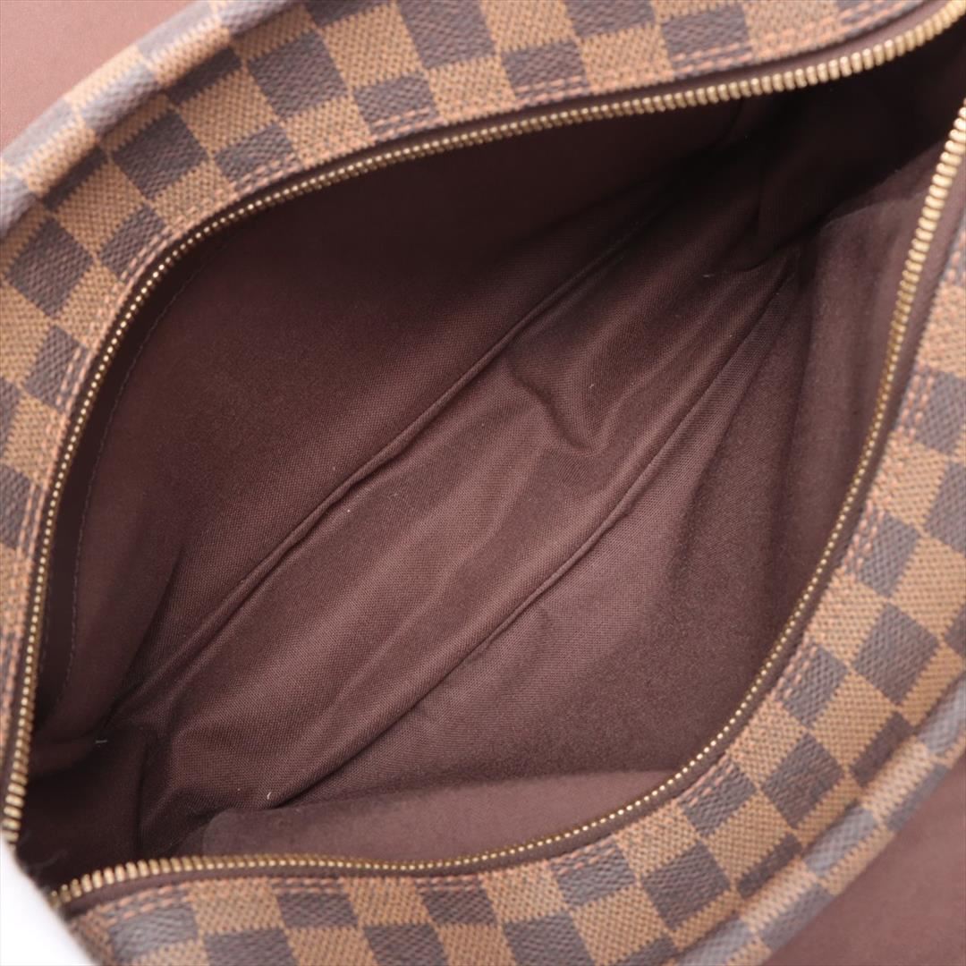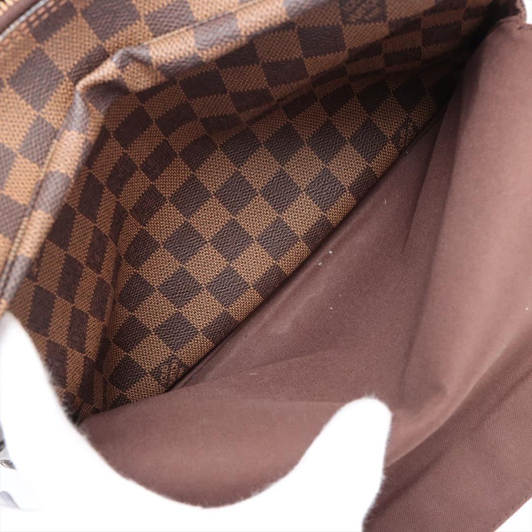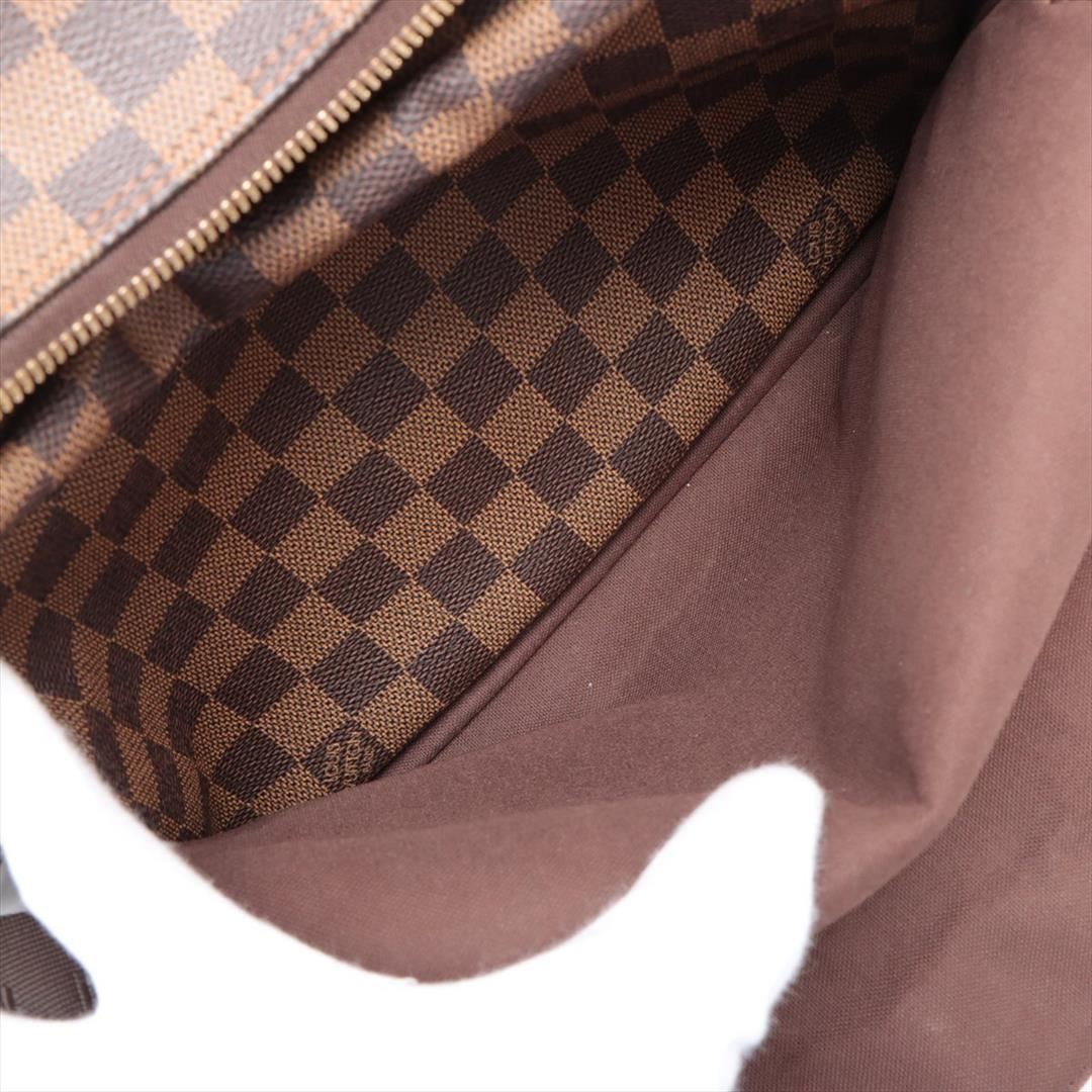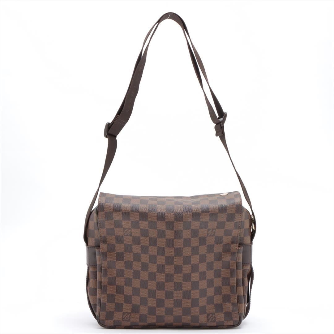 Brown Damier Ebene coated canvas Louis Vuitton Naviglio messenger bag with gold-tone hardware, dark brown leather trim, single adjustable flat shoulder strap, three interior compartments; one with zip closure, brown woven canvas lining, single slip pocket