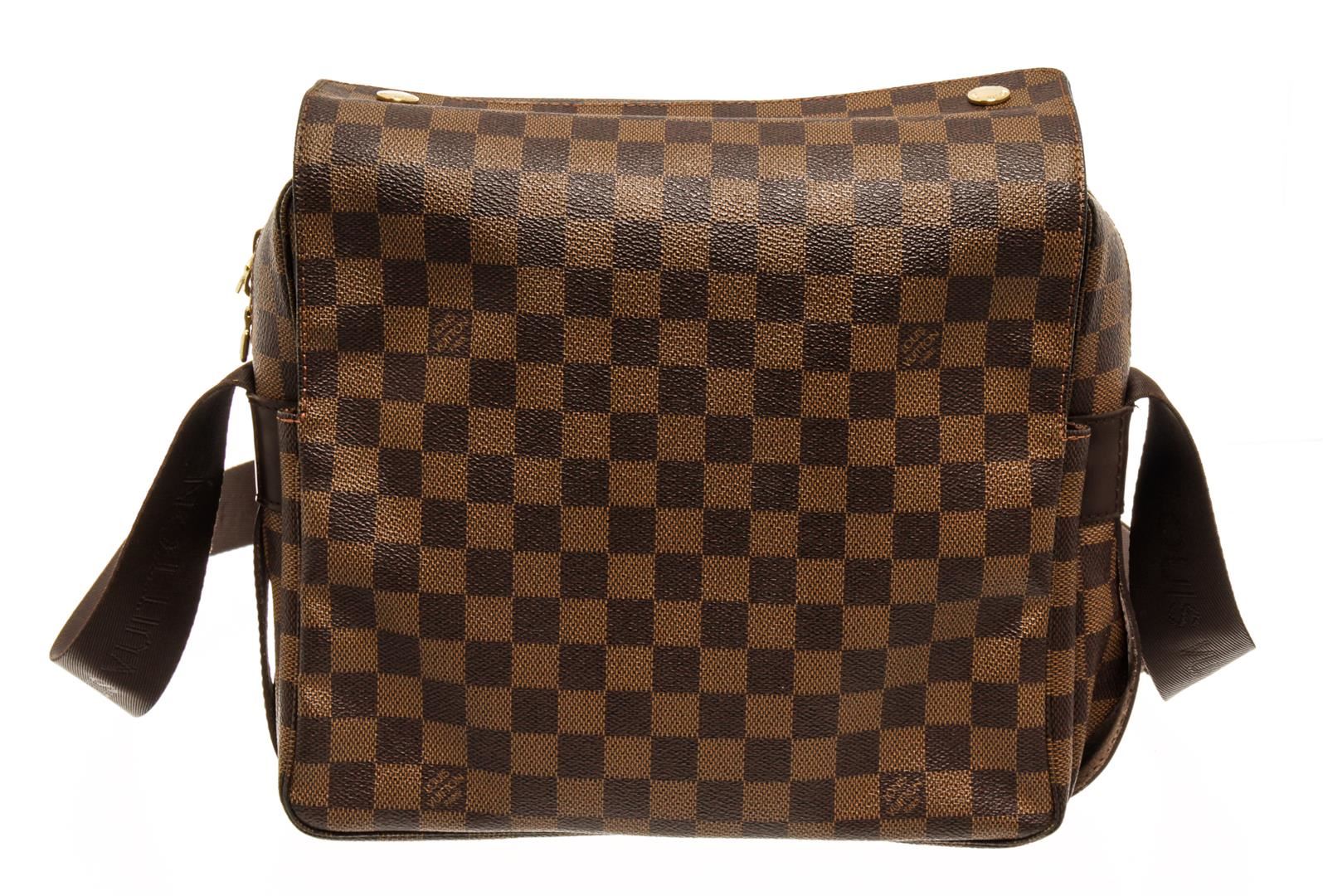 One Louis Vuitton Damier Ebene Canvas Leather Naviglio Messenger Bag. Item is sold AS-IS. All available information is listed in the description and shown in the photo. Brown Damier Ebene coated canvas Louis Vuitton Naviglio messenger bag with gold-tone hardware, dark brown leather trim, single adjustable flat shoulder strap, three interior compartments; one with zip closure, brown woven lining, single slip pocket at interior wall and dual snap closures at top. 13"x3"x11"xBag Drop:21"/33cmx7.6cmx27.9cmxBag Drop:53.3cm