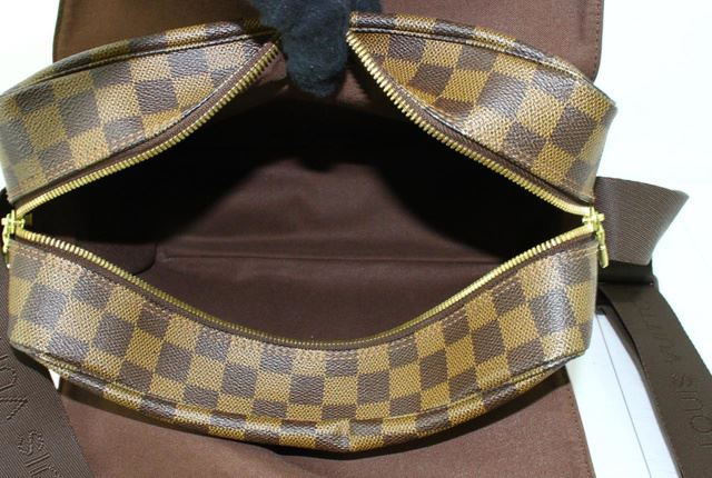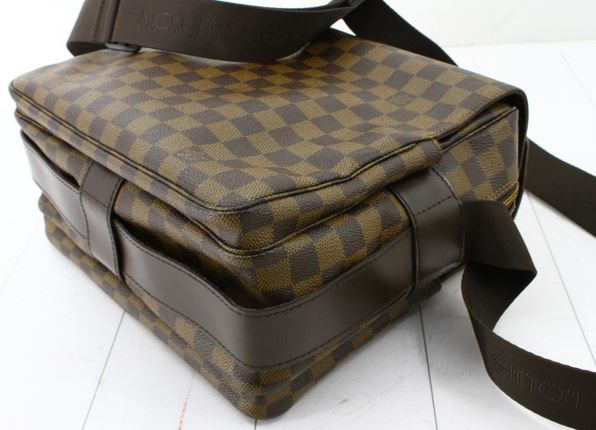 One Louis Vuitton Damier Ebene Canvas Leather Naviglio Messenger Bag. Item is sold AS-IS. All available information is listed in the description and shown in the photo. Brown Damier Ebene coated canvas Louis Vuitton Naviglio messenger bag with gold-tone hardware, dark brown leather trim, single adjustable flat shoulder strap, three interior compartments; one with zip closure, brown woven lining, single slip pocket at interior wall and dual snap closures at top. 13"x3"x11"xBag Drop:21"/33cmx7.6cmx27.9cmxBag Drop:53.3cm