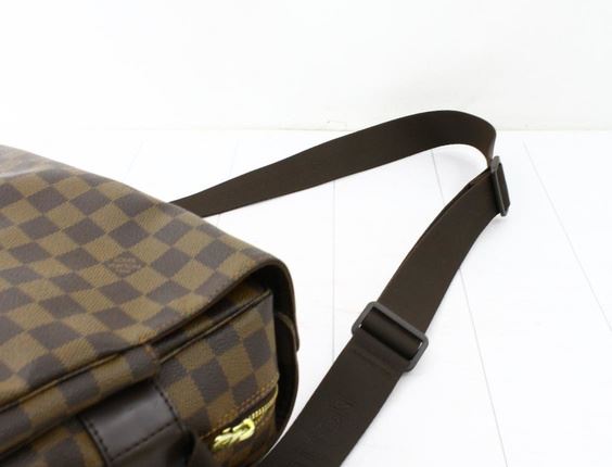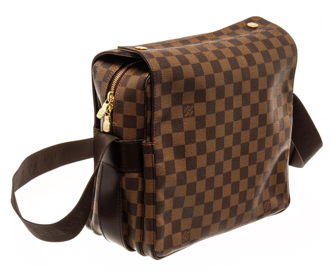 One Louis Vuitton Damier Ebene Canvas Leather Naviglio Messenger Bag. Item is sold AS-IS. All available information is listed in the description and shown in the photo. Brown Damier Ebene coated canvas Louis Vuitton Naviglio messenger bag with gold-tone hardware, dark brown leather trim, single adjustable flat shoulder strap, three interior compartments; one with zip closure, brown woven lining, single slip pocket at interior wall and dual snap closures at top. 13"x3"x11"xBag Drop:21"/33cmx7.6cmx27.9cmxBag Drop:53.3cm