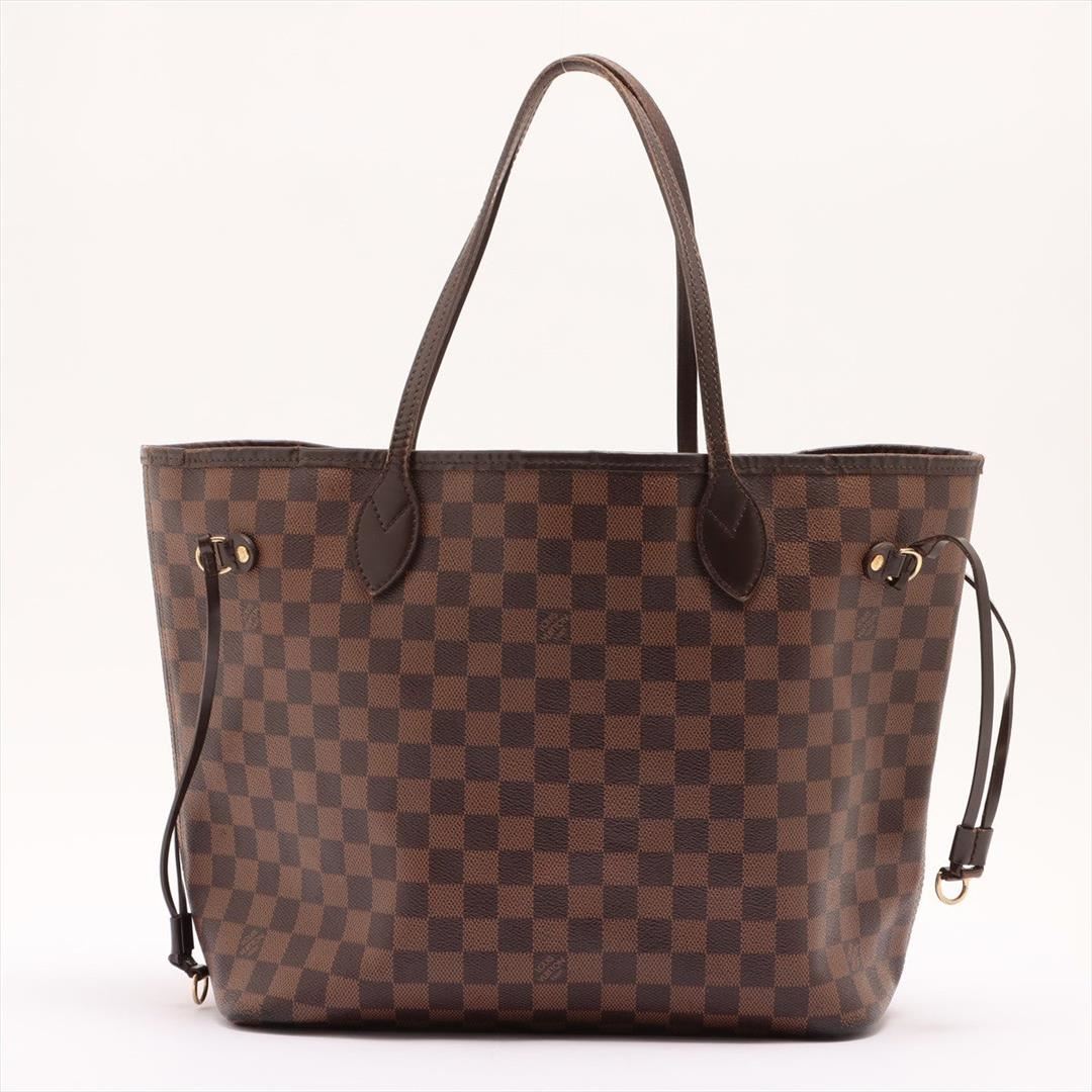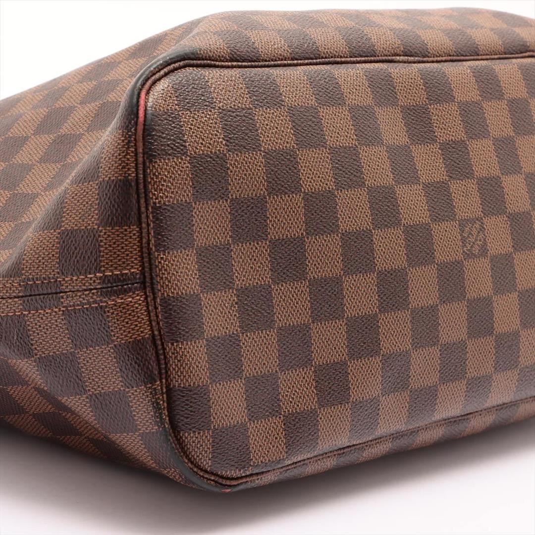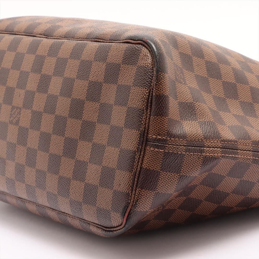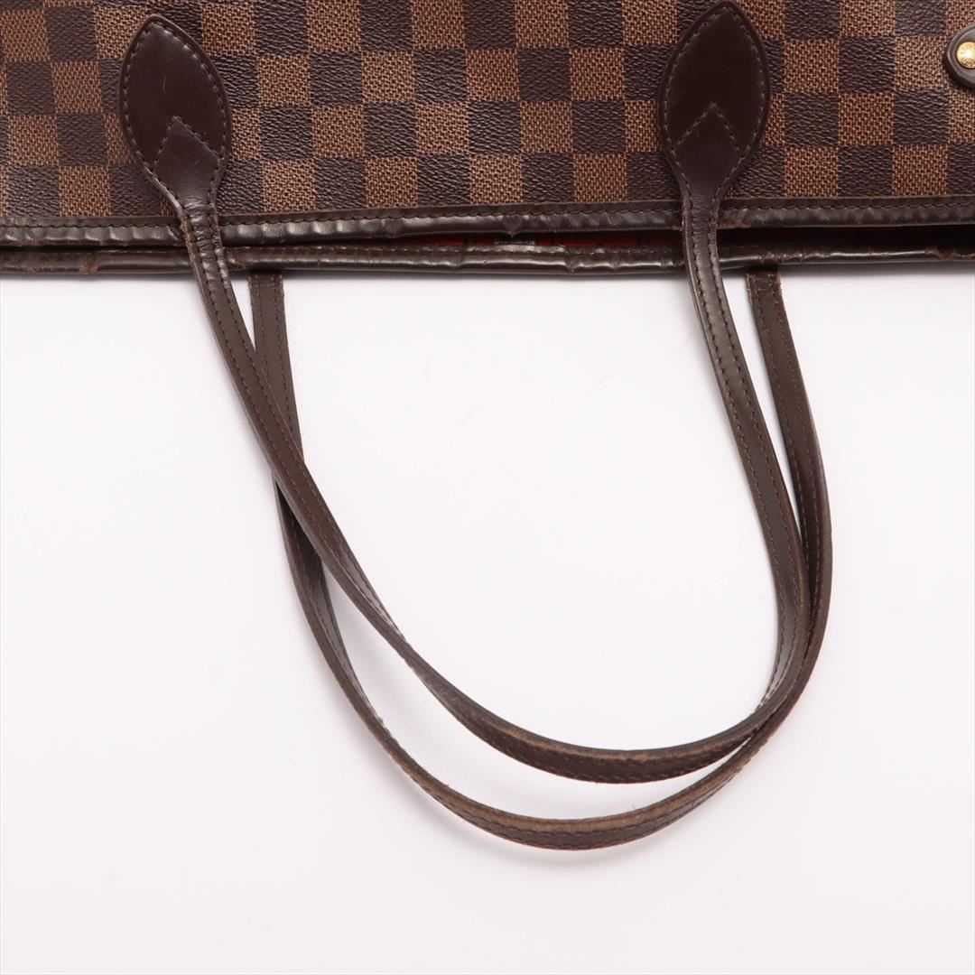 Brown Damier Ebene coated canvas Louis Vuitton Neverfull MM with gold-tone hardware, dark brown leather trim, dual flat shoulder straps, red striped canvas lining, single zip pocket at interior wall, lobster clasp closure at top and drawstring closures at sides. Height 11", Width 12.5", Depth 6.5", Strap Drop 8.5"