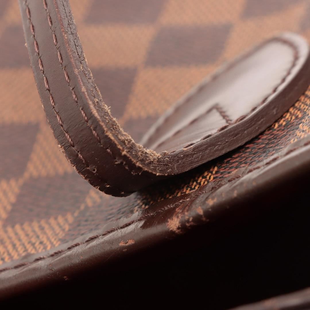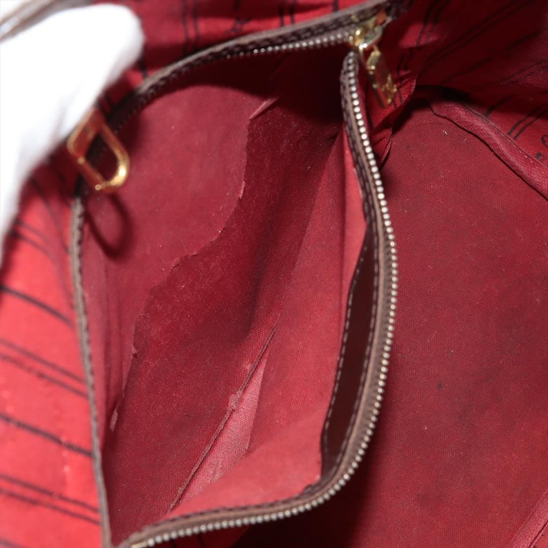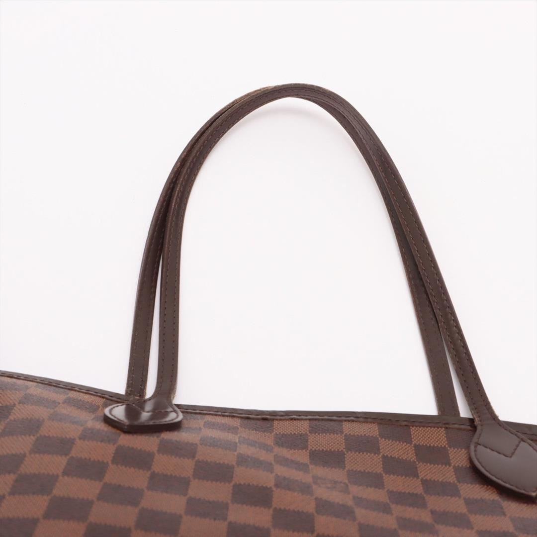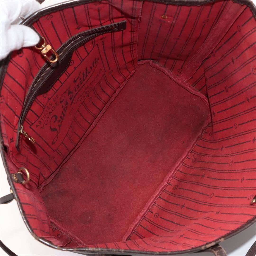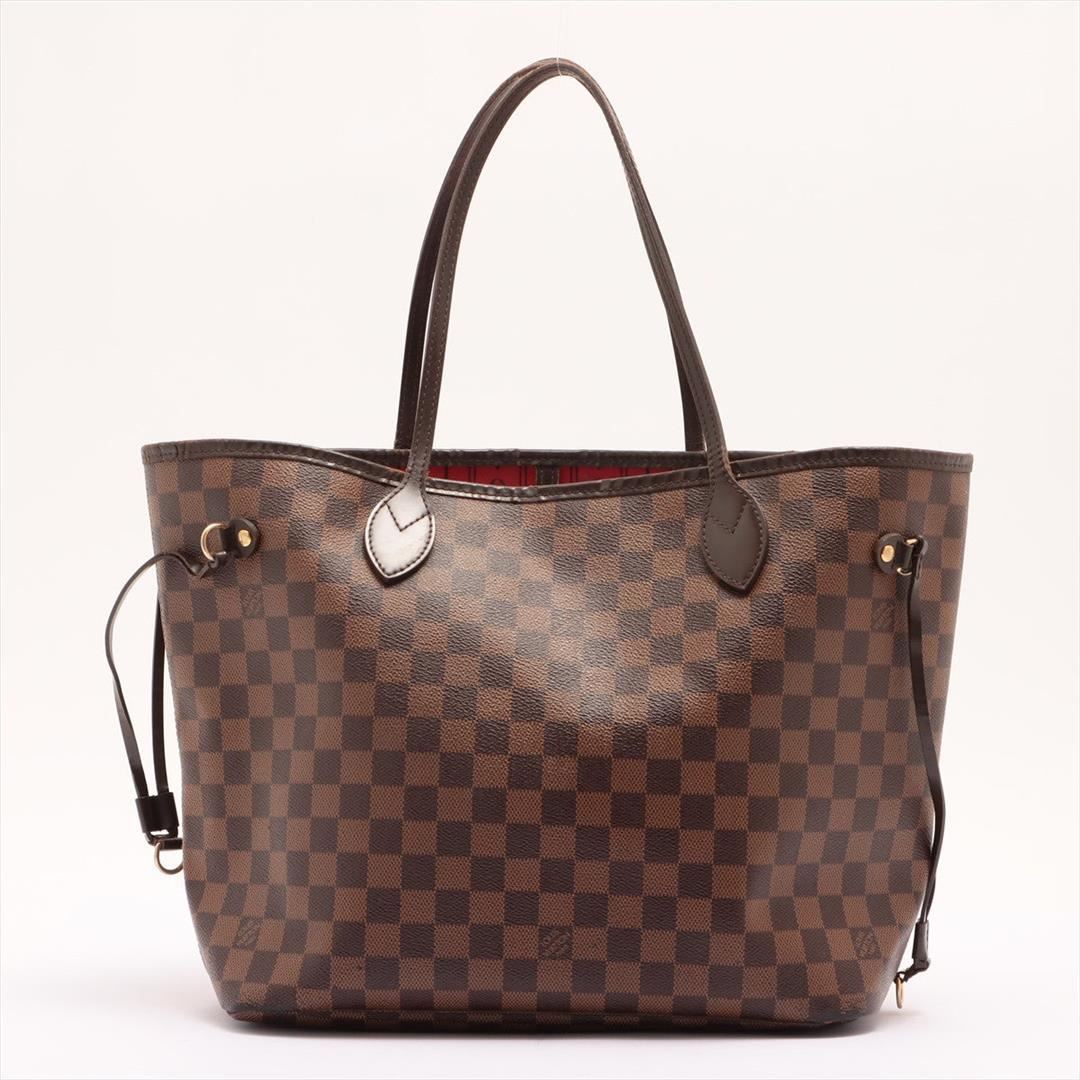 Brown Damier Ebene coated canvas Louis Vuitton Neverfull MM with gold-tone hardware, dark brown leather trim, dual flat shoulder straps, red striped canvas lining, single zip pocket at interior wall, lobster clasp closure at top and drawstring closures at sides. Height 11", Width 12.5", Depth 6.5", Strap Drop 8.5"