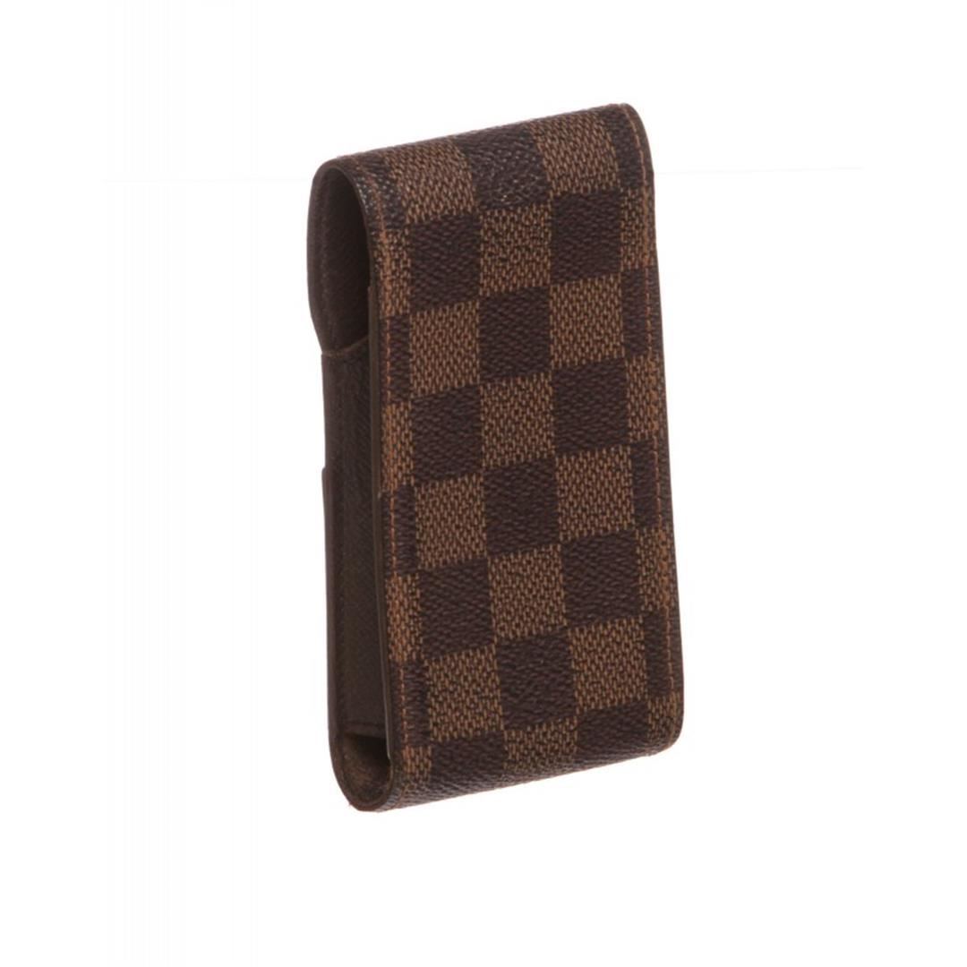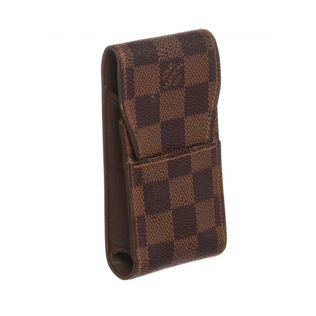 One Louis Vuitton Damier Ebene Canvas Leather Phone Case. This stylish case is finely crafted of classic Louis Vuitton damier toile canvas. The case holds an iPhone or iPhone 4s perfectly with a brown cross grain leather interior. Item is pre-owned.