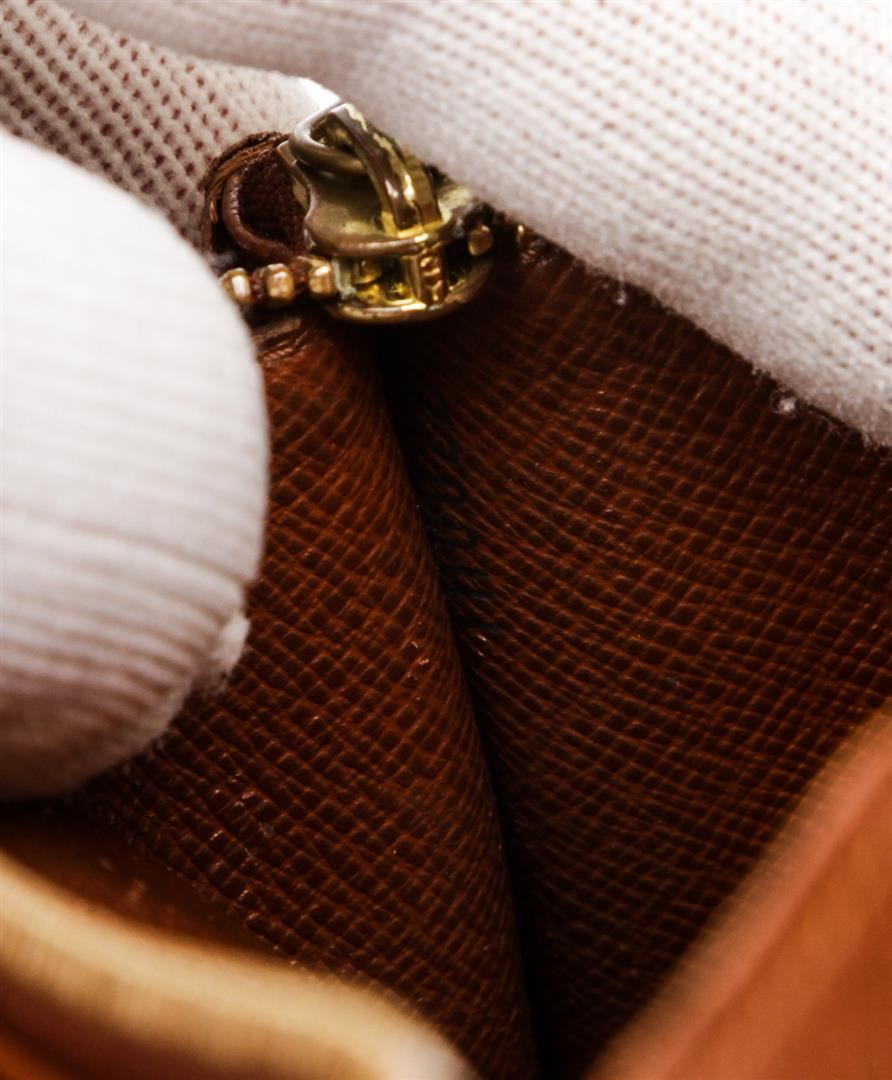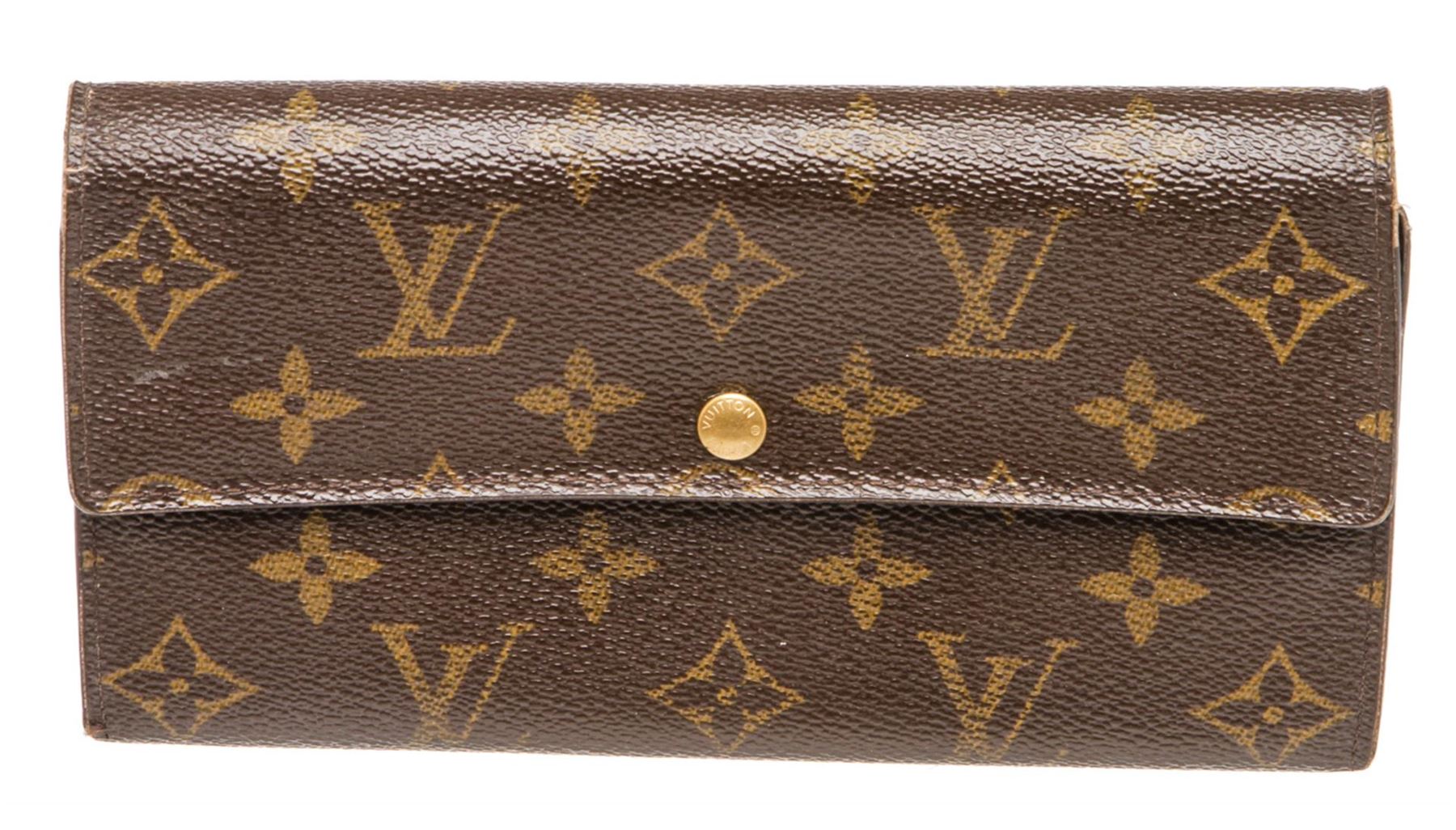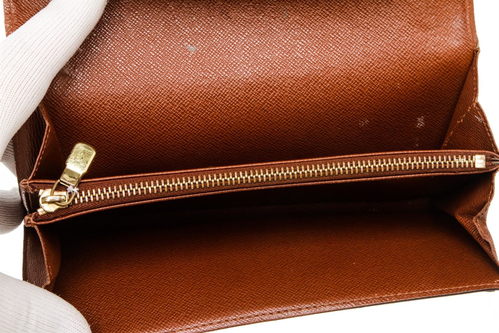 One Louis Vuitton Damier Ebene Canvas Leather Sarah Wallet. Brown and tan Damier Ebene coated canvas Louis Vuitton Sarah wallet with brass hardware, brown Taiga leather lining, dual card slots and dual bill compartments at interior walls, middle zip coin compartment and snap closure at front flap.