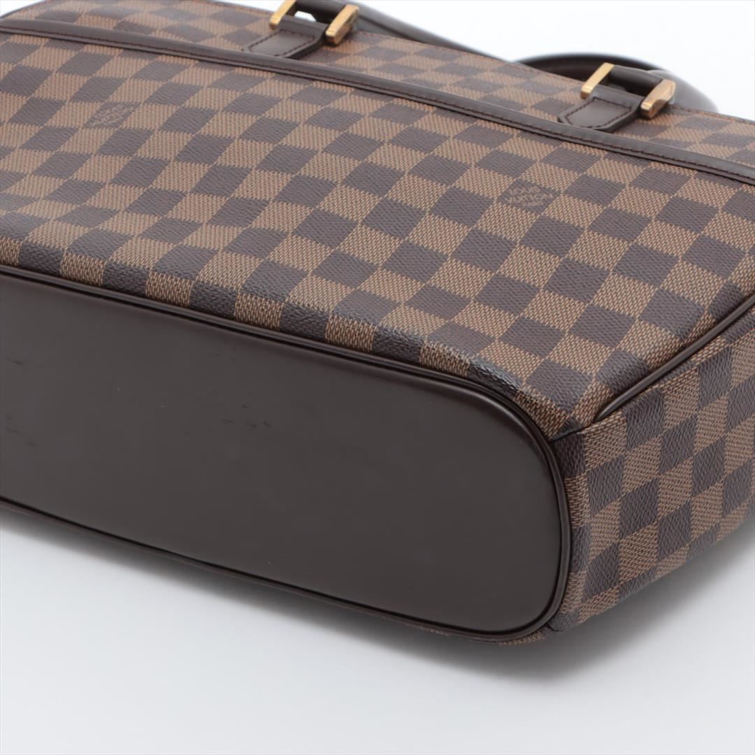 One Louis Vuitton Damier Ebene Canvas Leather Sarria Horizontal Bag. Item is sold AS-IS. All available information is listed in the description and shown in the photo. Brown Damier Ebene coated canvas Louis Vuitton Sarria Horizontal bag with dark brown leather trim, gold-tone hardware, rust red Alcantara microfiber lining, two interior slip pockets, slip pocket on front exterior, dual rolled top handles, and zip top closure. 11.5"x4"x9.5"HD:5"/30cmx10cm24cm