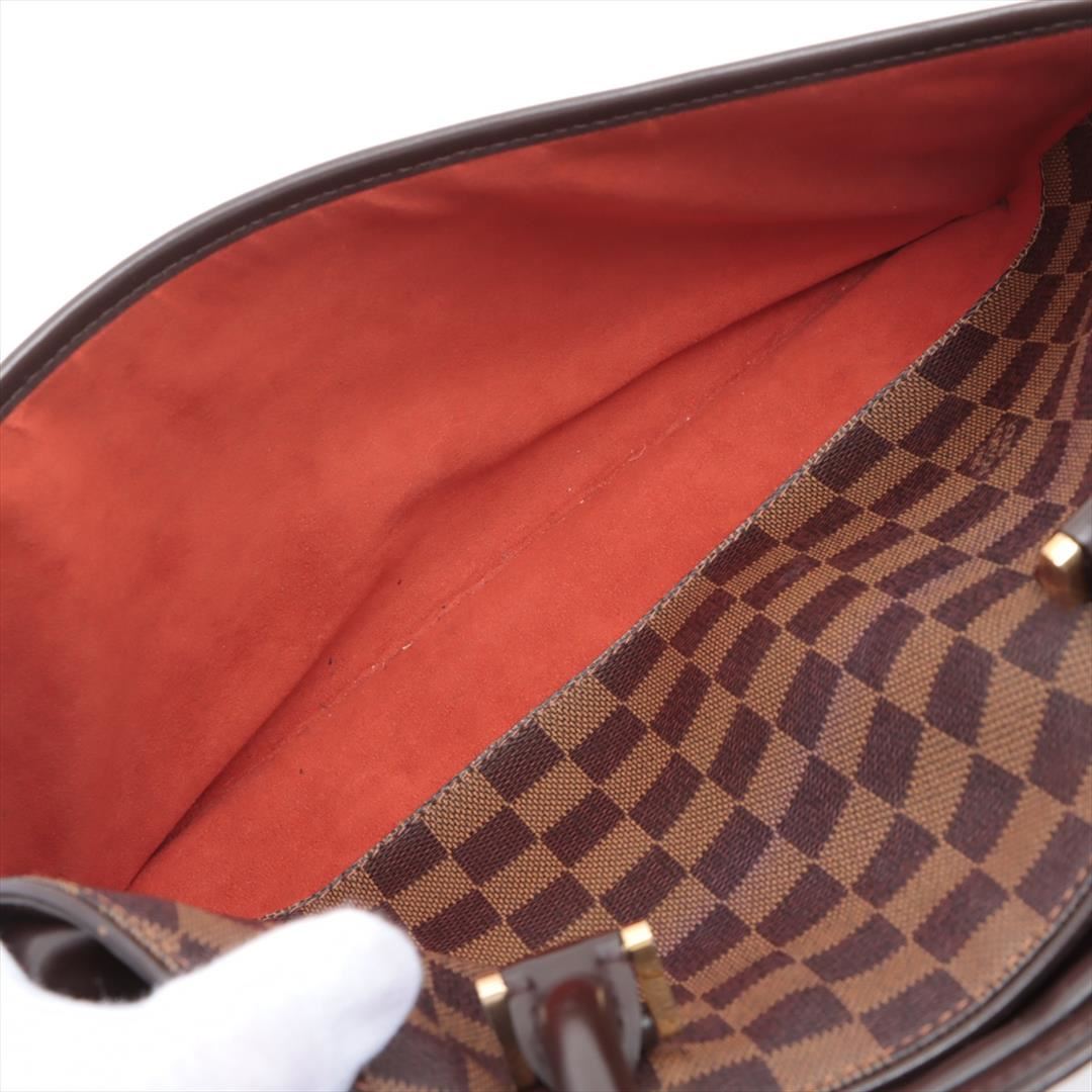 One Louis Vuitton Damier Ebene Canvas Leather Sarria Horizontal Bag. Item is sold AS-IS. All available information is listed in the description and shown in the photo. Brown Damier Ebene coated canvas Louis Vuitton Sarria Horizontal bag with dark brown leather trim, gold-tone hardware, rust red Alcantara microfiber lining, two interior slip pockets, slip pocket on front exterior, dual rolled top handles, and zip top closure. 11.5"x4"x9.5"HD:5"/30cmx10cm24cm