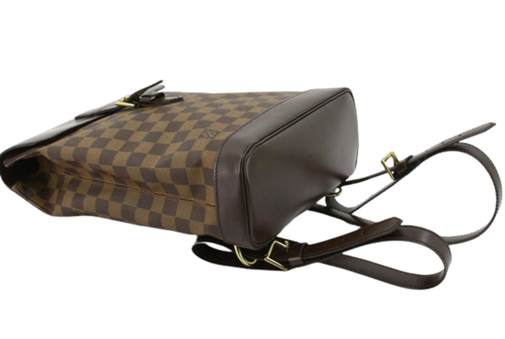 Louis Vuitton Damier Ebene Canvas Leather Soho Backpack. All available information is listed in the description and shown in the photos. Brown Damier Ebene coated canvas Louis Vuitton Soho backpack with gold-tone hardware, dark brown Vachetta leather trim, interior slip pockets, dual brown leather shoulder straps, one rolled top handle and flap closure on top with magnetic snap and buckle detail. 11.5" L x 4" W x 9.75" H