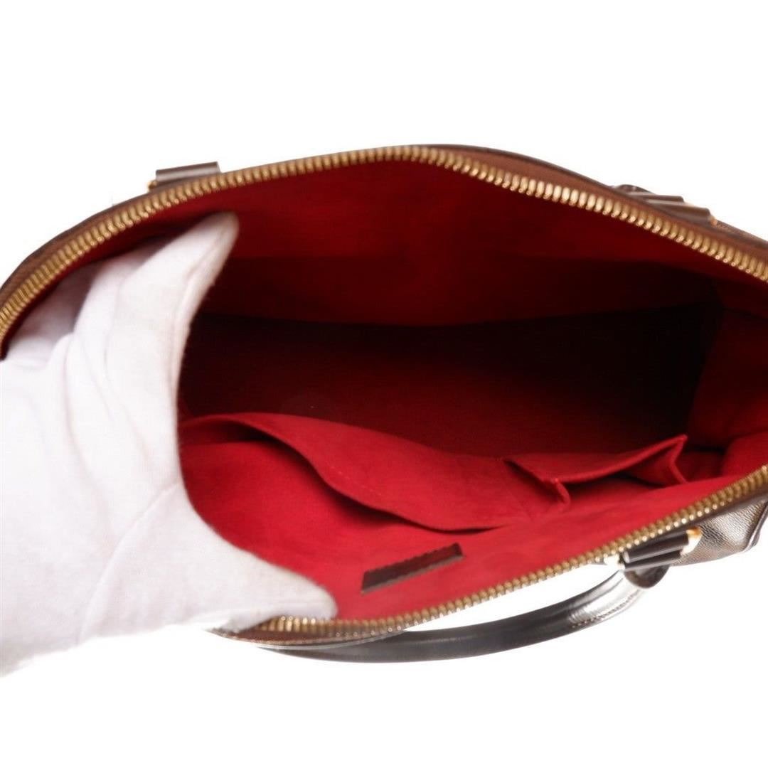 Brown and tan Damier Ebene coated canvas Louis Vuitton Trevi GM with gold-tone hardware, leather accents, dual rolled top handles, red Alcantara lining, dual open pockets at interior walls and zip closure at top.