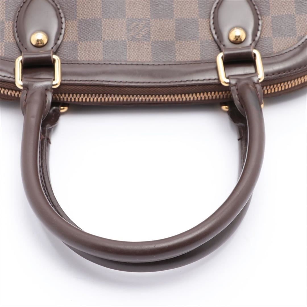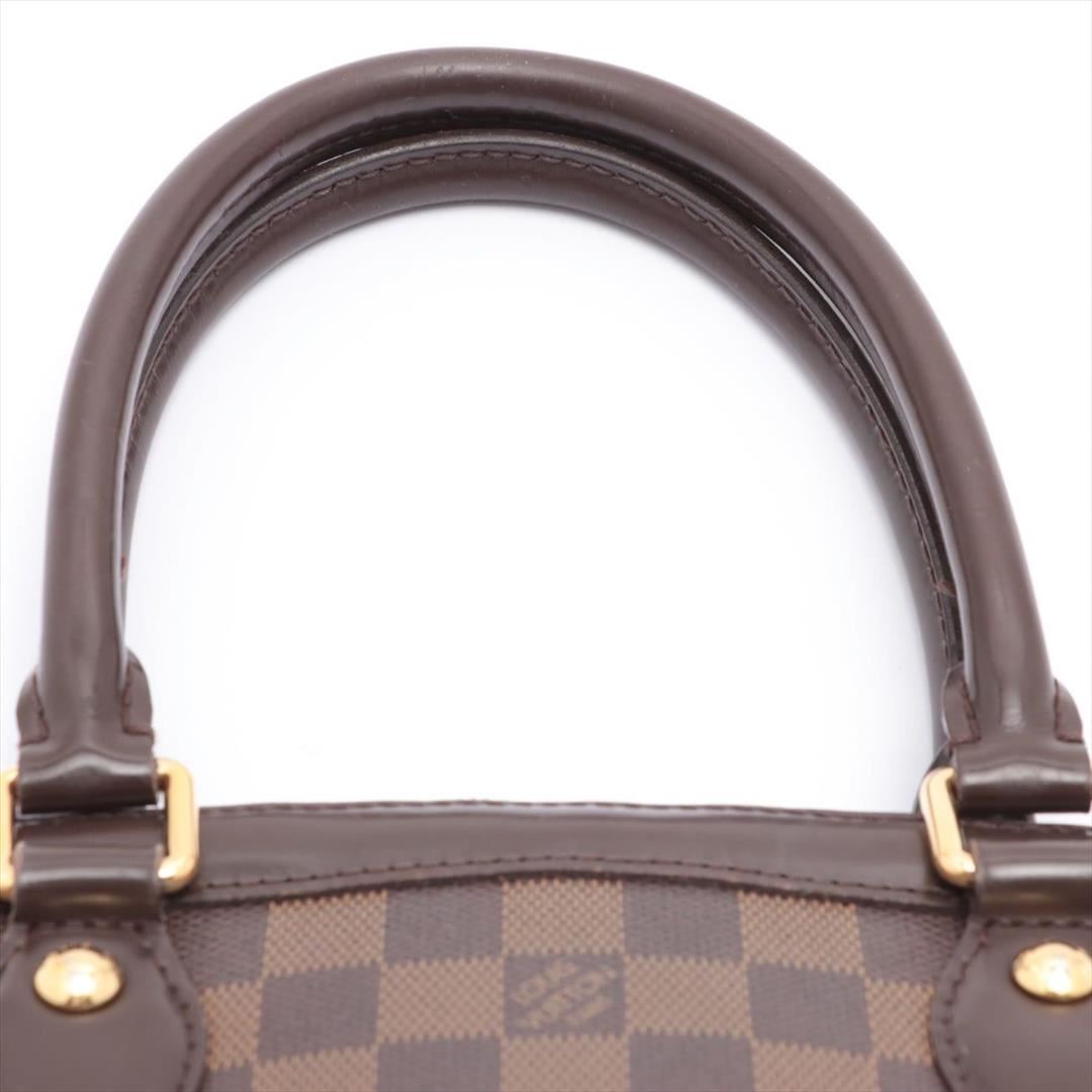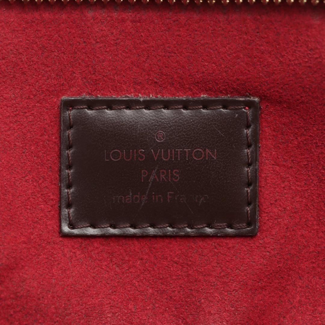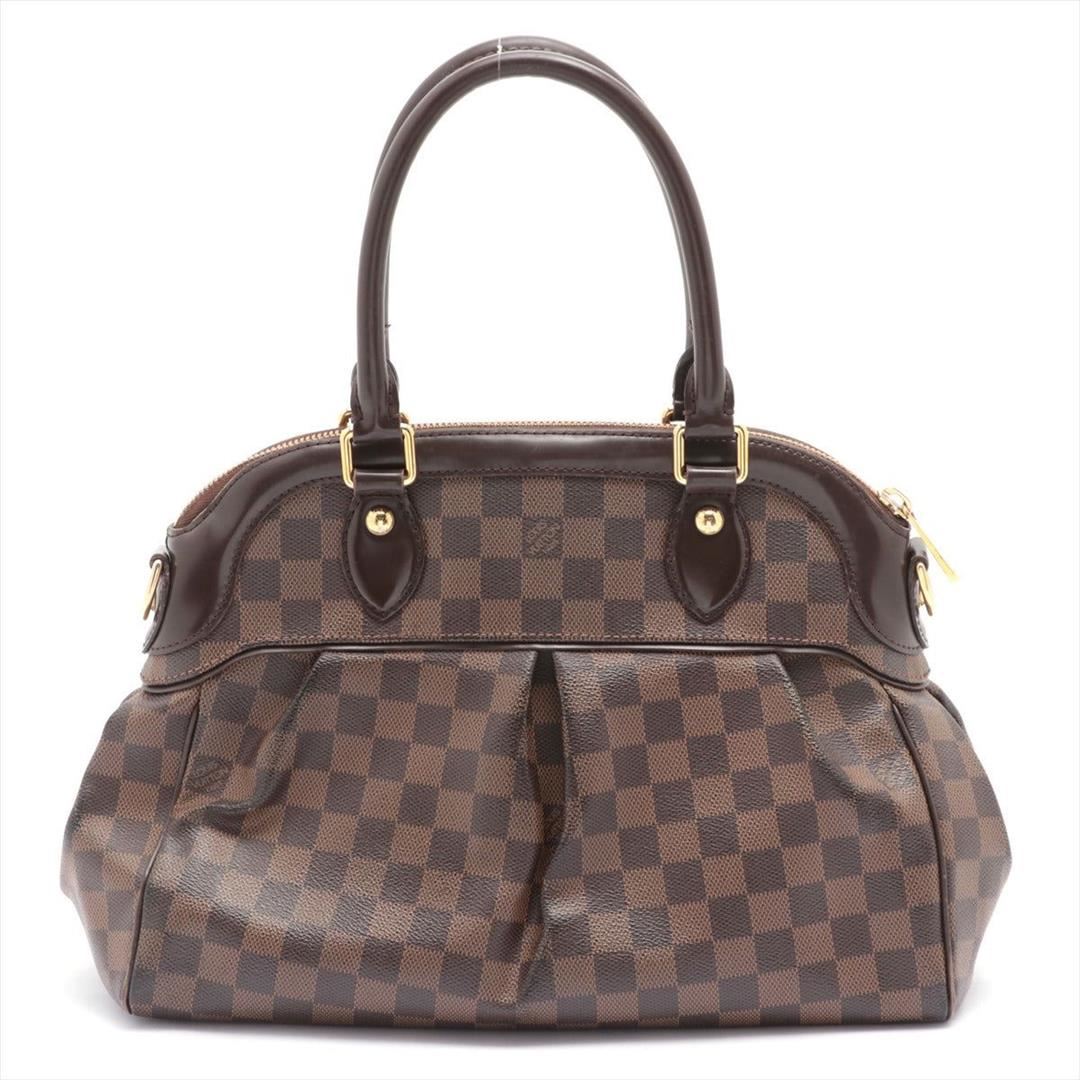 Brown and tobacco Damier Ebene coated canvas Louis Vuitton Trevi PM with brass hardware, mocha leather trim, optional shoulder strap, dual rolled handles, red Alcantara lining, dual slit pockets at interior walls and zip closure and zip closure at top.