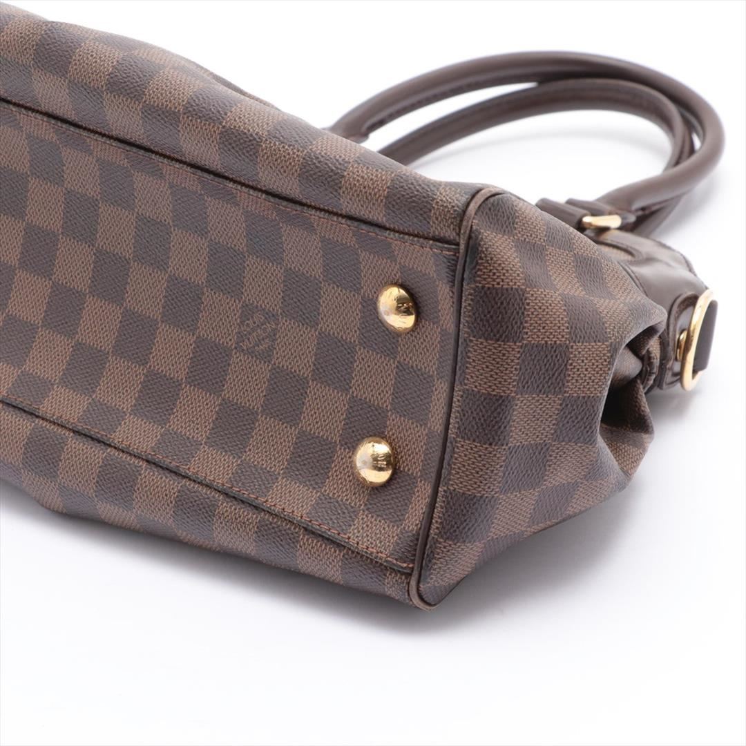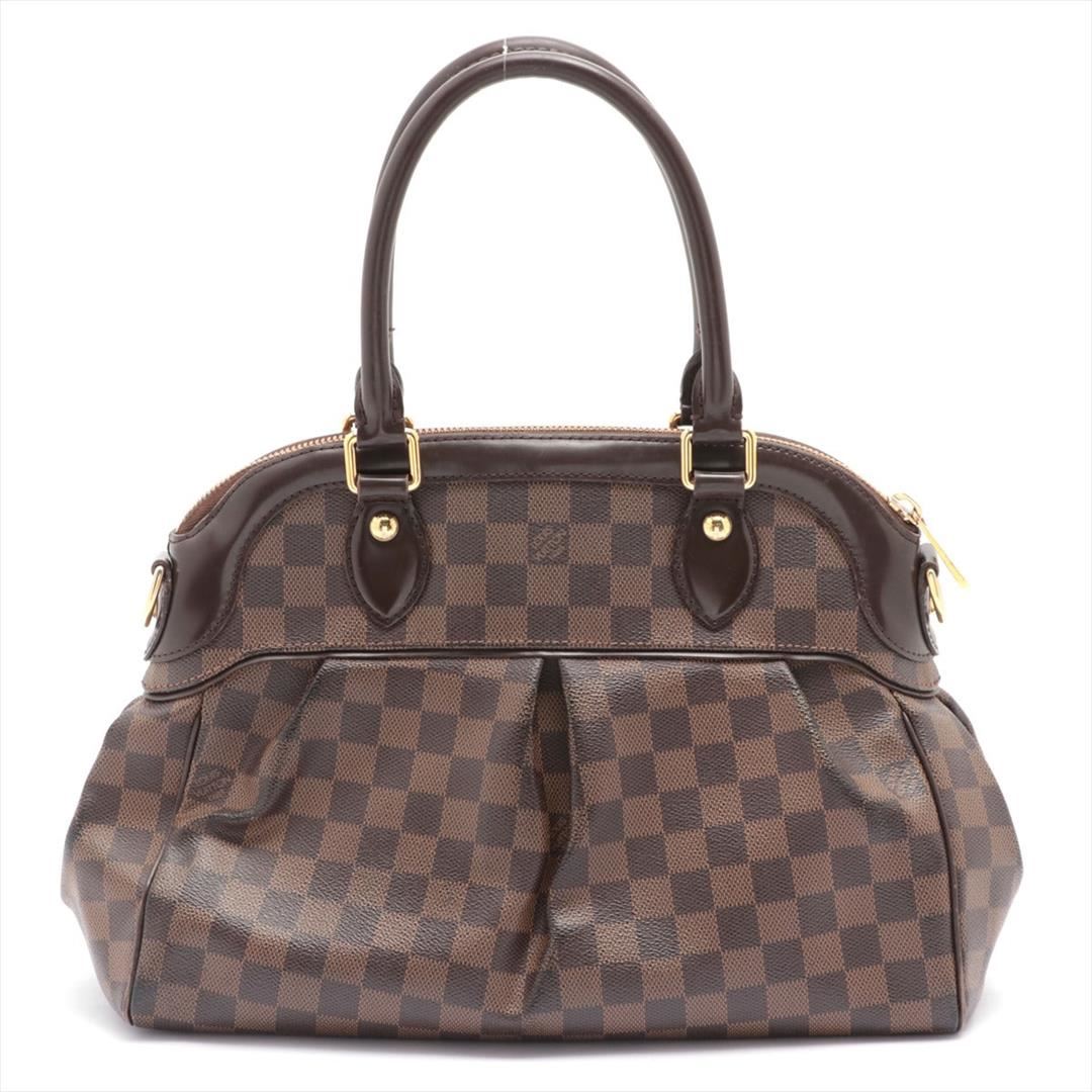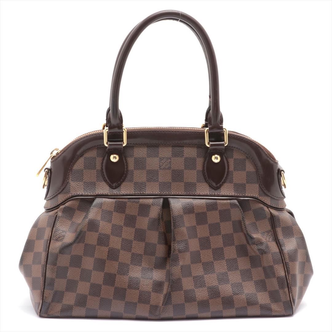 Brown and tobacco Damier Ebene coated canvas Louis Vuitton Trevi PM with brass hardware, mocha leather trim, optional shoulder strap, dual rolled handles, red Alcantara lining, dual slit pockets at interior walls and zip closure and zip closure at top. Shop AUTHENTIC Louis Vuitton handbags at MARQUE. 13.5"x5.5"x10.25"xBag Drop:9"/34.2cmx13.9cmx25cmxBag Drop:22.8cm