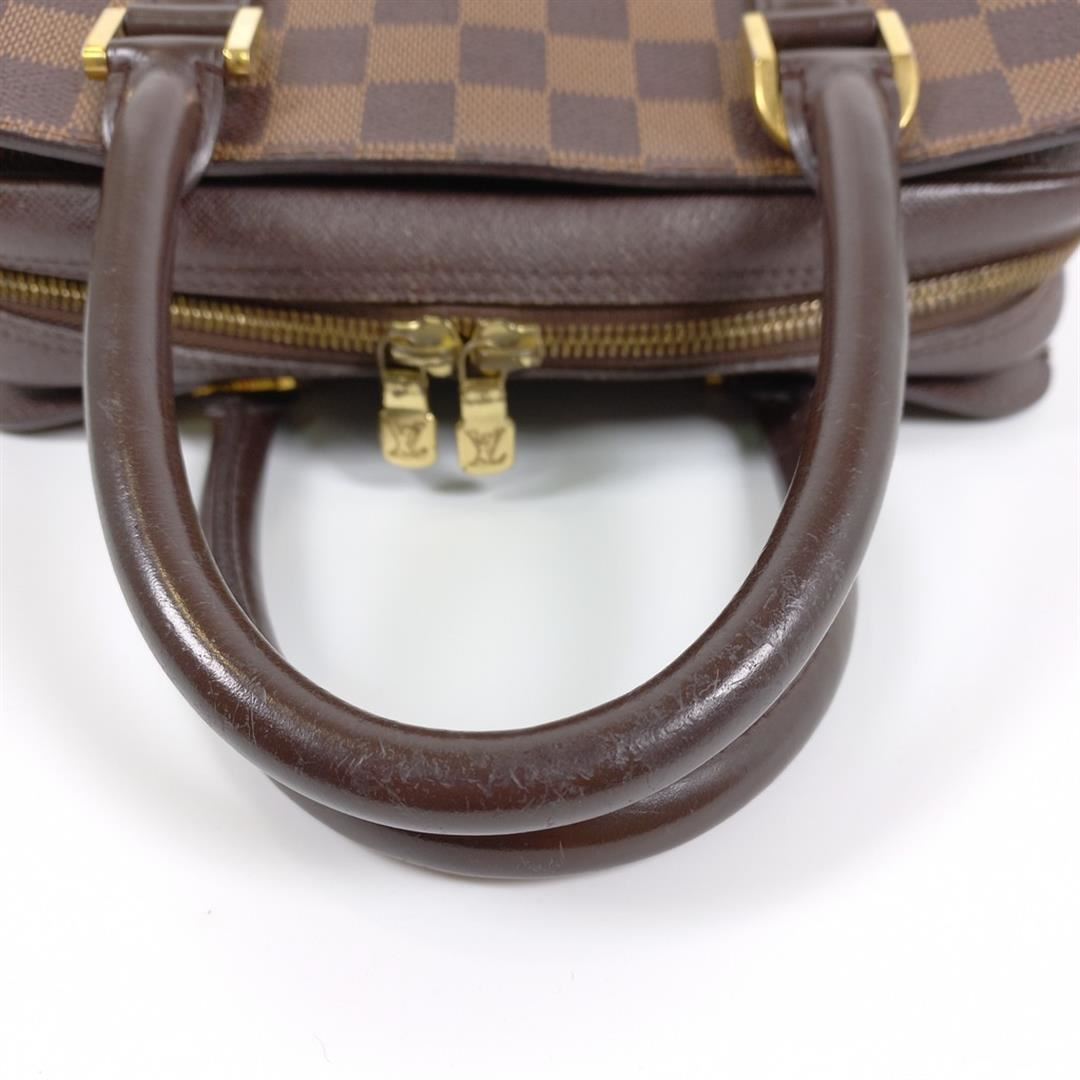 Brown Damier Ebene coated canvas Louis Vuitton Triana Handbag with gold-tone hardware, mocha leather trim, dual rolled handles, dual slit pockets at exterior, orange Alcantara lining, single zipped pocket at interior wall and zip closure at top. 10.5"x
