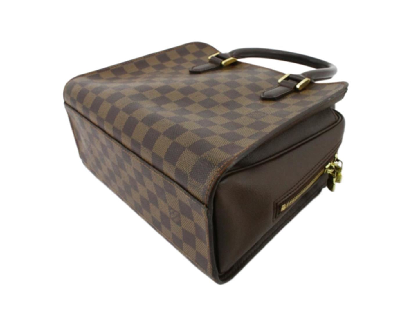 One Louis Vuitton Damier Ebene Canvas Leather Triana Handbag. Item is sold AS-IS. All available information is listed in the description and shown in the photo. Brown Damier Ebene coated canvas Louis Vuitton Triana Handbag with gold-tone hardware, mocha leather trim, dual rolled handles, dual slit pockets at exterior, orange Alcantara lining, single zipped pocket at interior wall and zip closure at top. 10.5"x3.5"x9.5"xBag Drop:5"/26.6cmx8.8cmx24.1cmxBag Drop:12.7cm