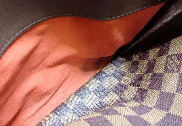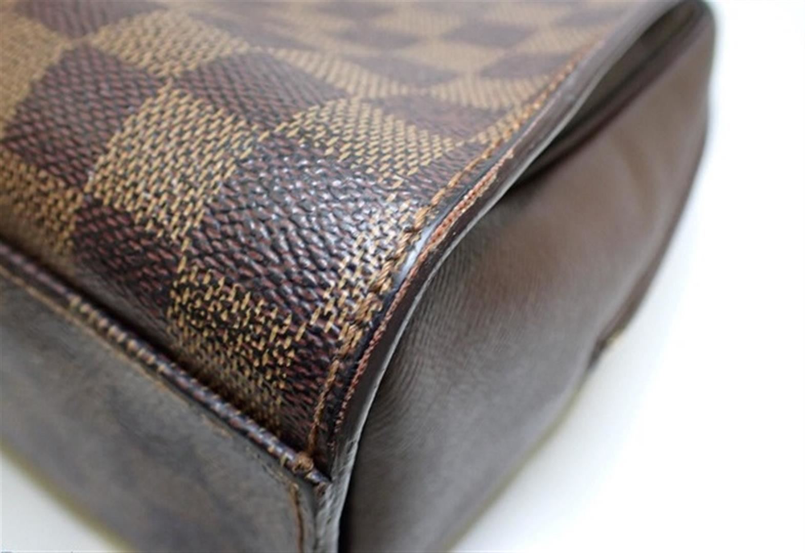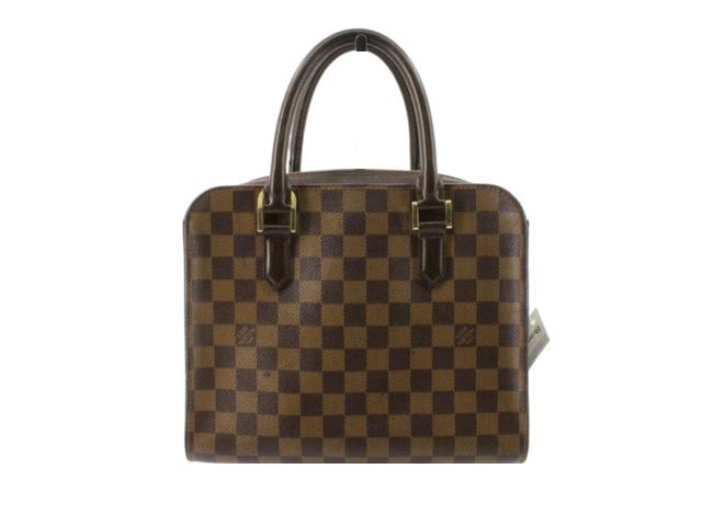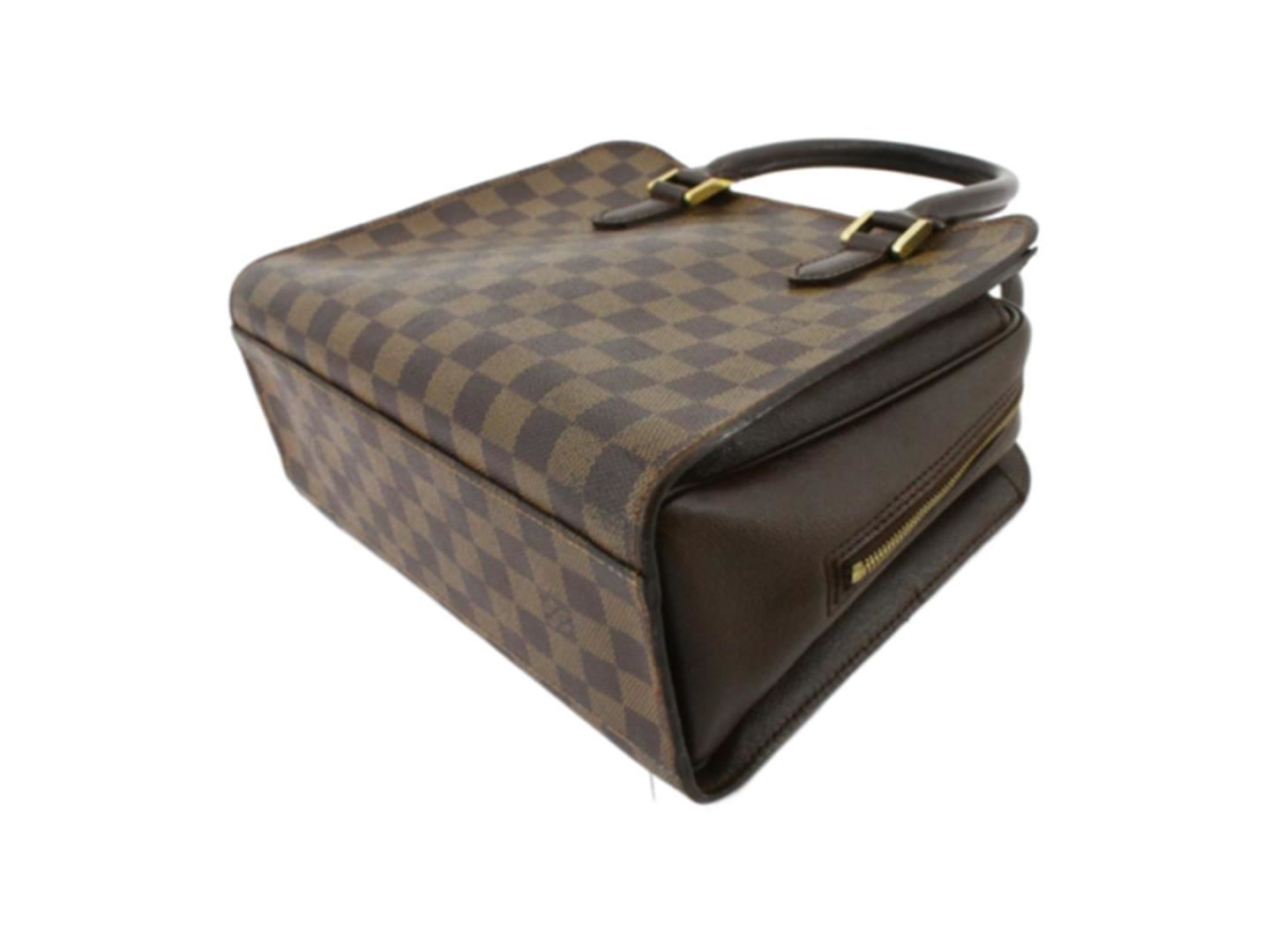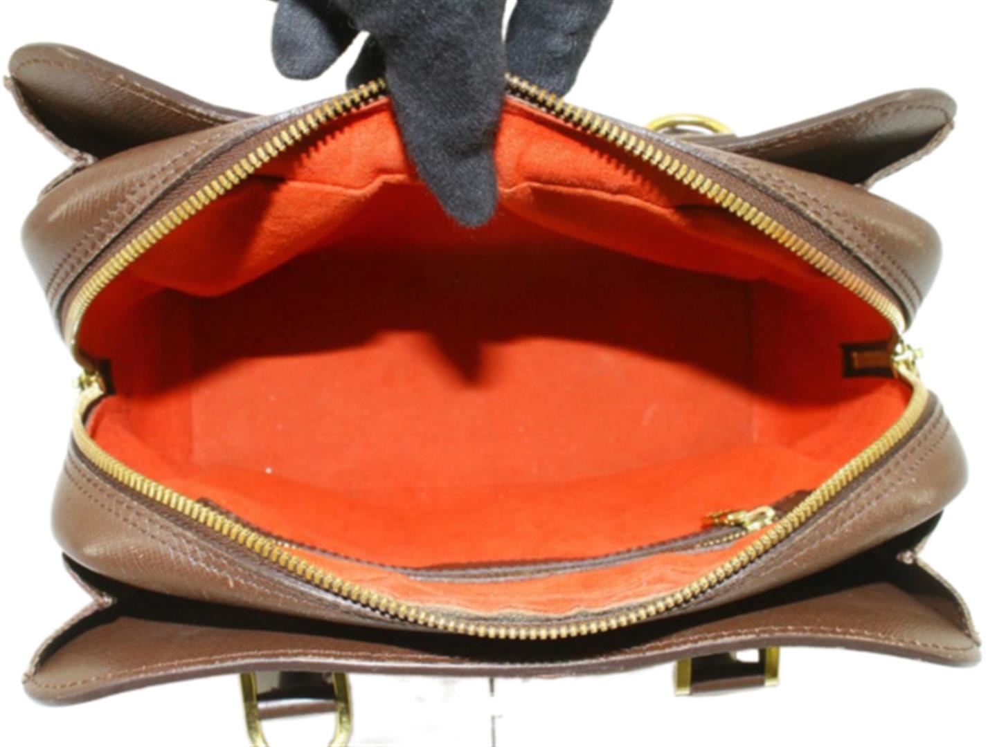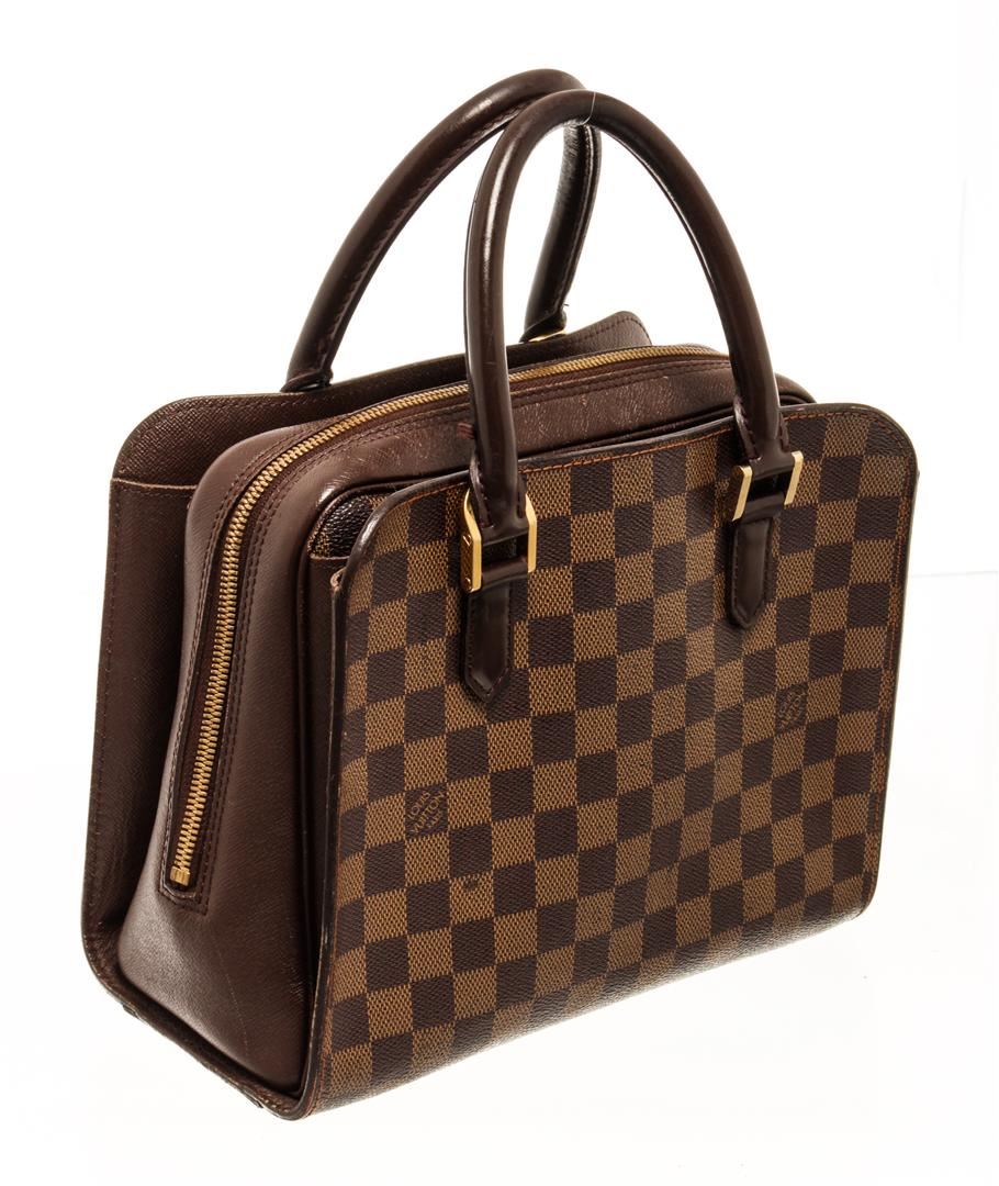 One Louis Vuitton Damier Ebene Canvas Leather Triana Handbag. Item is sold AS-IS. All available information is listed in the description and shown in the photo. Brown Damier Ebene coated canvas Louis Vuitton Triana Handbag with gold-tone hardware, mocha leather trim, dual rolled handles, dual slit pockets at exterior, orange Alcantara lining, single zipped pocket at interior wall and zip closure at top. 10.5"x3.5"x9.5"xBag Drop:5"/26.6cmx8.8cmx24.1cmxBag Drop:12.7cm