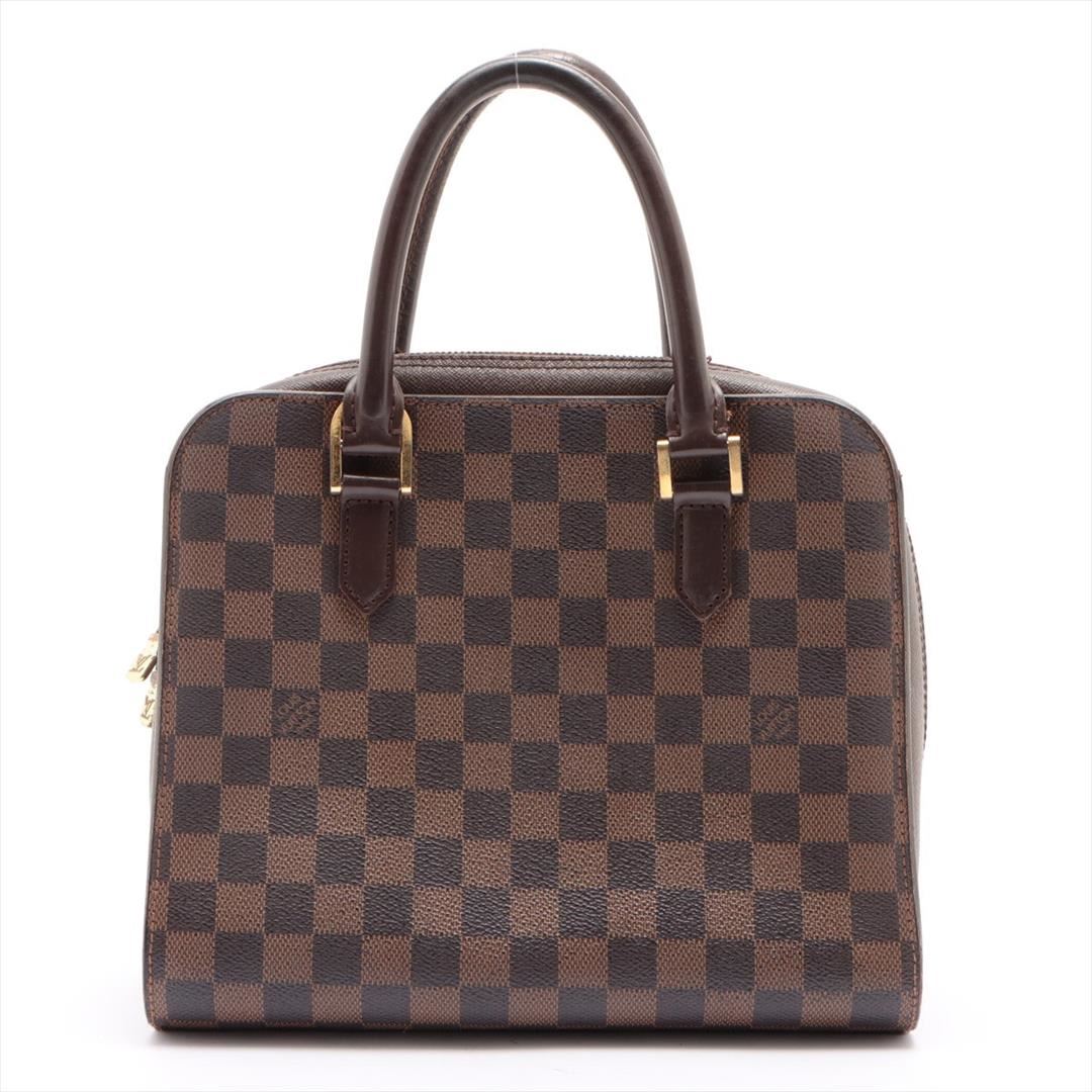 One Louis Vuitton Damier Ebene Canvas Leather Triana Handbag. Item is sold AS-IS. All available information is listed in the description and shown in the photo. Brown Damier Ebene coated canvas Louis Vuitton Triana Handbag with gold-tone hardware, mocha leather trim, dual rolled handles, dual slit pockets at exterior, orange Alcantara lining, single zipped pocket at interior wall and zip closure at top. 10.5"x3.5"x9.5"xBag Drop:5"/26.6cmx8.8cmx24.1cmxBag Drop:12.7cm